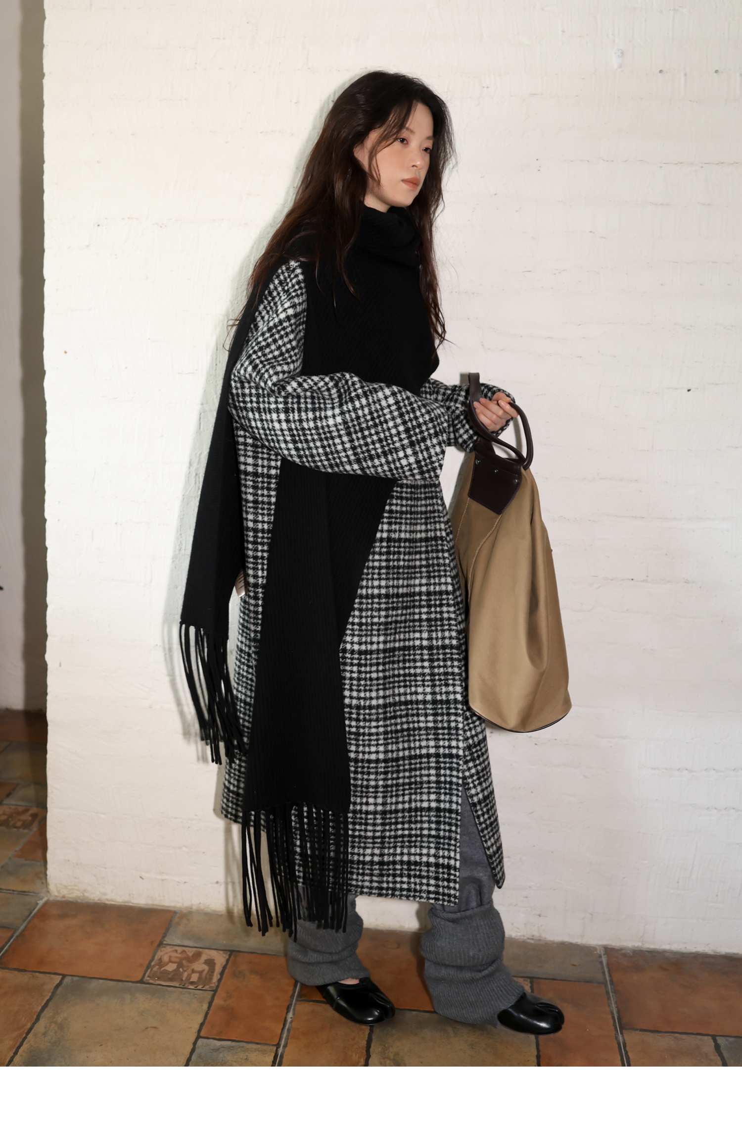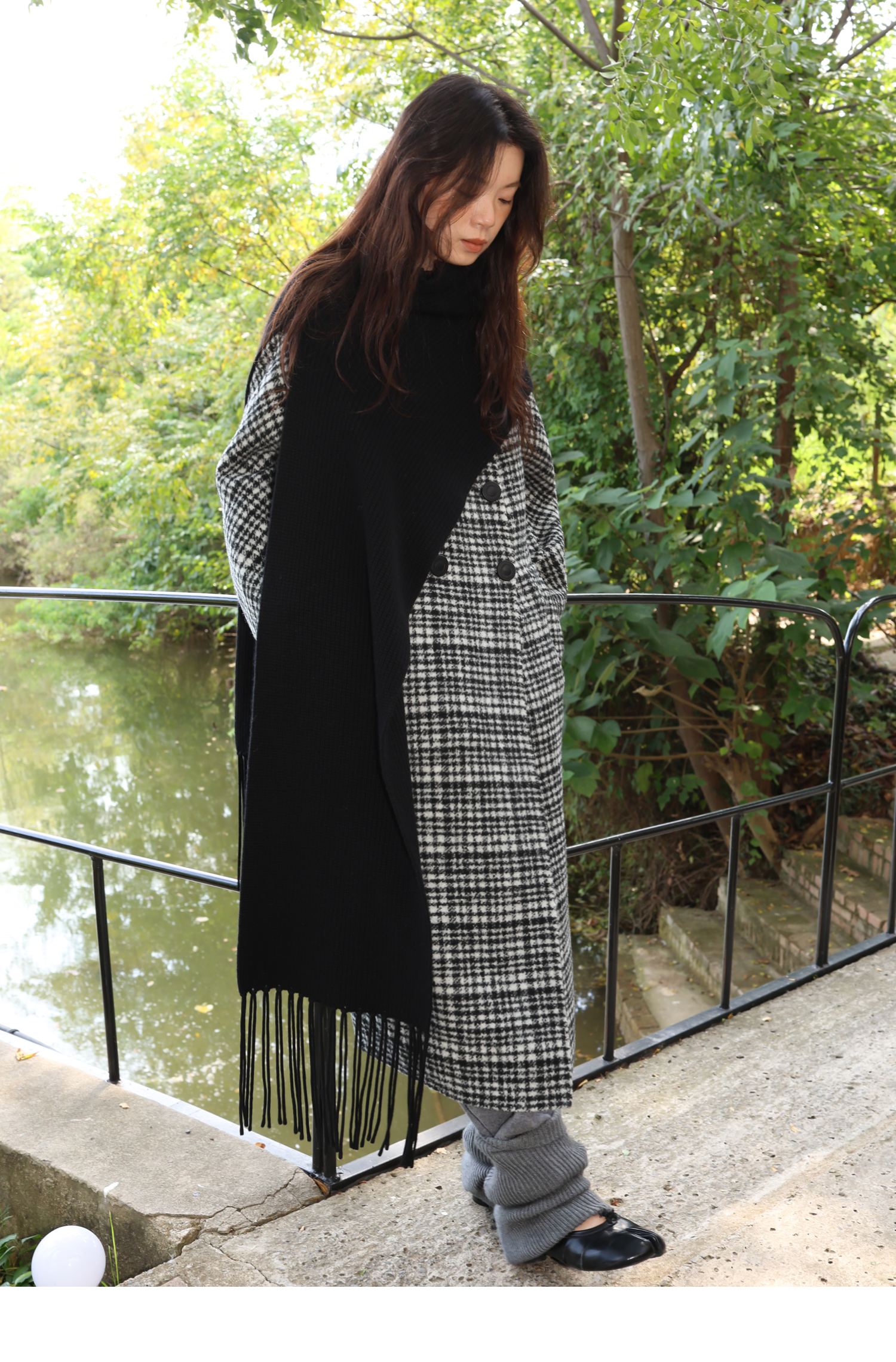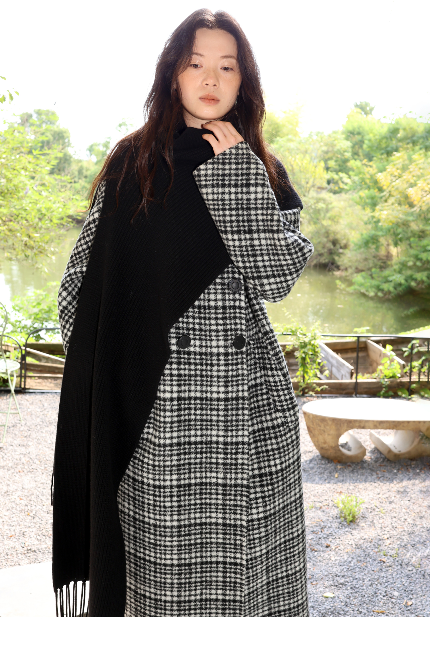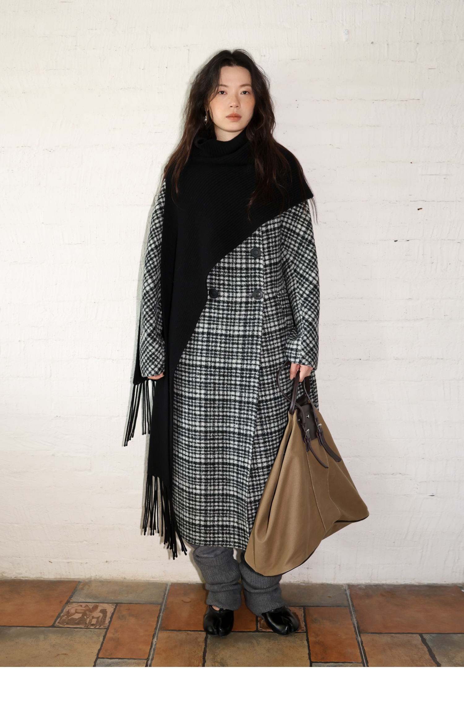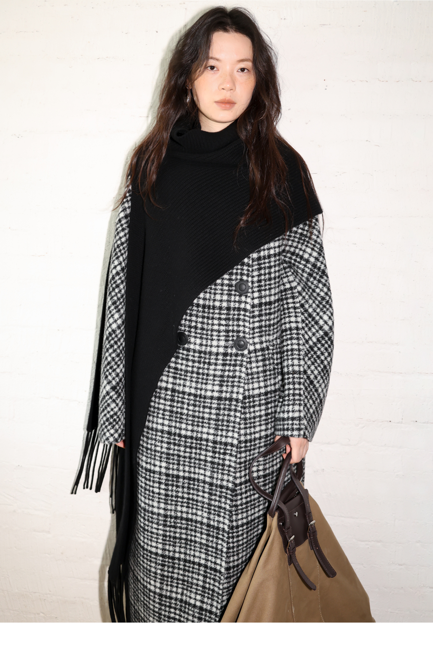 素舶 绵羊毛格纹圆领茧型流苏针织围巾长款双面呢大衣