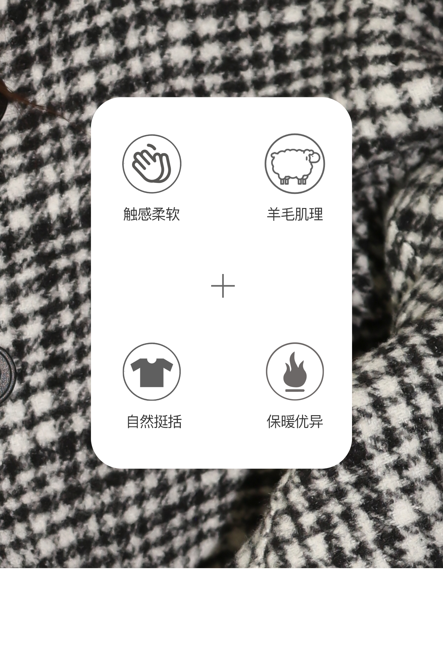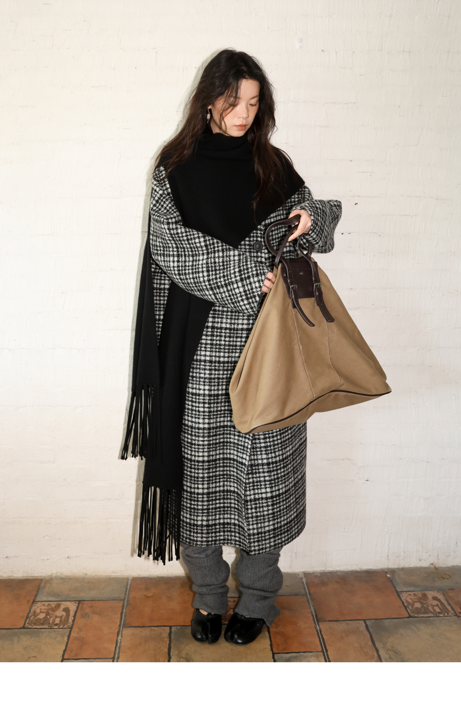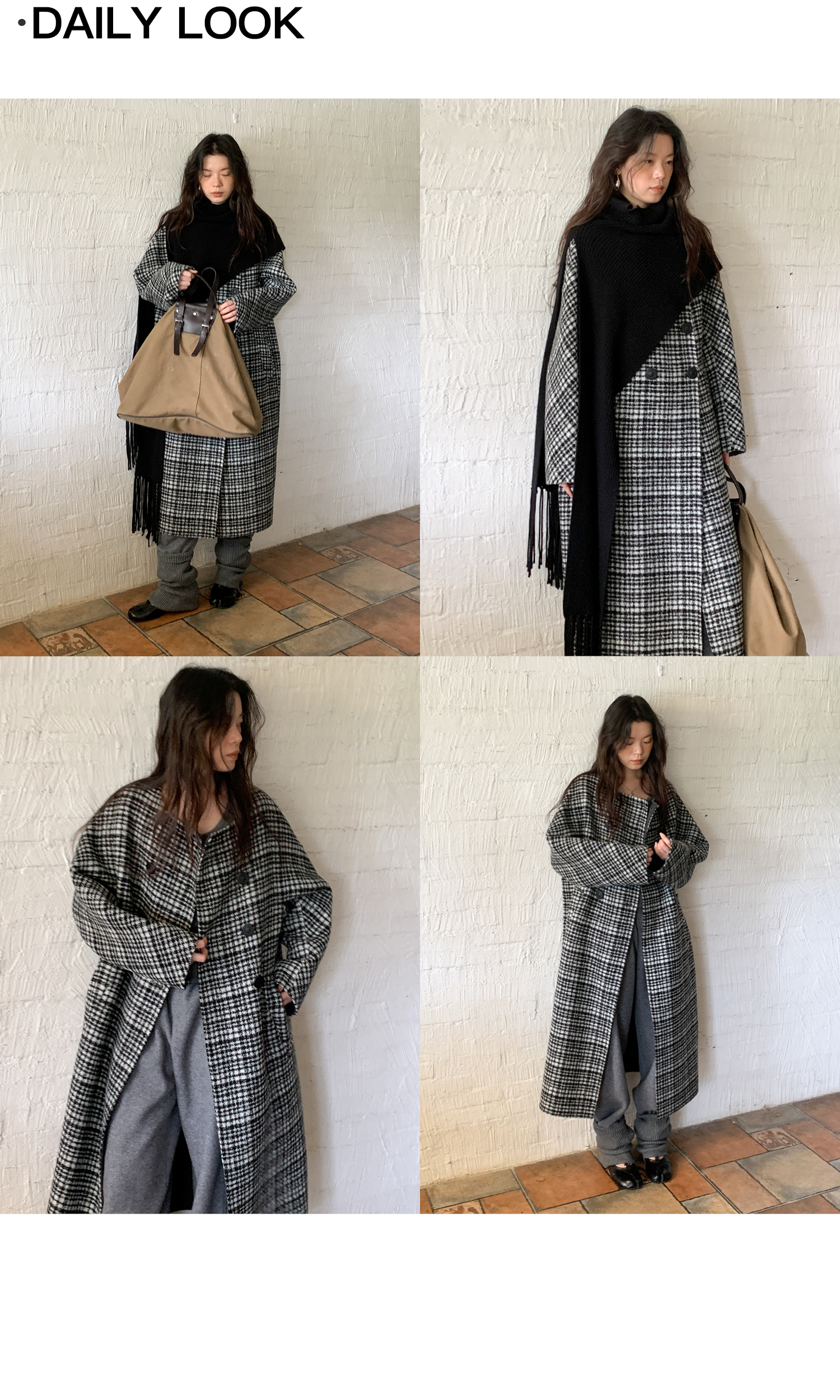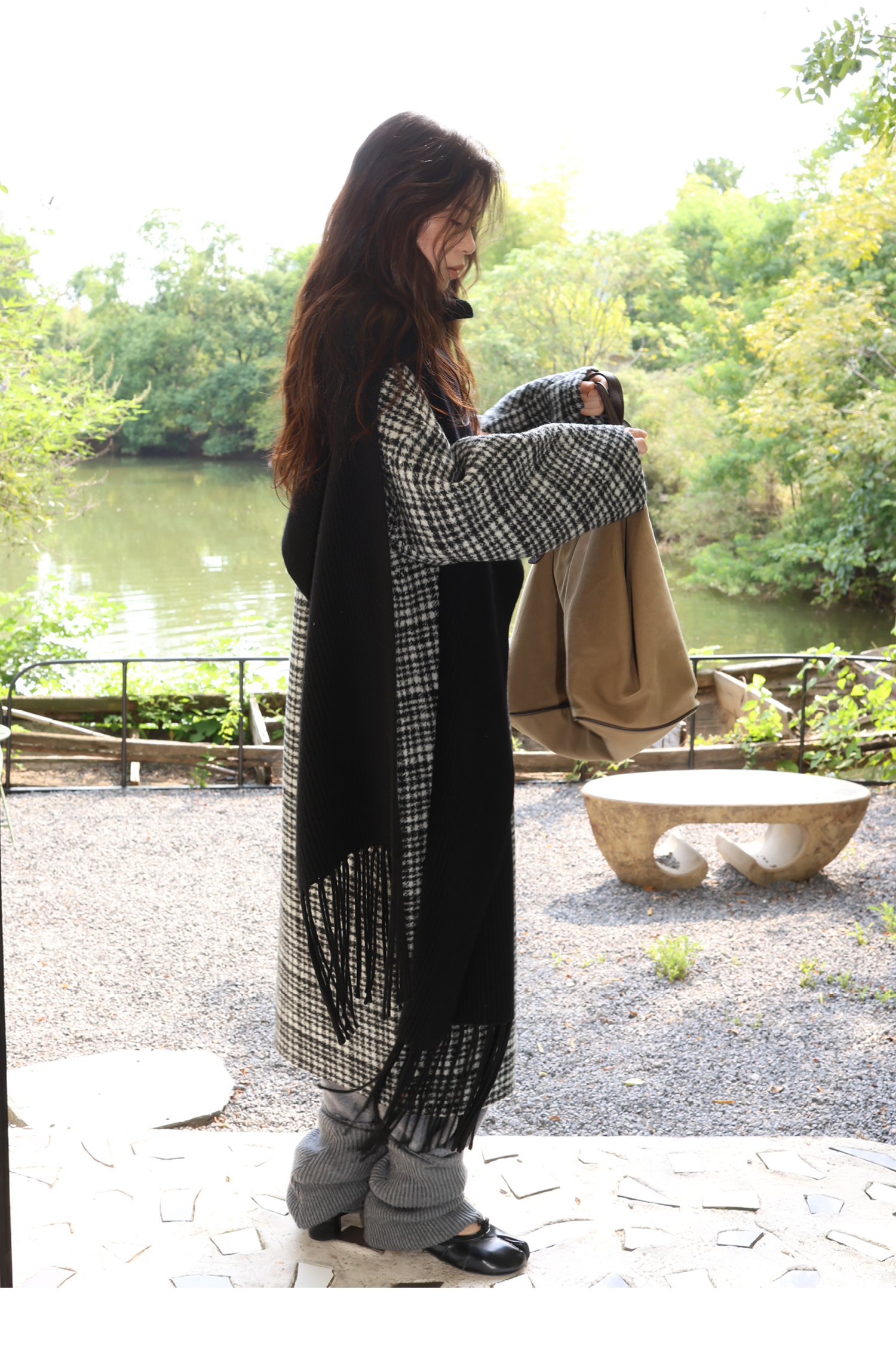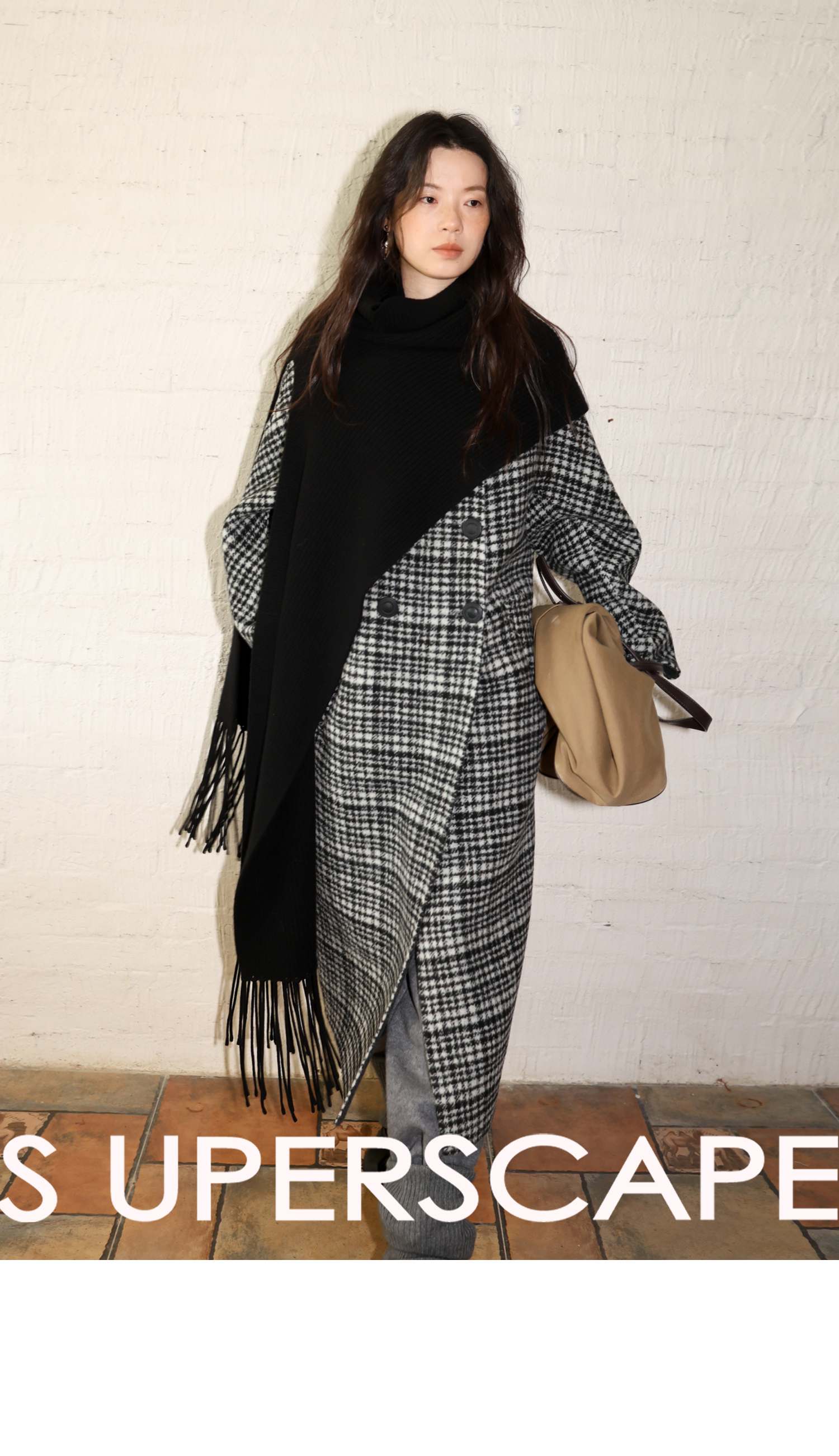 素舶 绵羊毛格纹圆领茧型流苏针织围巾长款双面呢大衣