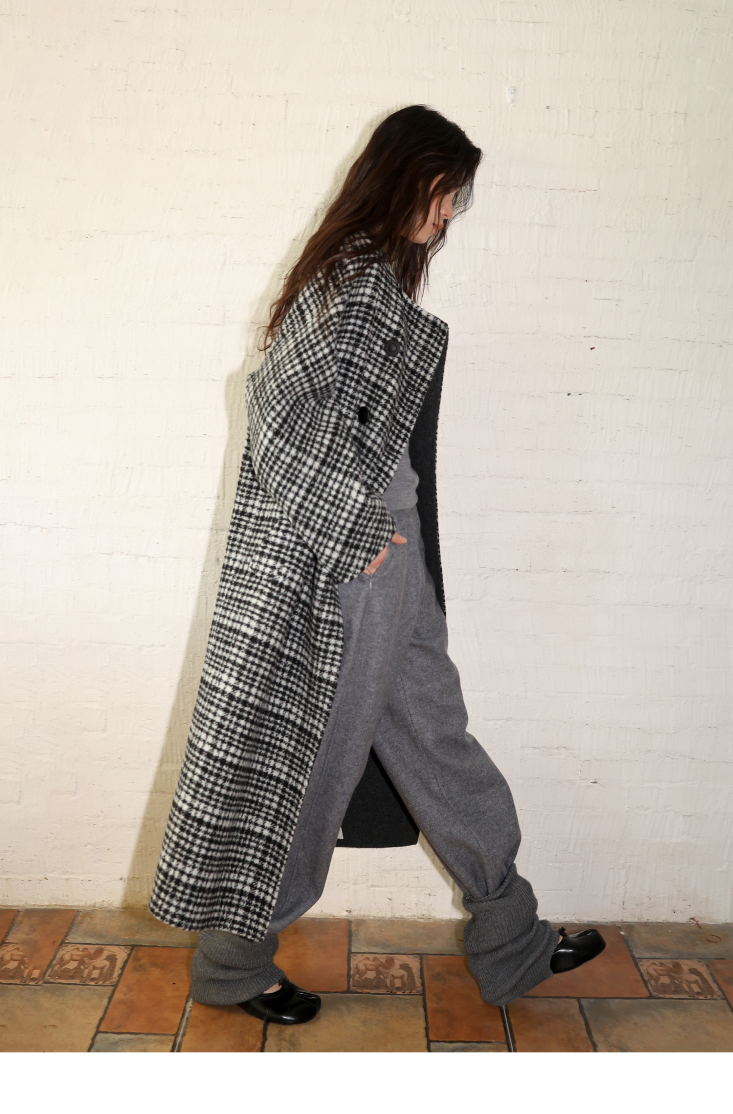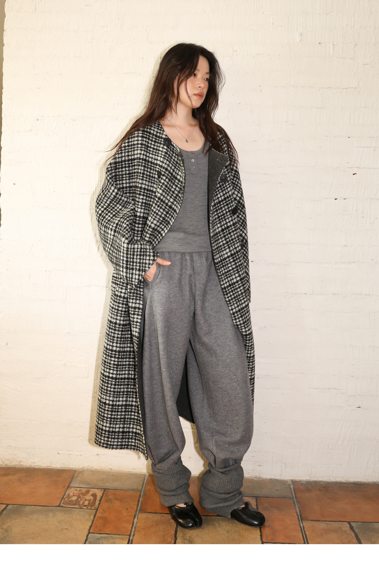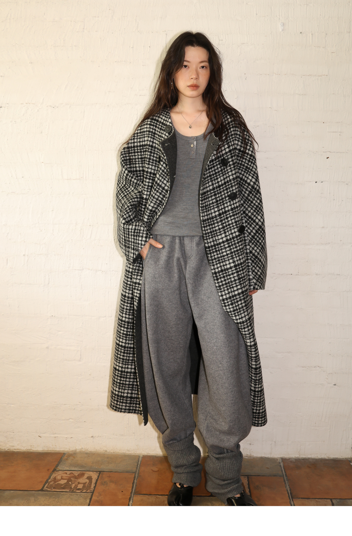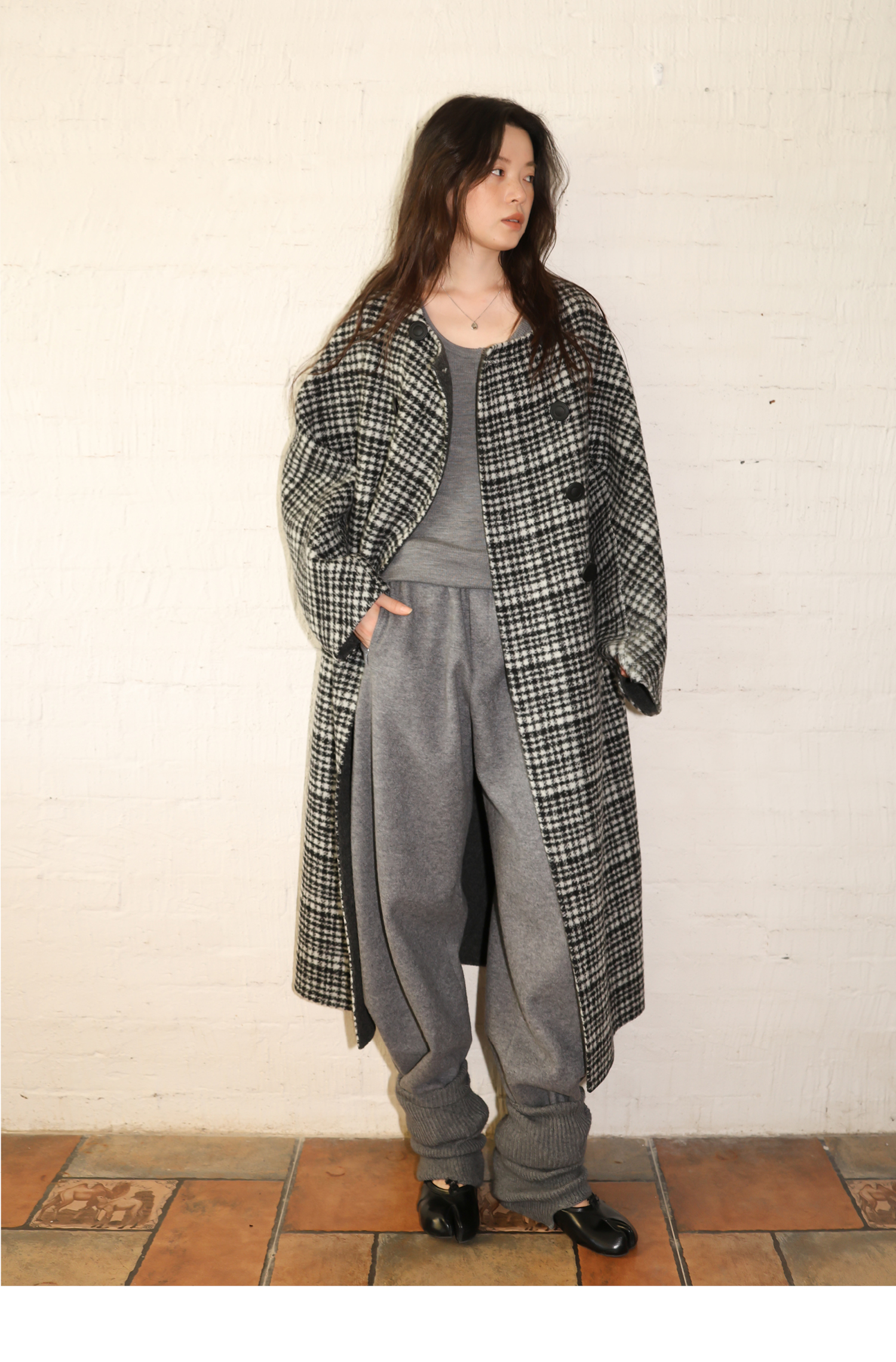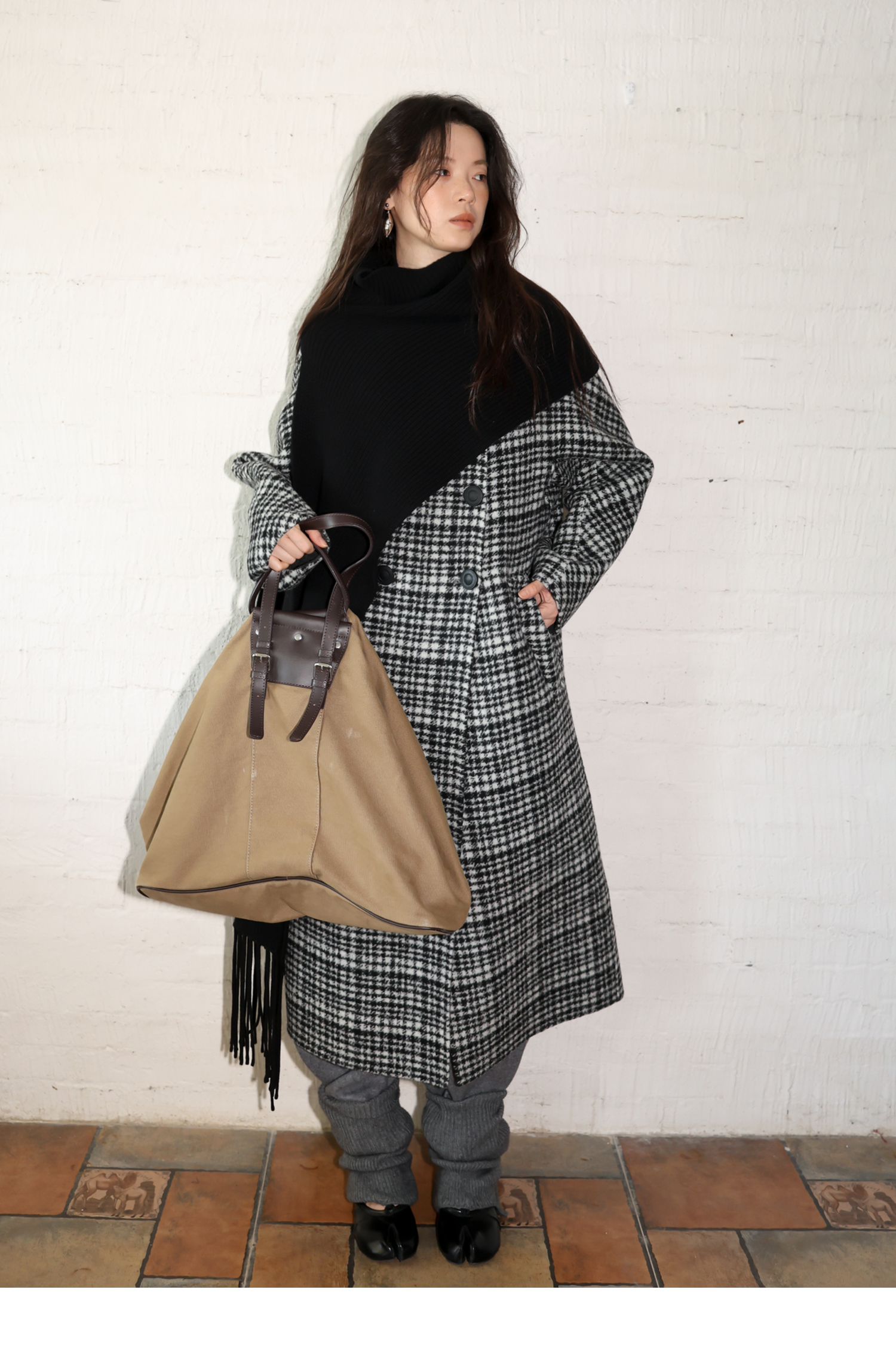 素舶 绵羊毛格纹圆领茧型流苏针织围巾长款双面呢大衣