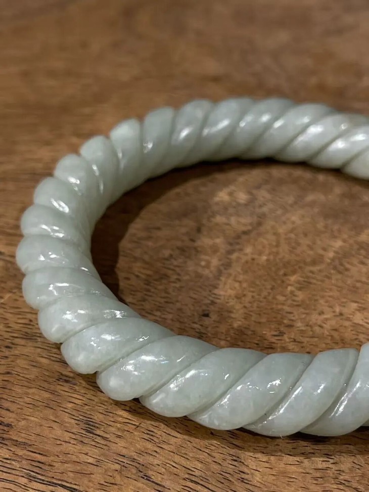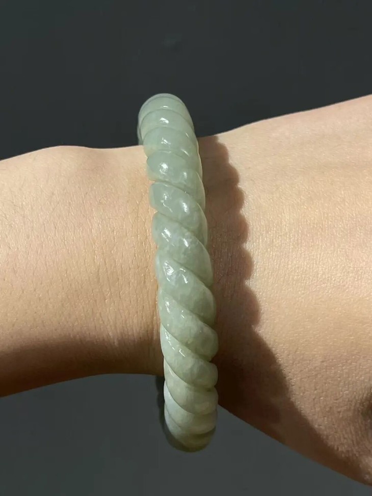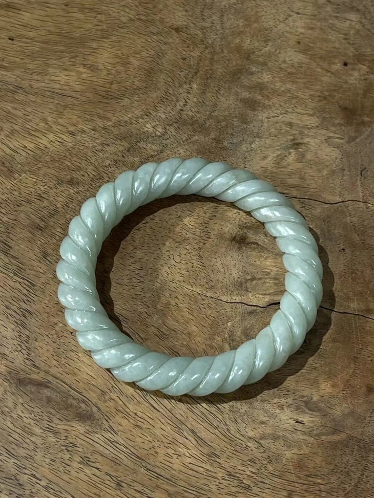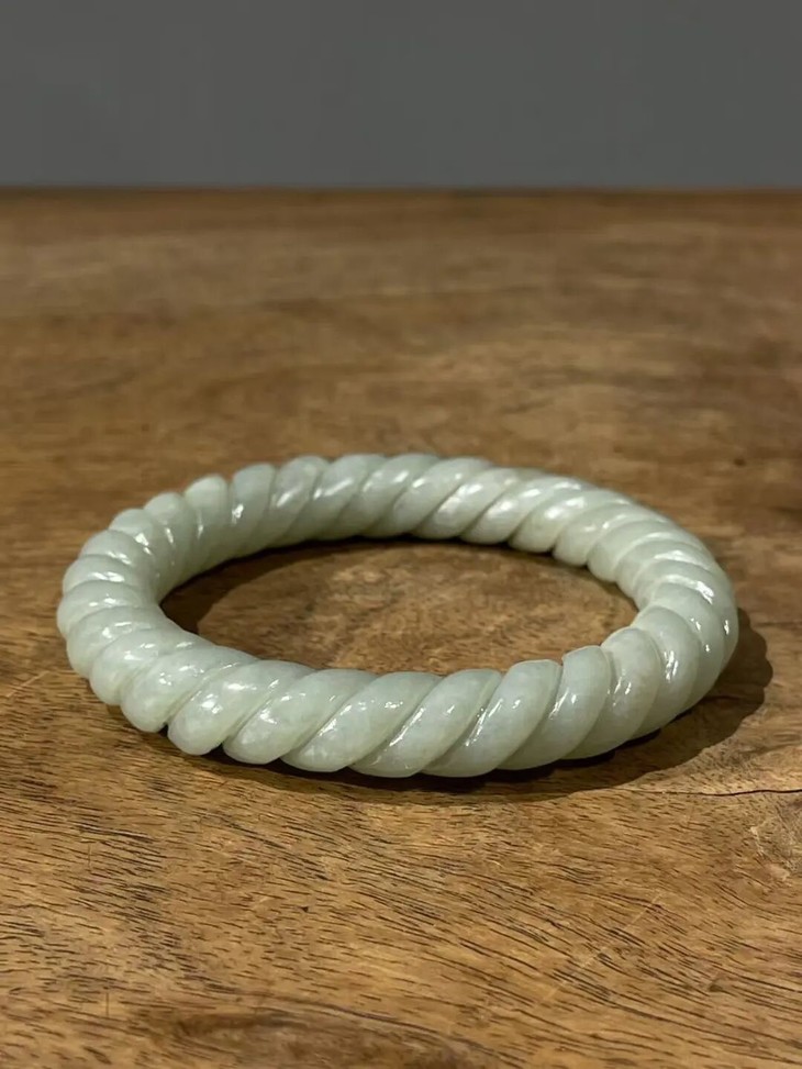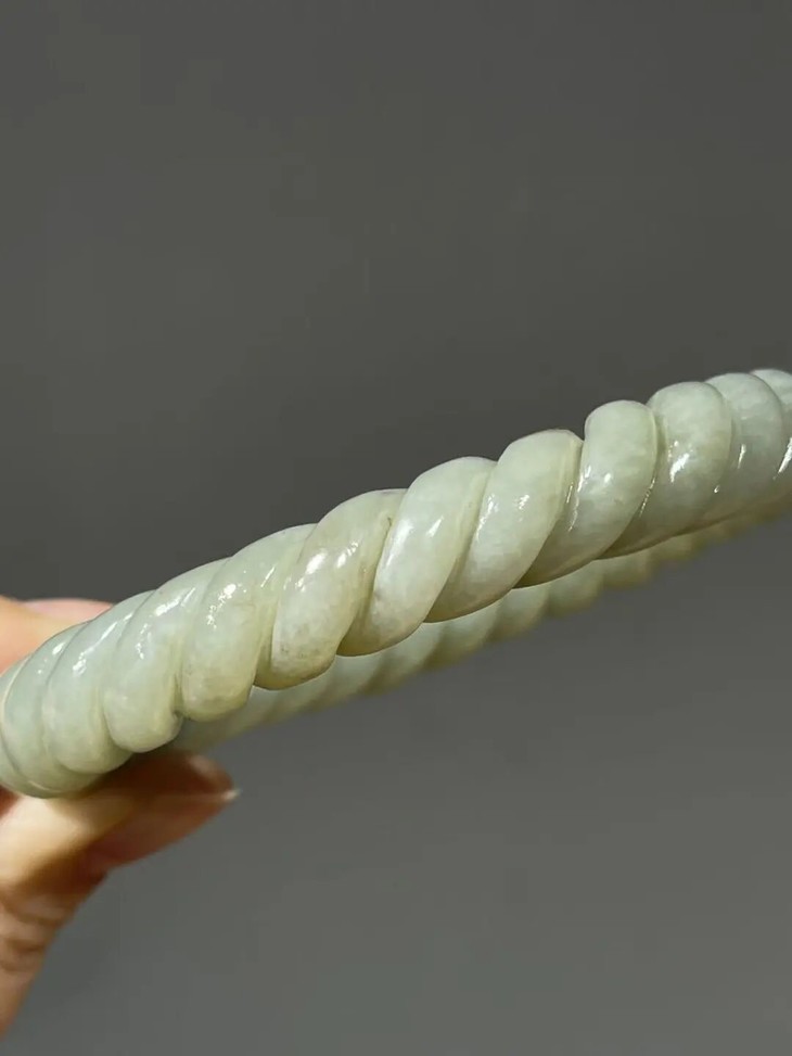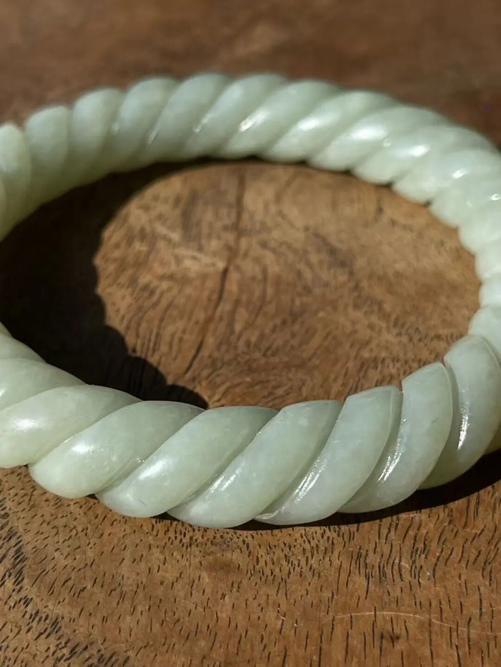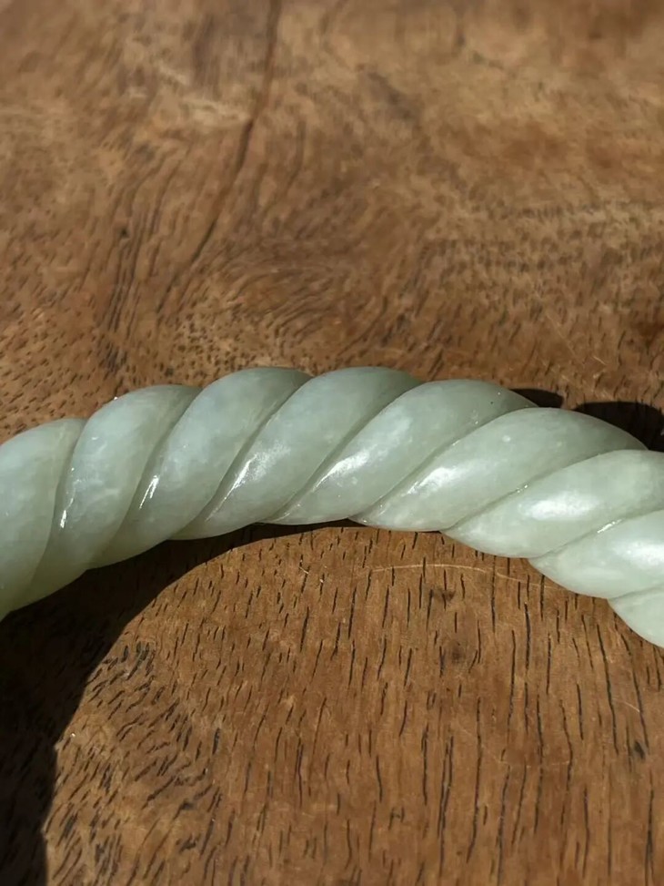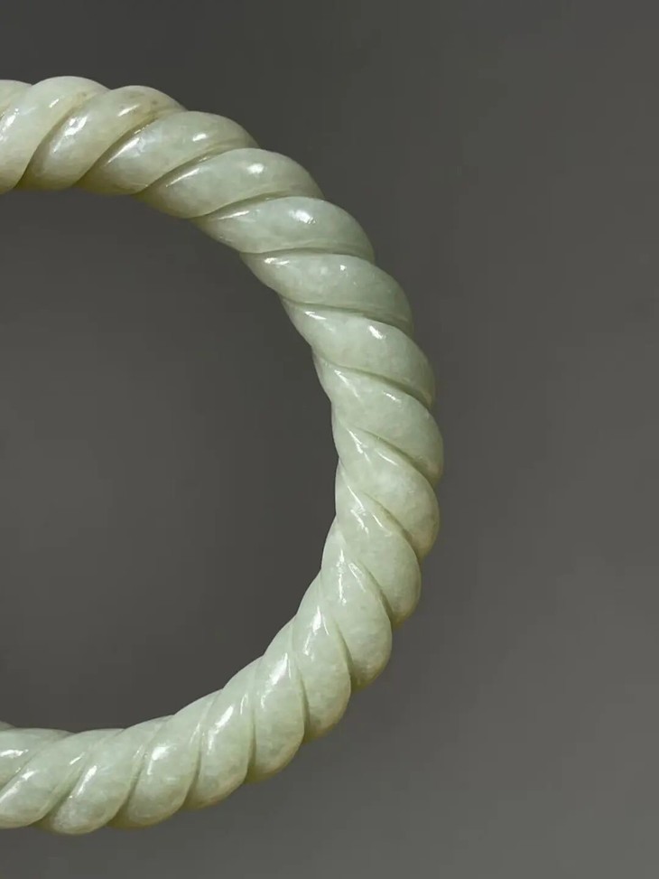 此和田白玉绞绳纹手镯之造型典雅、设计精巧、雕琢技艺精湛,扭绞绳纹路豪迈粗旷,古韵十足,粗条大圈口手镯,内径逾六厘米,条径逾一厘米,重近55公克,风格独特豪迈、简约大方,特显高雅气质与独具一格之品味。