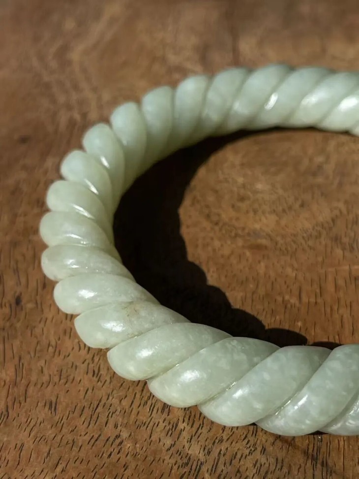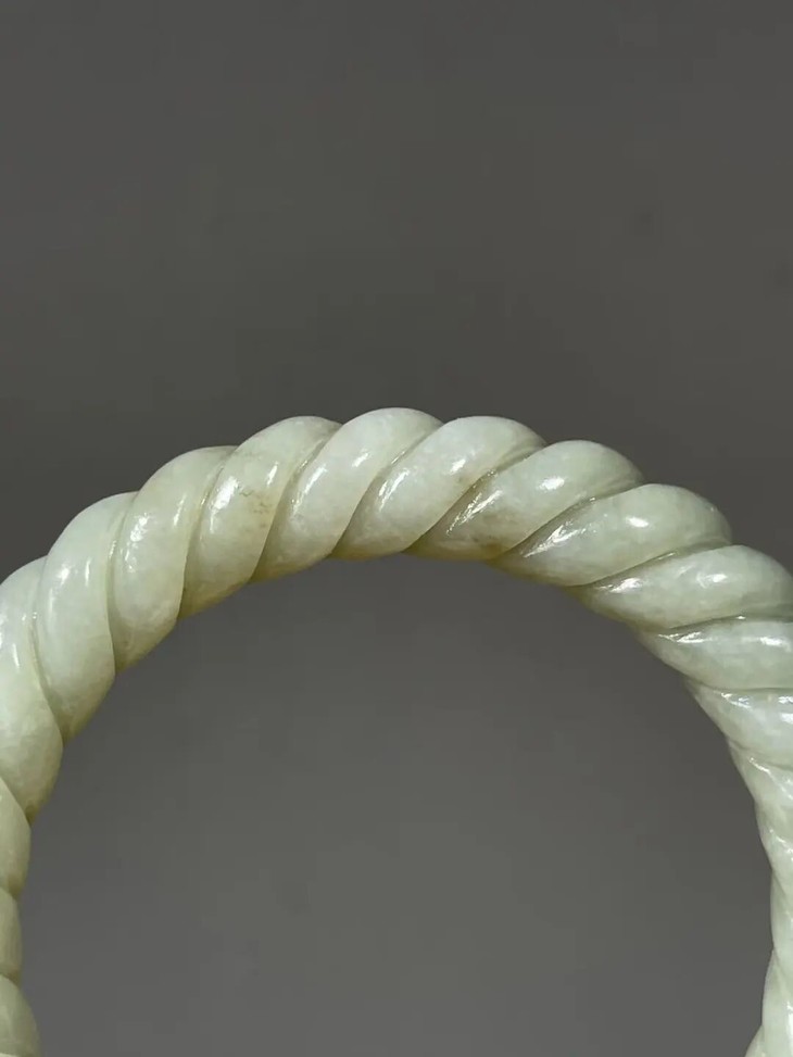 此和田白玉绞绳纹手镯,除凸起棱线多有细微老磕碰痕外,基本保存完好。附专业机构鉴定证书