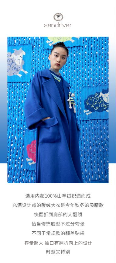 历年在巴黎时装周亮相,享誉世界的艺术羊绒品牌[Sandriver 沙涓]由羊绒布道者郭秀玲女士创立。阿拉善自有牧场纯种羔羊绒,日本国宝设计师小筱顺子,上海自有基地精工细作。承载羊绒情怀,坚持匠人品质。