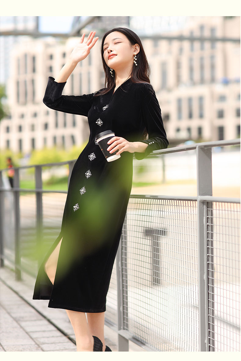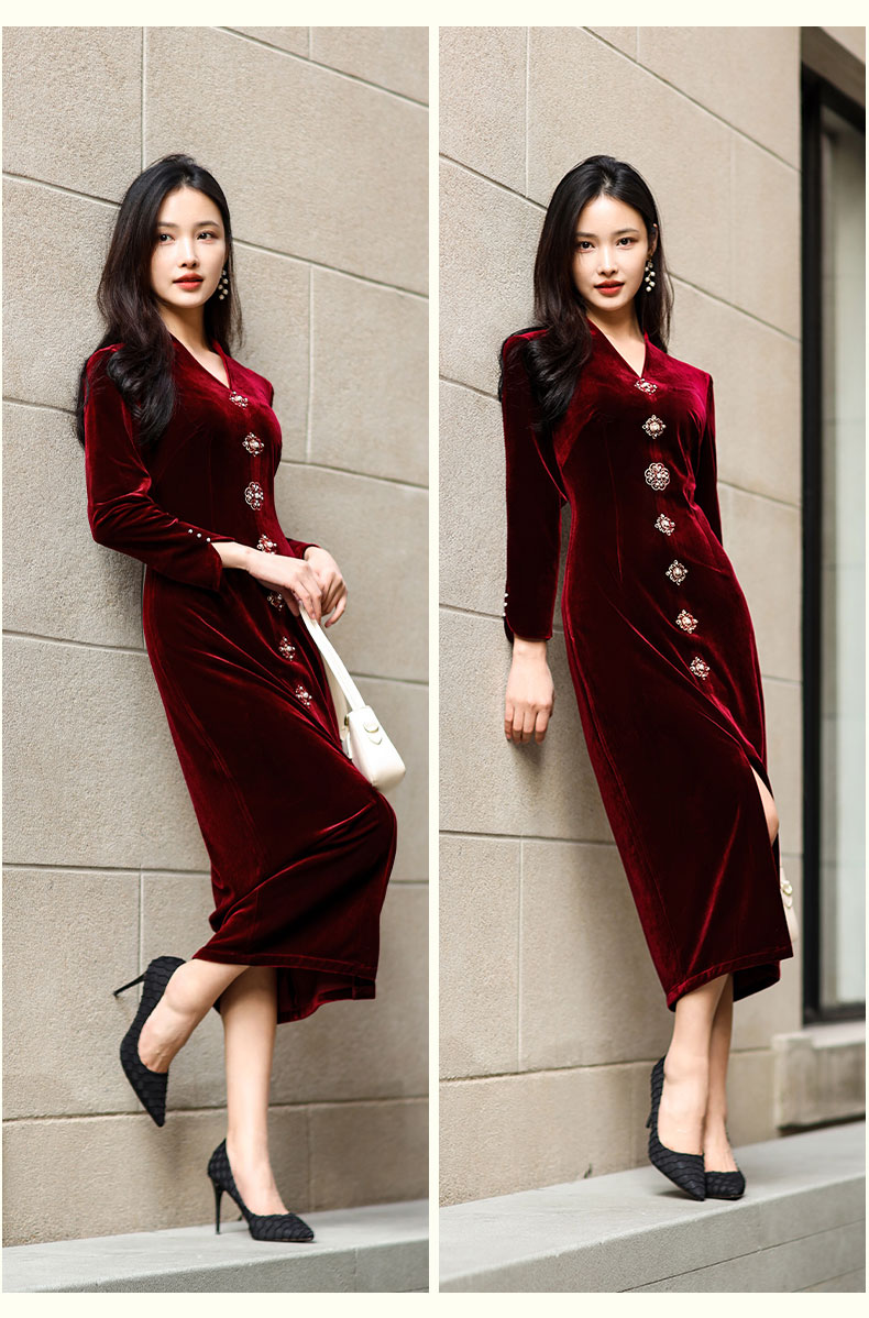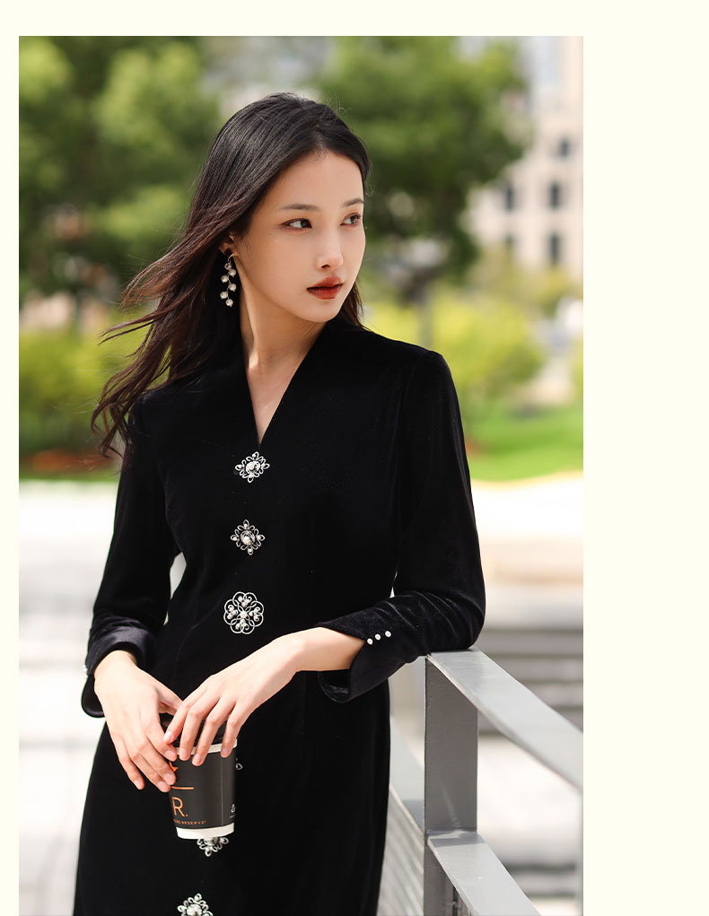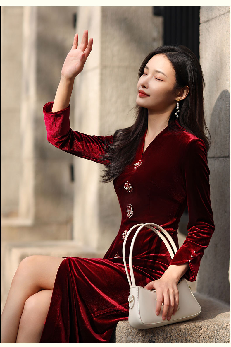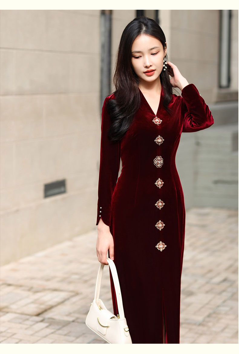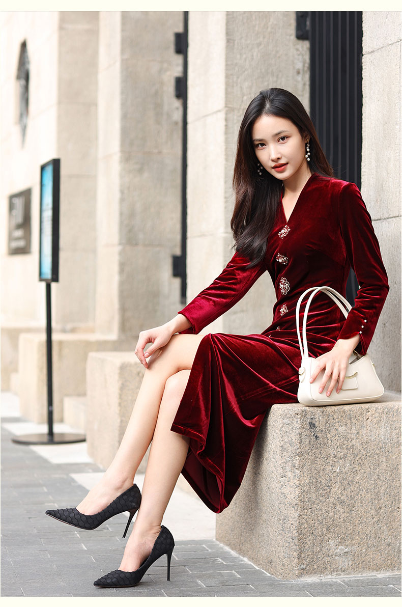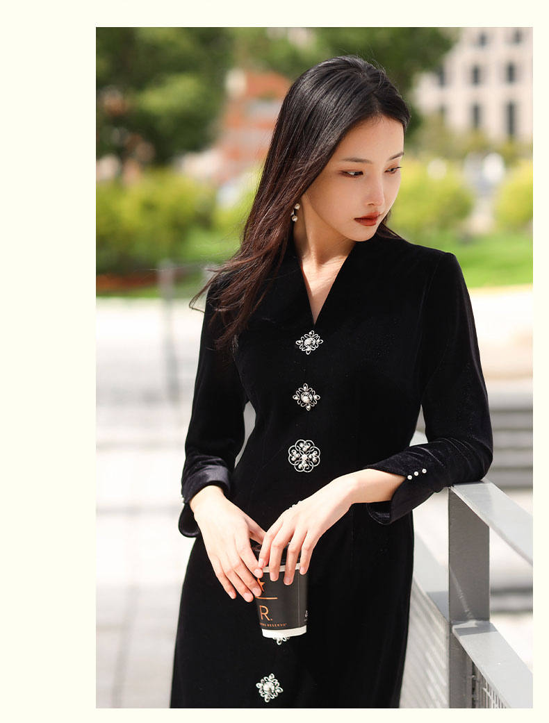 上海逸红颜 司瑶 2025年秋冬新款 丝绒V领连立领中长款中式连衣裙