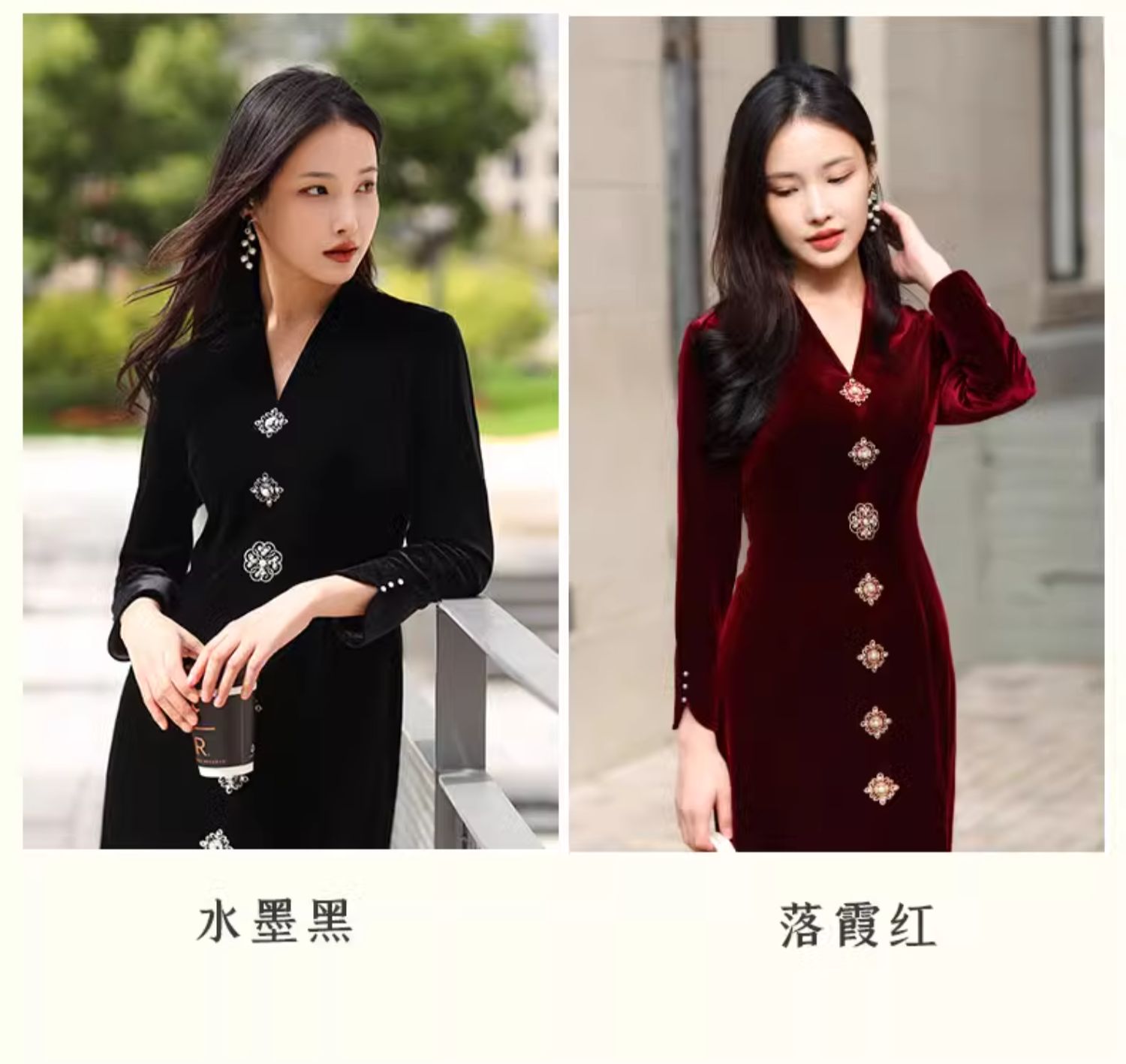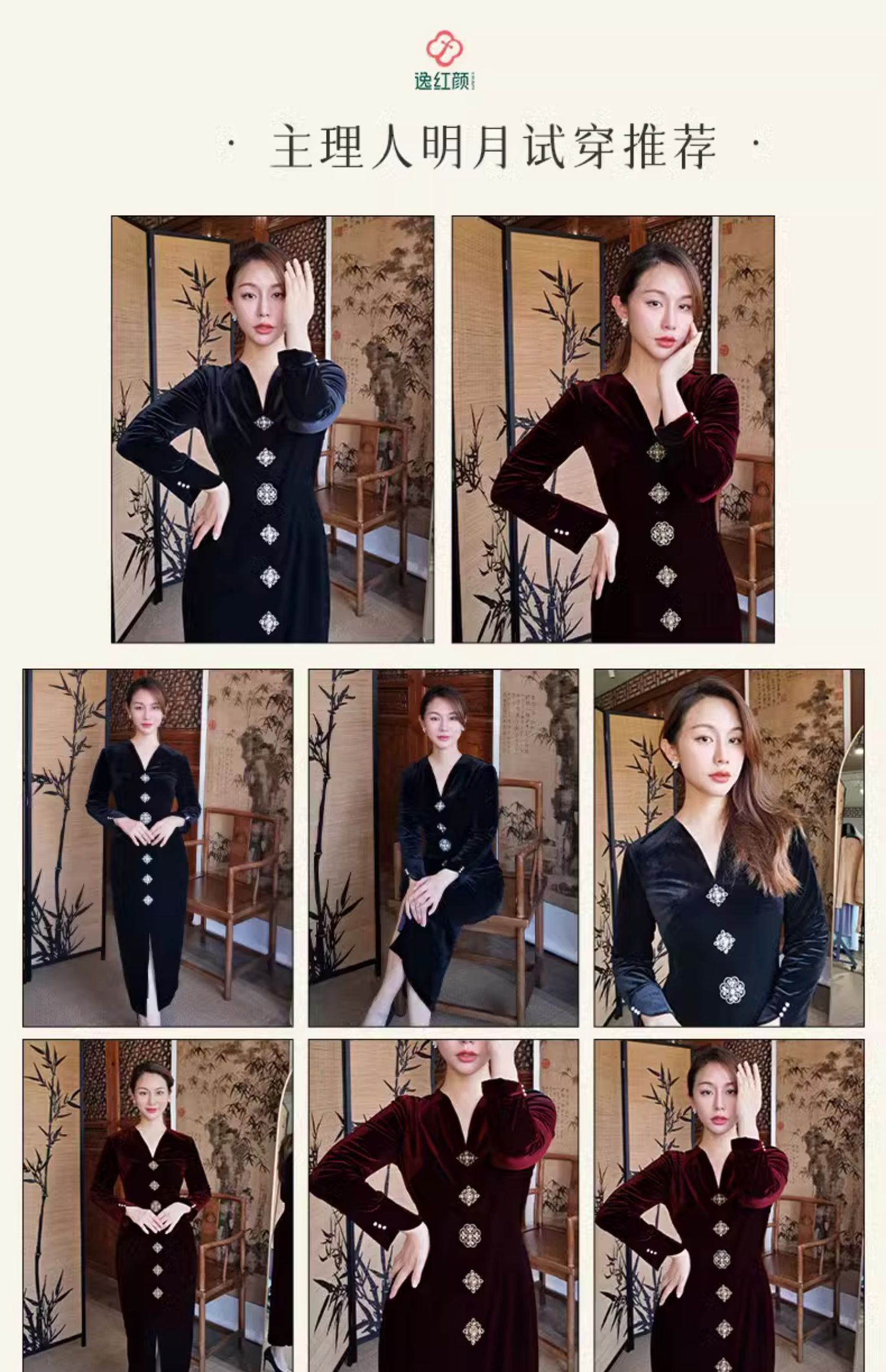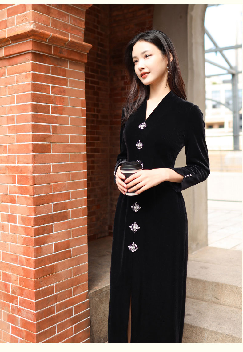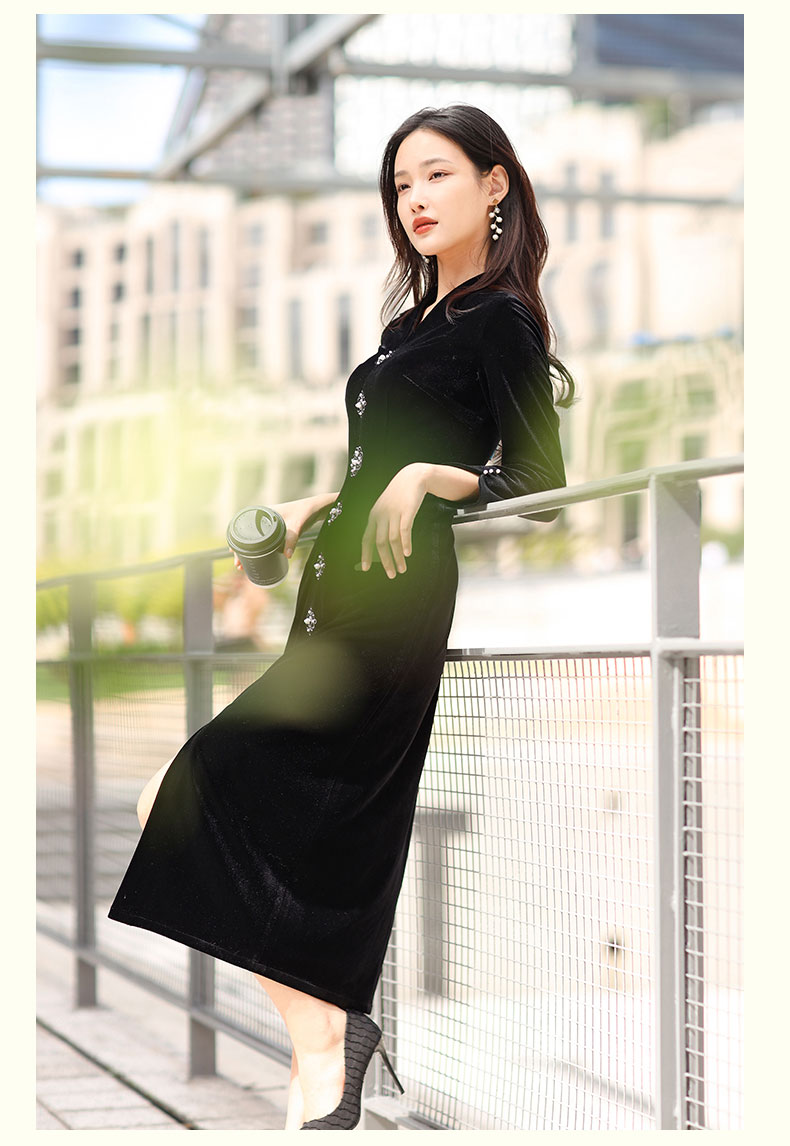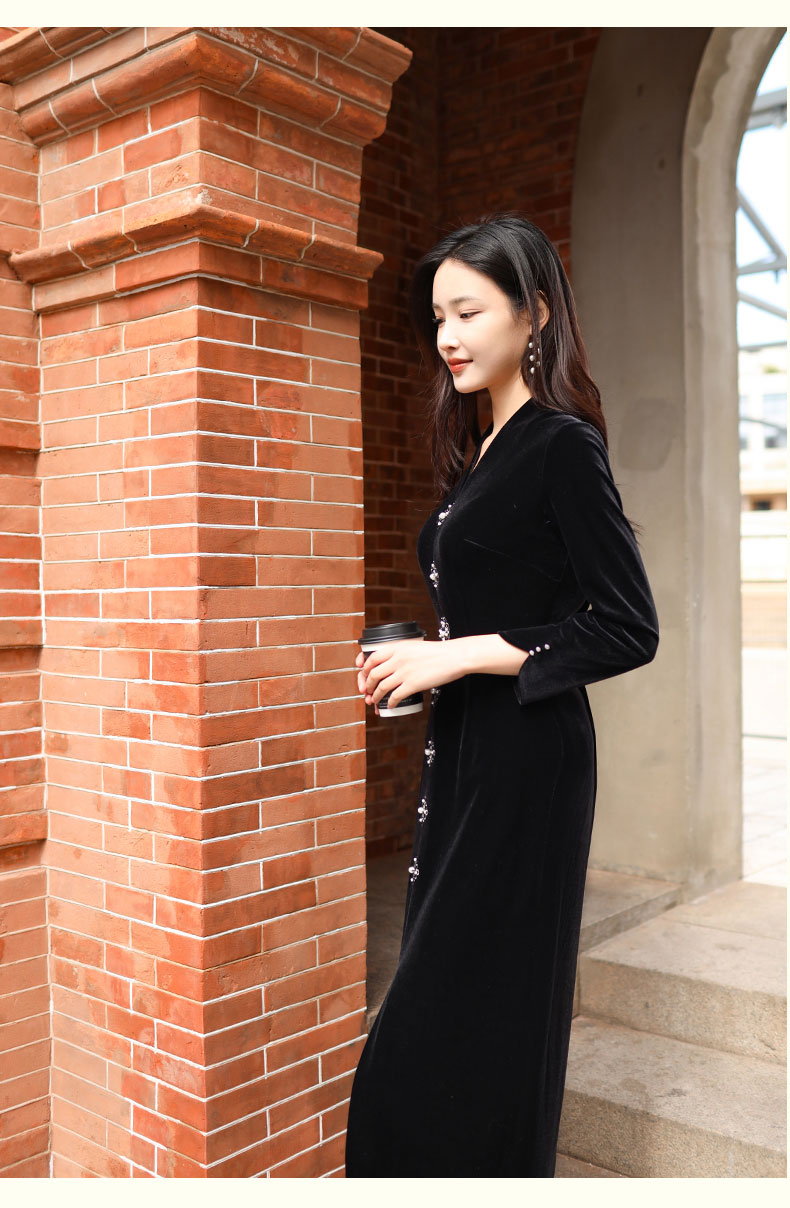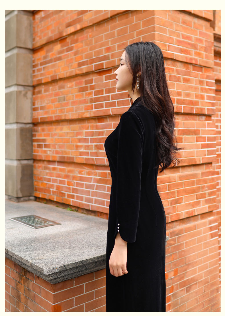 上海逸红颜 司瑶 2025年秋冬新款 丝绒V领连立领中长款中式连衣裙