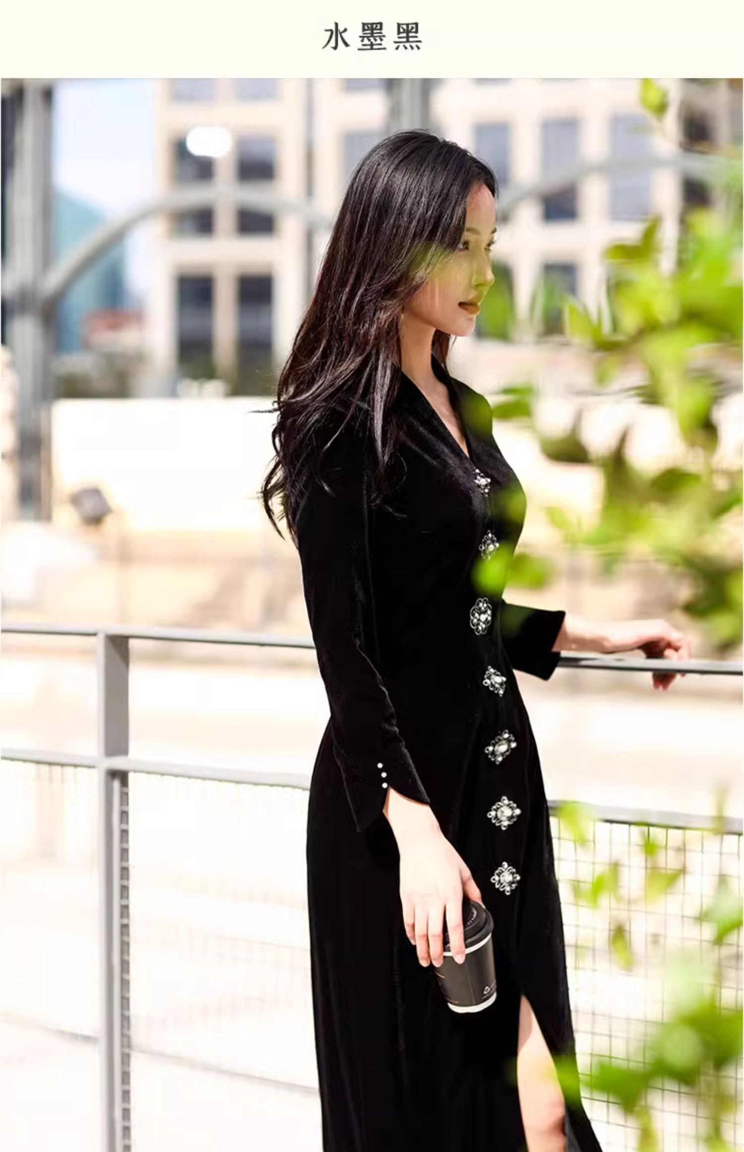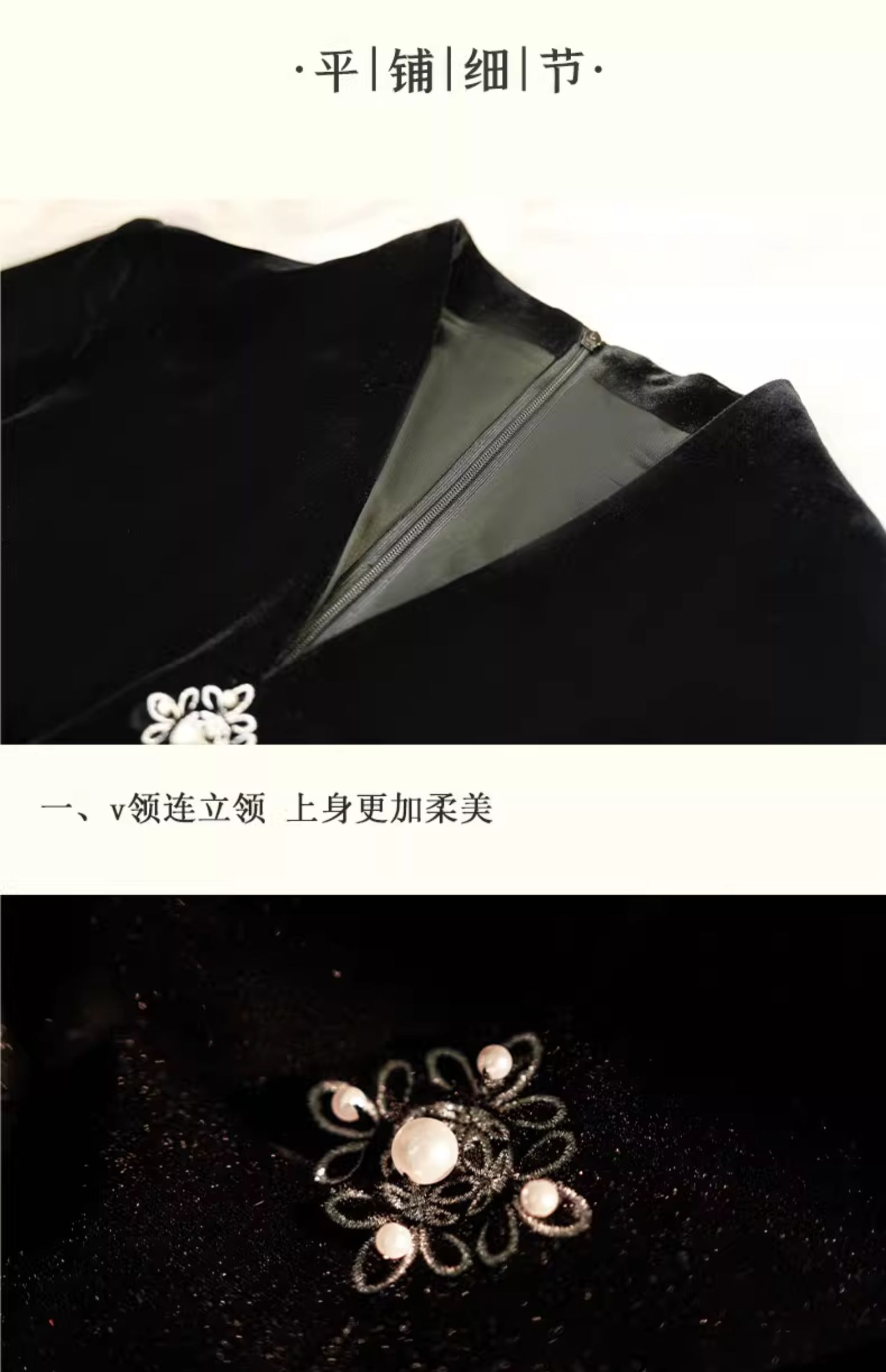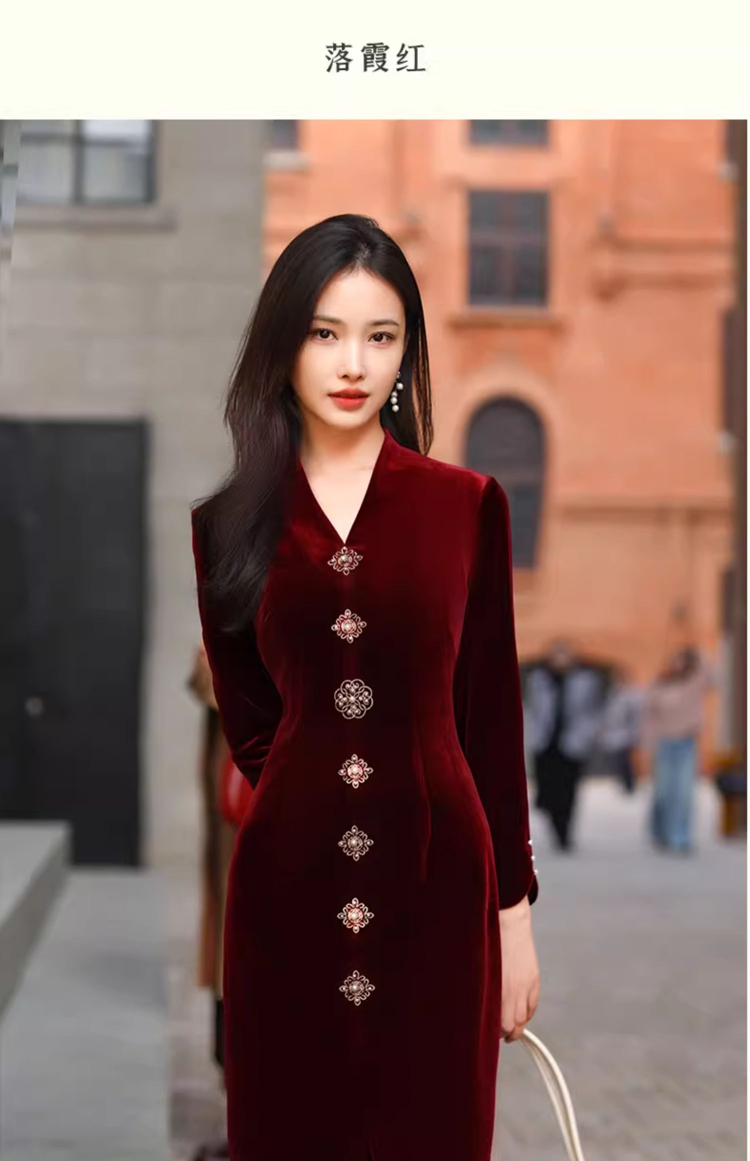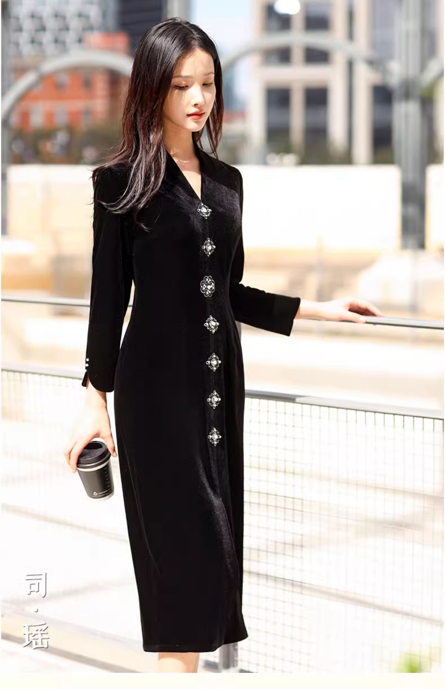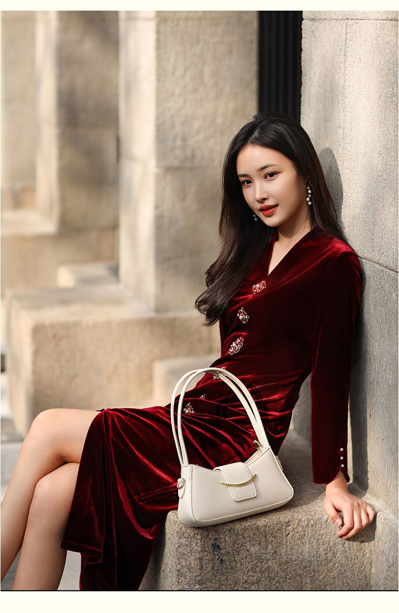 上海逸红颜 司瑶 2025年秋冬新款 丝绒V领连立领中长款中式连衣裙