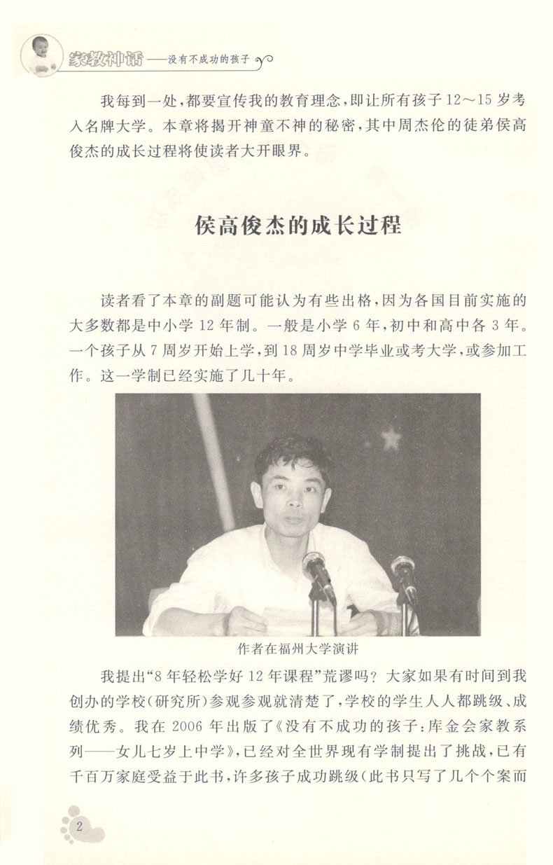 你听说过5岁上六年级的侯高俊杰的故事吗?你知道上小学时成绩倒数第一,却跳级上中学,并以优异成绩考取名牌大学,还获得美国哥伦比亚大学读博士的全额奖学金的库稳飞吗?创造这种家教奇迹的是《家教神话——没有不成功的孩子》的作者、中国超常教育专家库金会先生。《家教神话——没有不成功的孩子》中有他传奇的教子经验,还有他所创造的家教神话:“使每个孩子都能用8年时间轻松学好12年的课程。”