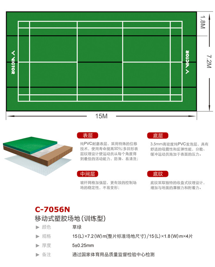 规格:15m长*7.2m宽(整片标准场地尺寸)/15m长*1.8m宽*4片