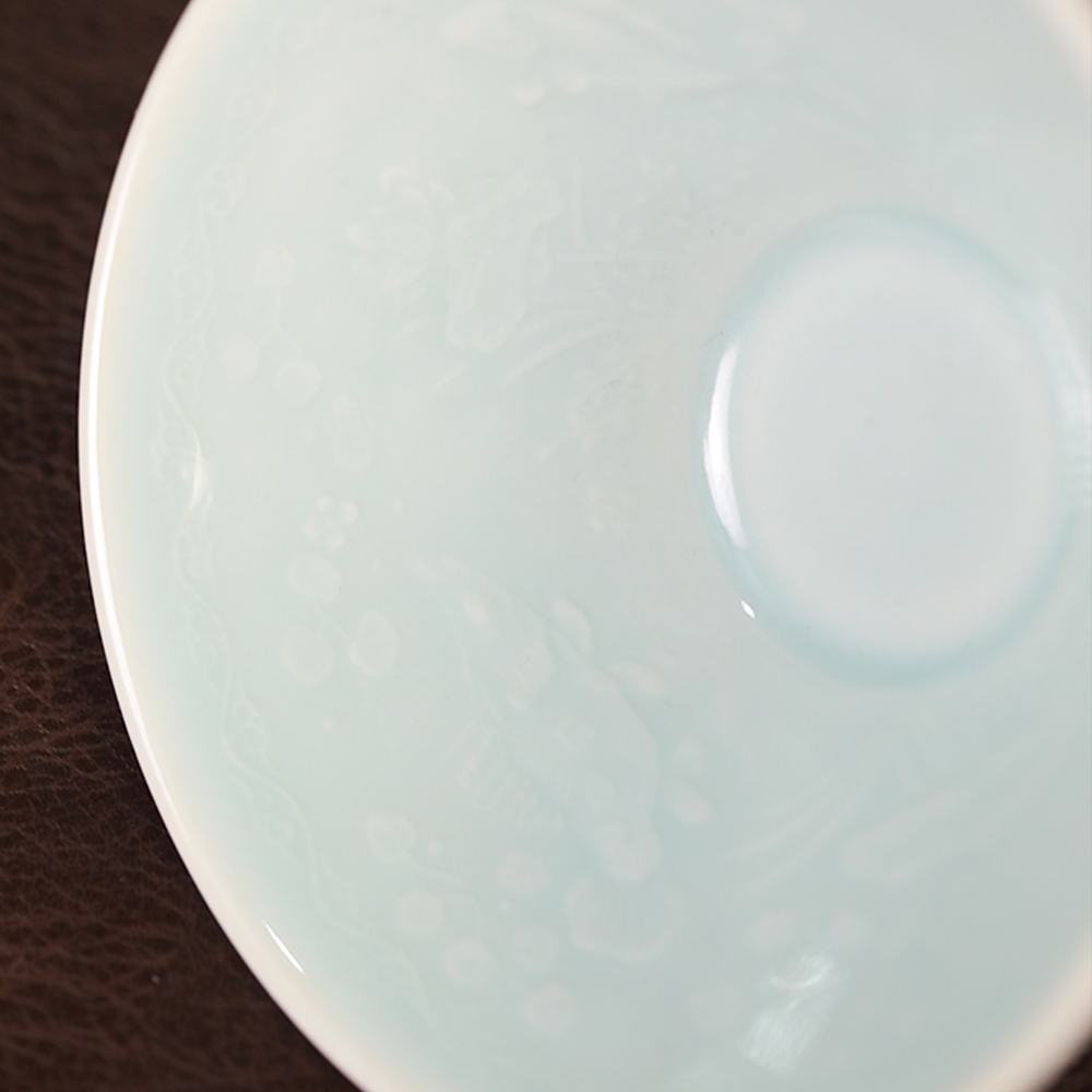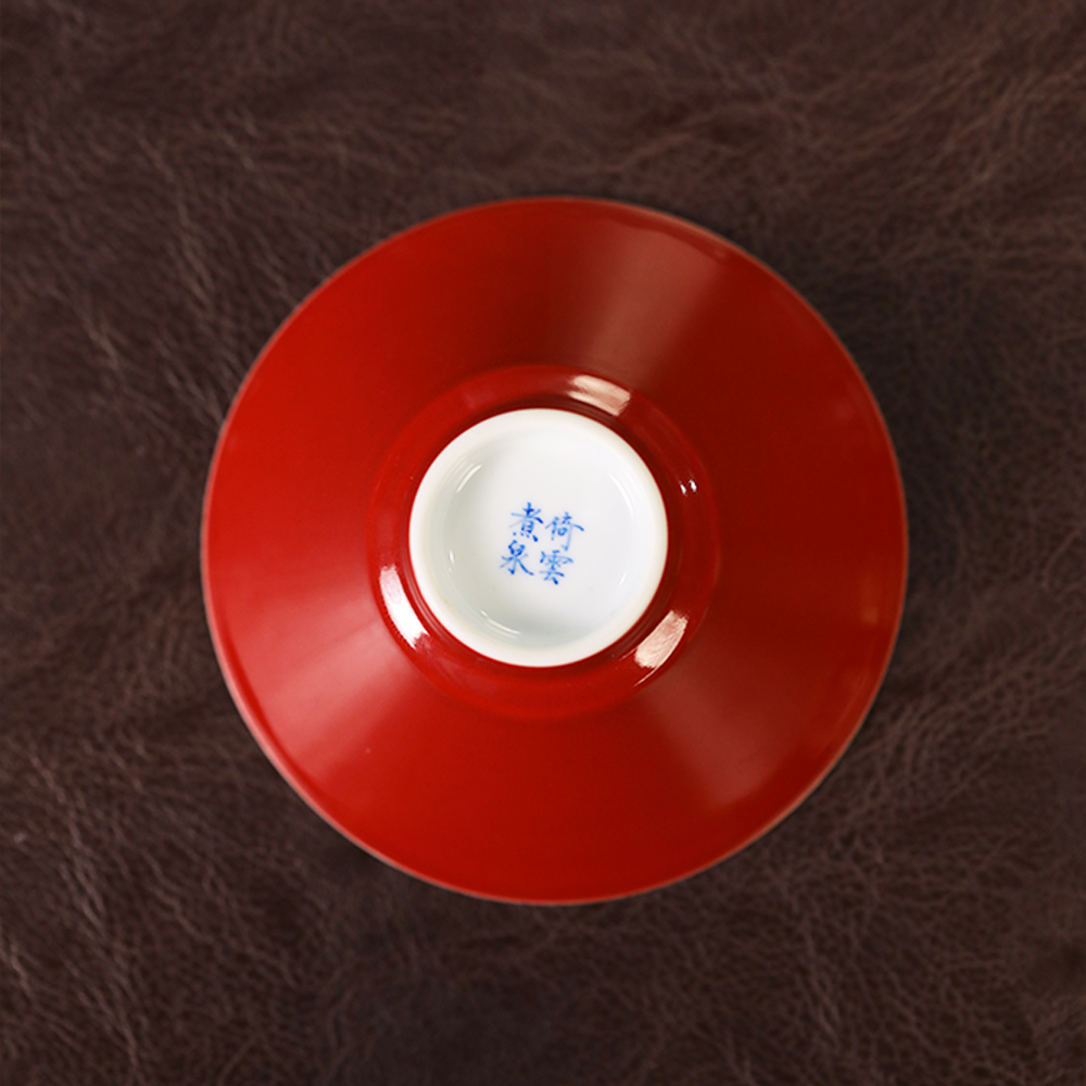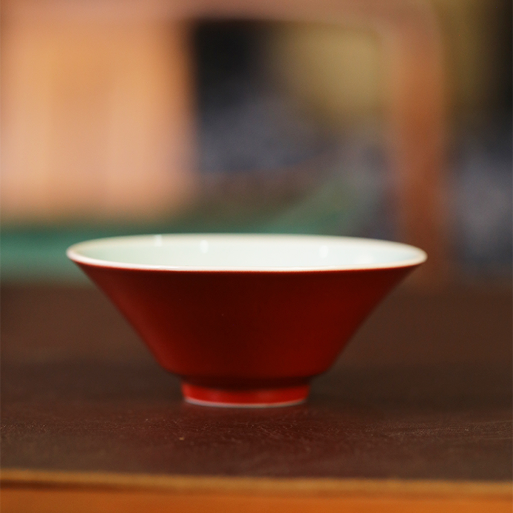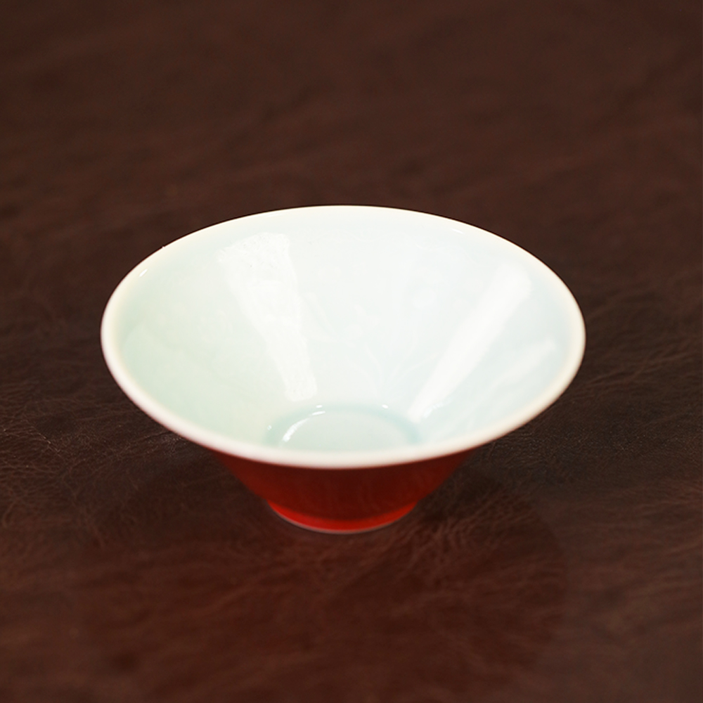 倚云煮泉内模印红釉斗笠杯-鱼藻纹
