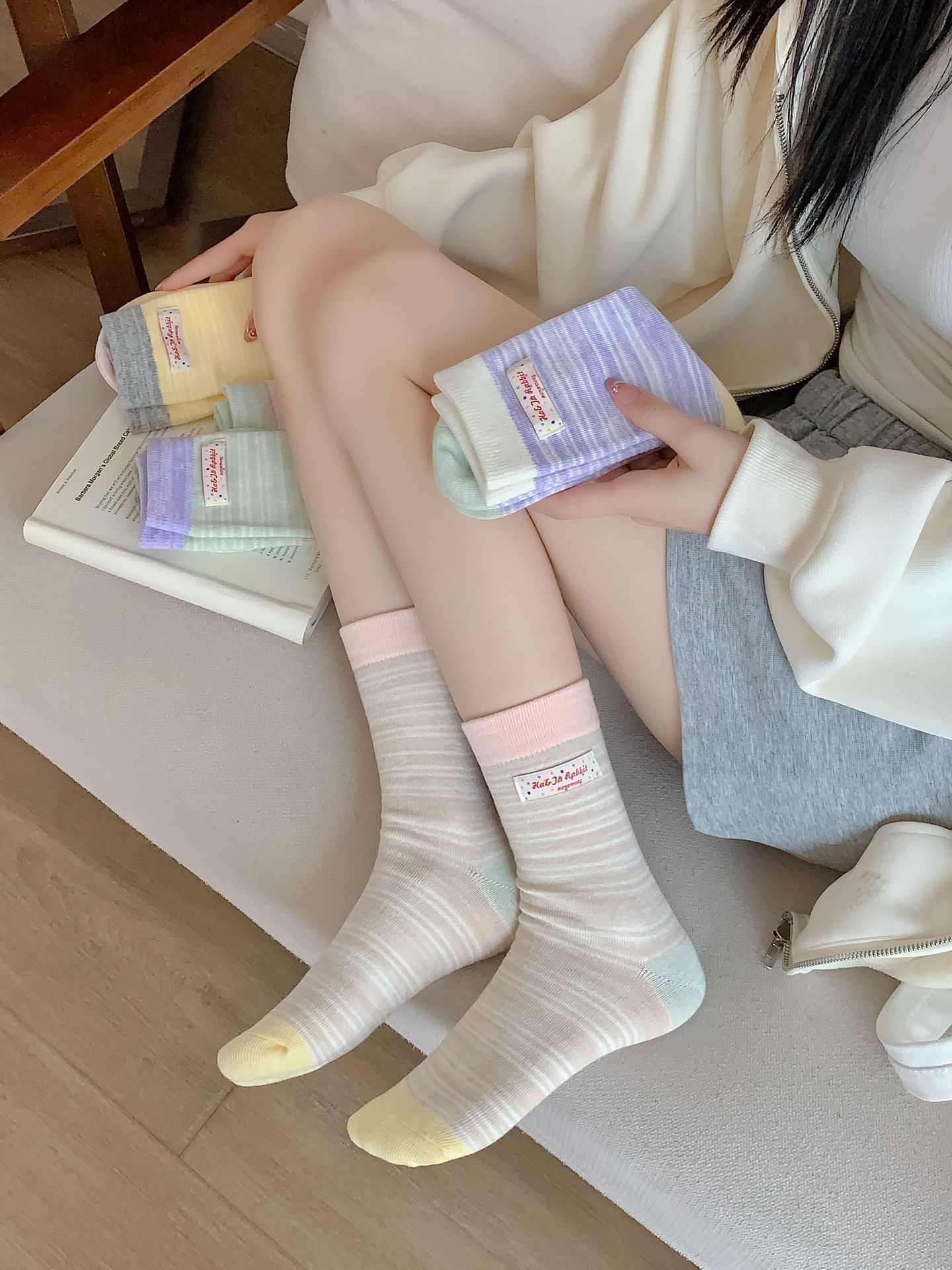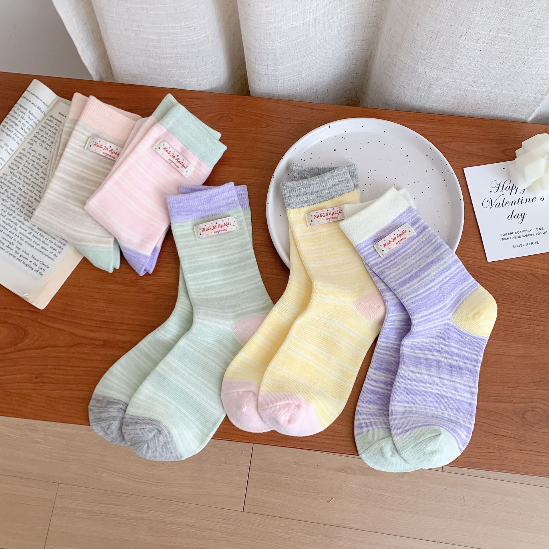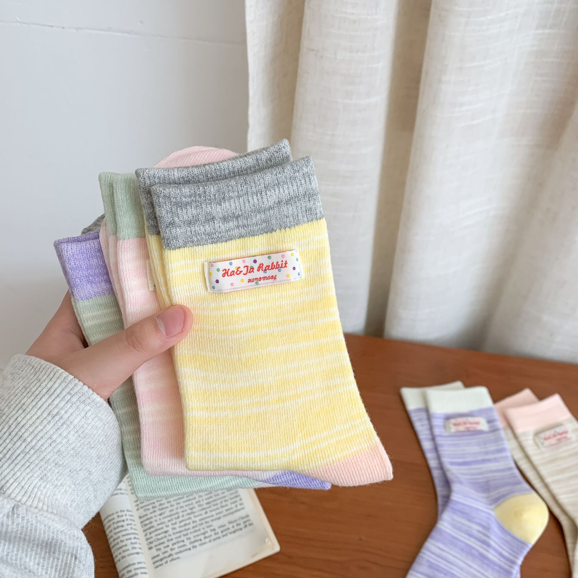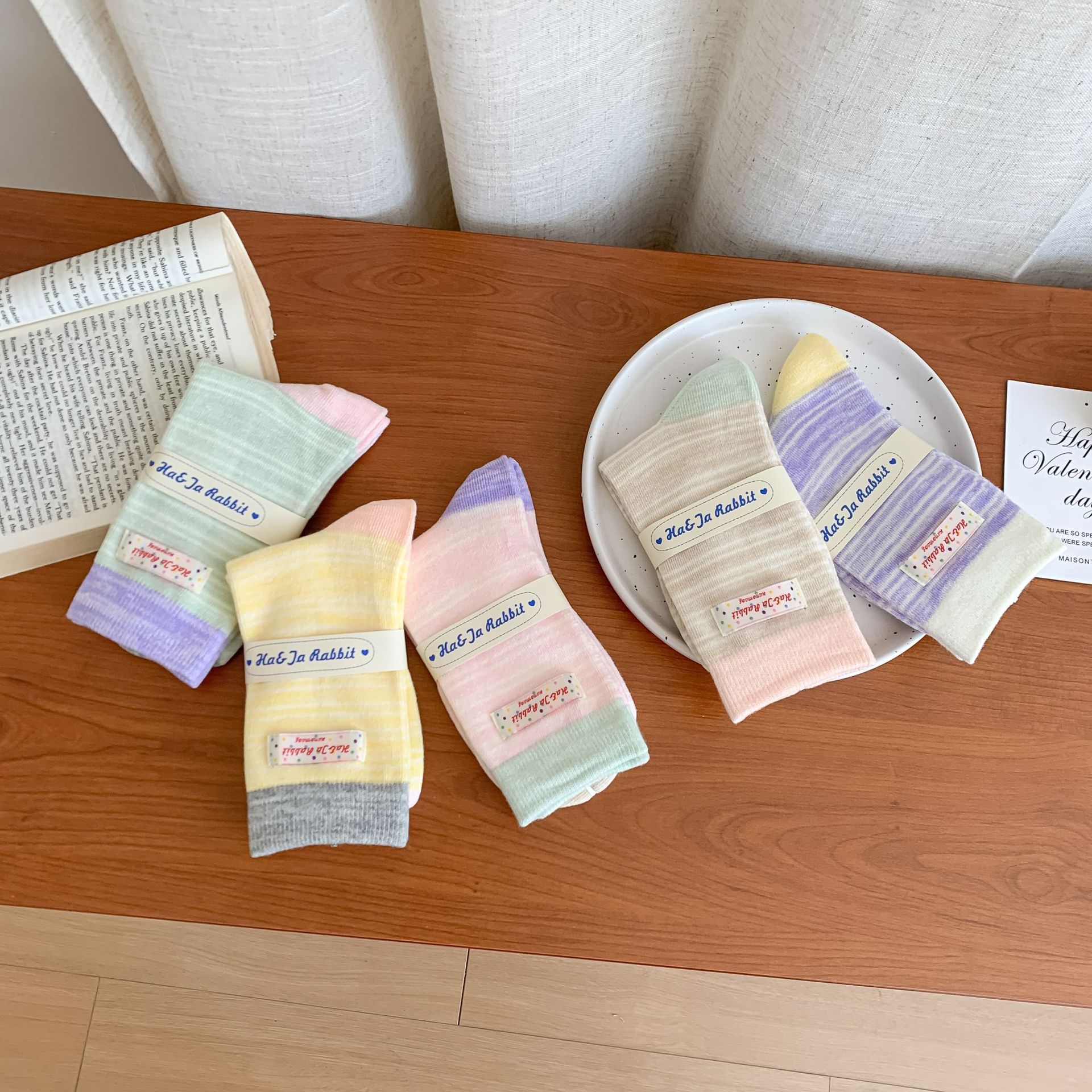 5双一组!花田兔费尔岛油画棒系列马卡龙杂色中筒袜子女日系春夏设计款棉袜