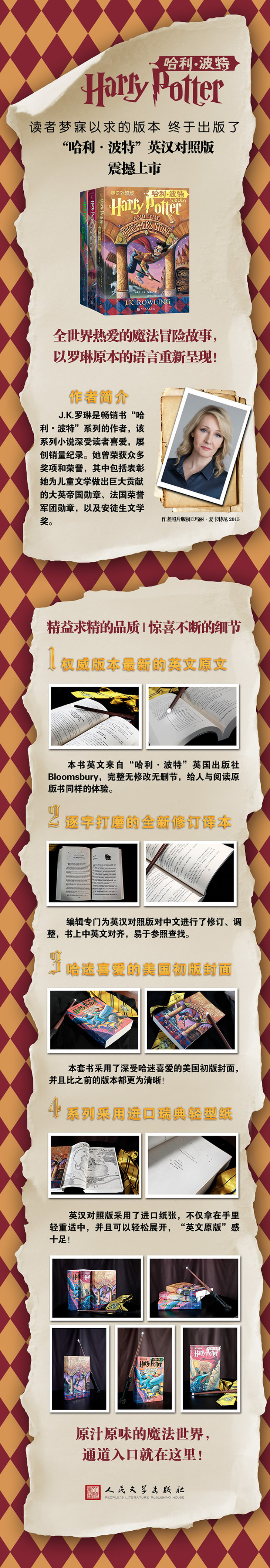 本书是哈利·波特与魔法石》的英汉对照版,书中左侧是英文原文,右侧是中译文,英文和中文均是全本,未经缩写和删改。
