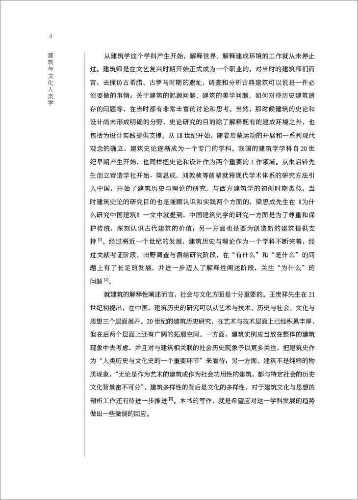 本书是基于笔者在北京交通大学开设的课程“建筑与文化人类学”的教学内容而撰写的。开设这门课程的缘由要追溯到九年之前,当时我向导师秦佑国老师申请,想要以乡土建筑为题开展博士论文的研究。秦先生便指点我,要先看看文化人类学的理论和方法,并且提到了结构功能主义在乡土社会的研究中可以起到的作用,还强调了田野调查的重要性。在博士论文的工作过程中,我对文化人类学产生了浓厚的兴趣,这个学科不仅帮我更好地完成了纳西族地区的乡土建筑调查,而且改变了我由来已久的“理工科直女”性格,思维从线性变得更活跃和发散,三观从单一变得更开放和多元,视野中看到的世界仿佛广阔了许多。2014 年完成博士课题到北京交通大学执教以后,我尝试教授“建筑与文化人类学”这门课程,更广泛地思考这两个学科在理论和实践上结合的更多可能性。2019 年,师兄罗德胤老师邀约,想要出版一套《遗产新知文丛》,希望能组织一批中青年高校教师基于各自的教学工作撰写一套文化遗产相关领域的丛书,并且希望我能继他本人的著作之后第二个完成书稿。于是,经过一年时间的写作,我得以在此向诸位读者奉上此书。