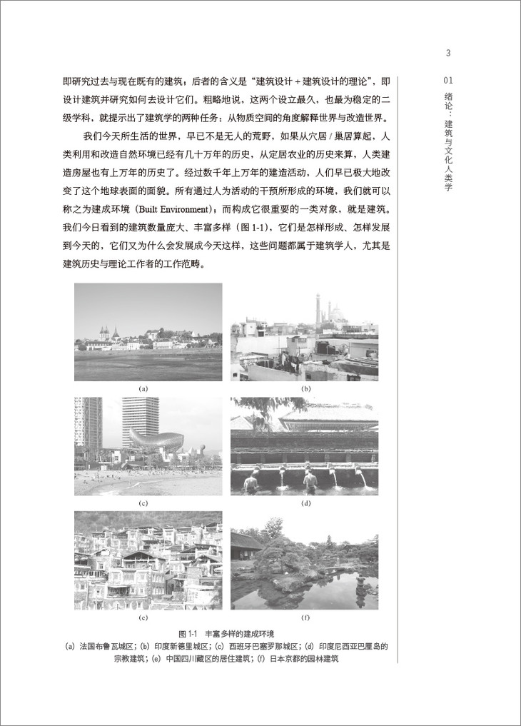 撰写此书,并非是要搭建一个建筑人类学的理论体系,笔者的学术素养还远远未臻此境,更多地是想讨论强调对象的建筑学与长于方法的文化人类学这两个学科之间相互交叉的一些可能性。20 世纪90 年代,常青院士开创性地把建筑人类学的研究引入了国内,其团队在基金课题、学术论文、理论译著、学位论文上取得了丰硕的成果。他提出了变化与恒常、空间与制度、功用与习俗、环境与场景以及视感与触感等建筑人类学的探索方向,认为对“原型意象”“潜在维度”和“集体记忆”等关键词的关注,形成了建筑人类学与强调“风格—构图”的学院派和强调“功能—形式”的现代派之间的清晰差别。赵辰先生认为,建筑学向人类学的这种跨学科的探索,体现了建筑学突破既有的专业预设、进入更广泛的人文学科领域的时代趋势,是20 世纪后半叶起持续开展的“建筑文化观念变革”的一部分,而文化人类学则是这一趋势中必然要涉及的学科领域。经过这一领域前辈们的多年工作,人类学家的建筑与空间研究以及具有人类学色彩的建筑学研究已经更多地为人们所知晓和了解。本书尝试的,就是把建筑学中的不同对象和人类学中的不同理论方法结合起来,形成一系列的“话题”,来展现这一学科交叉领域的部分面貌。全书的上篇主要从理论方法出发,例如,从文化进化论出发,讨论乡土建筑中“化石隐喻”下的研究范式;从功能主义学派出发,梳理其与中国乡村研究的关系,讨论建筑学中“乡土”一词的理论渊源等。下篇则主要从对象出发,考察身体、建筑、城市、遗产等不同的物质空间研究对象与文化人类学以及更广泛的人文学科思想之间的关联,拓展解读这些对象的多元思路。总之,本书并不是一个完备的体系,而是一系列的话题讨论,是持续的、渐进的和开放的。就像本书在第10 章中所说的那样,希望能够抛砖引玉,引发更多对于建筑学和人类学结合之可能性的思考与讨论。此书能够付梓,要由衷地感谢很多人的指导、帮助与支持。感谢我的博士生导师秦佑国老师,是他在我对学术工作尚且青涩懵懂的时候,指点我结合文化人类学的理论和方法去开展建筑研究,直至今日,他仍然是我为人治学的灯塔;感谢我在英国访学期间的导师彼得·布伦德尔·琼斯(Peter Blundell Jones)教授,他指导我系统地学习人类学的知识,为我打开了建筑人类学的大门,斯人已去,但他身为学者的赤子之心一直让我铭记心间;感谢师兄罗德胤老师组织这套遗产新知文丛,督促我把近年在建筑与文化人类学课程教学中的成果进一步完善成书;感谢我的研究生们,以及所有选修过这门课程的同学,他们的参与和反馈为我不断完善课程内容提供了宝贵的依据;感谢同样关心建筑与文化人类学这个话题的诸多同仁,与他们欢乐的交流给了我很多启发。最后,还要感谢写作期间陪伴我的亲友们,感谢你们在一段艰辛的时光里给了我源源不断的温暖和鼓励。