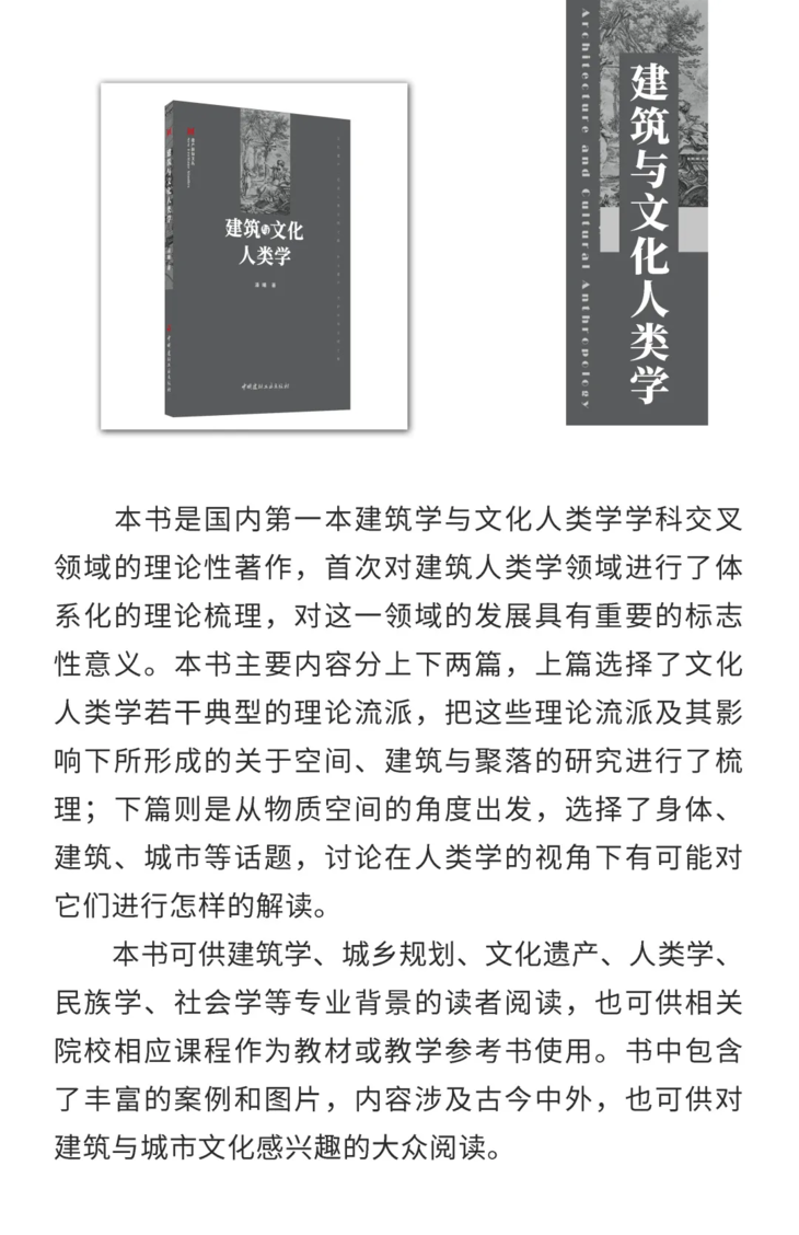 这本书是国内第一本建筑学与文化人类学学科交叉领域的理论性著作。国内建筑人类学的研究发端于20世纪末,近年来,随着建筑文化、遗产保护的研究不断发展,建筑人类学已经成为一个备受关注的新兴领域。这本书首次对该领域进行了体系化的理论梳理,对这一领域的发展具有重要的标志性意义。