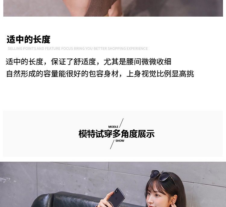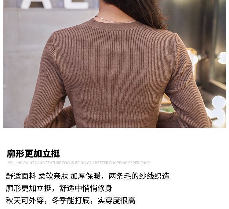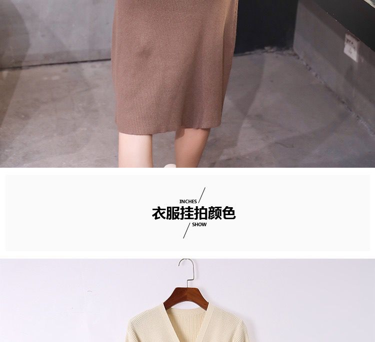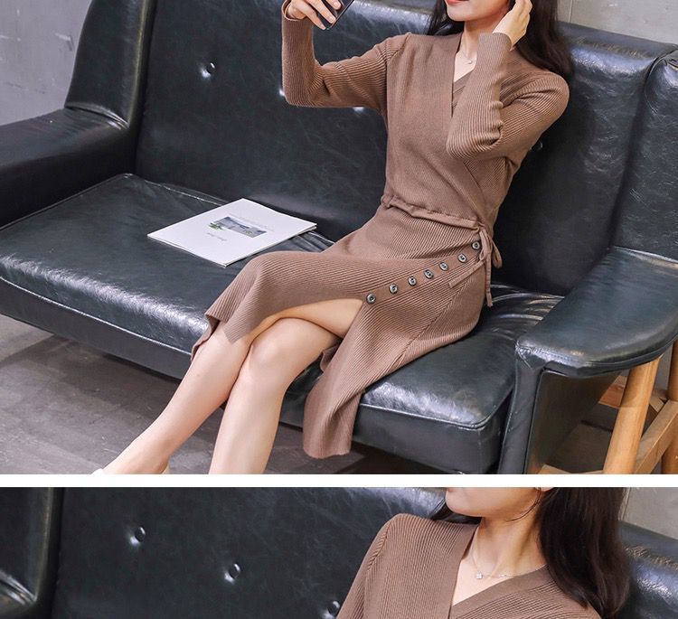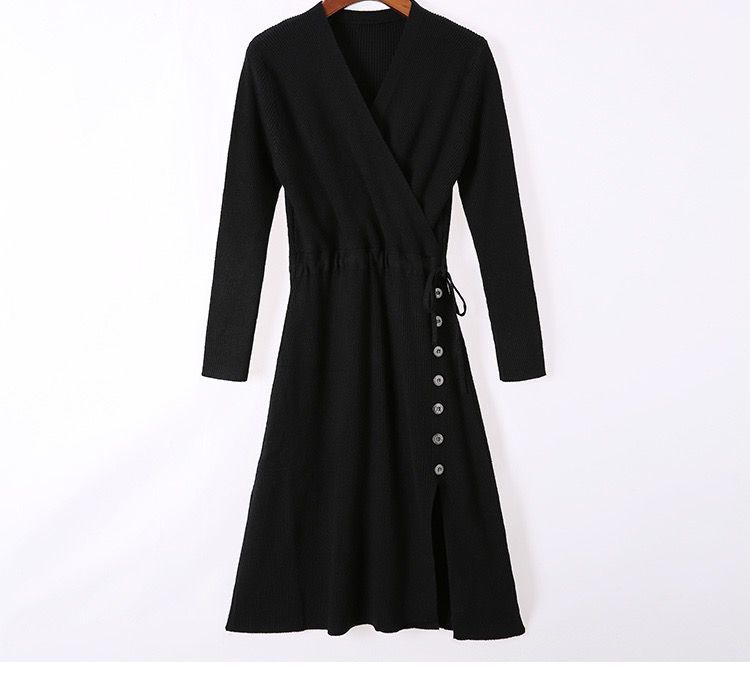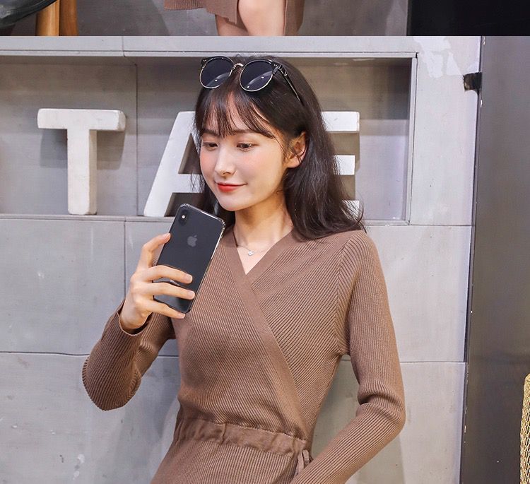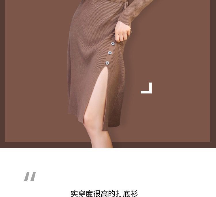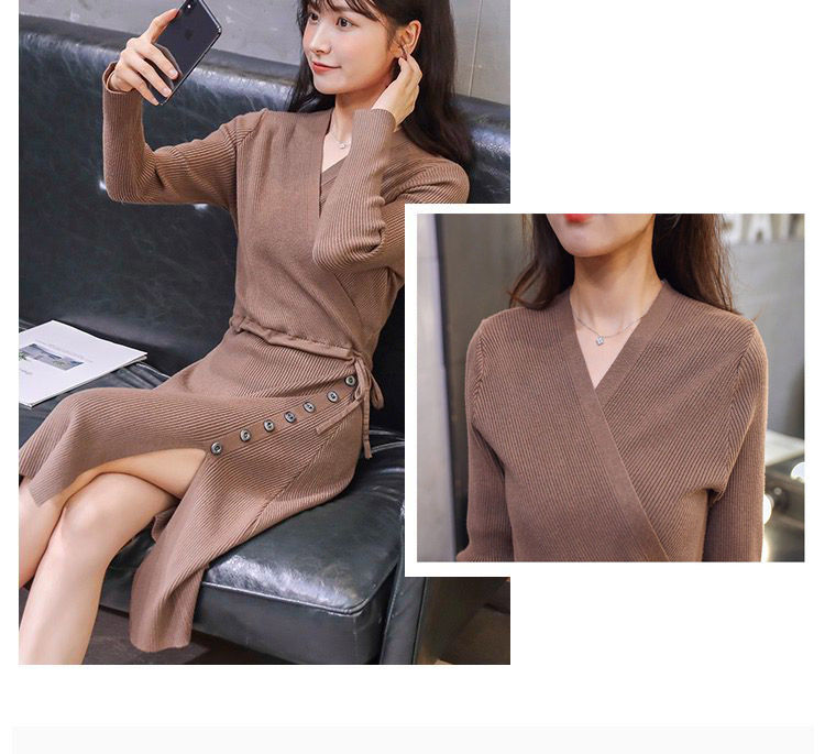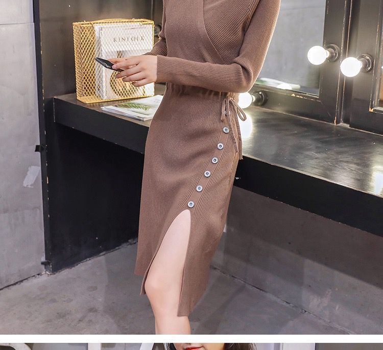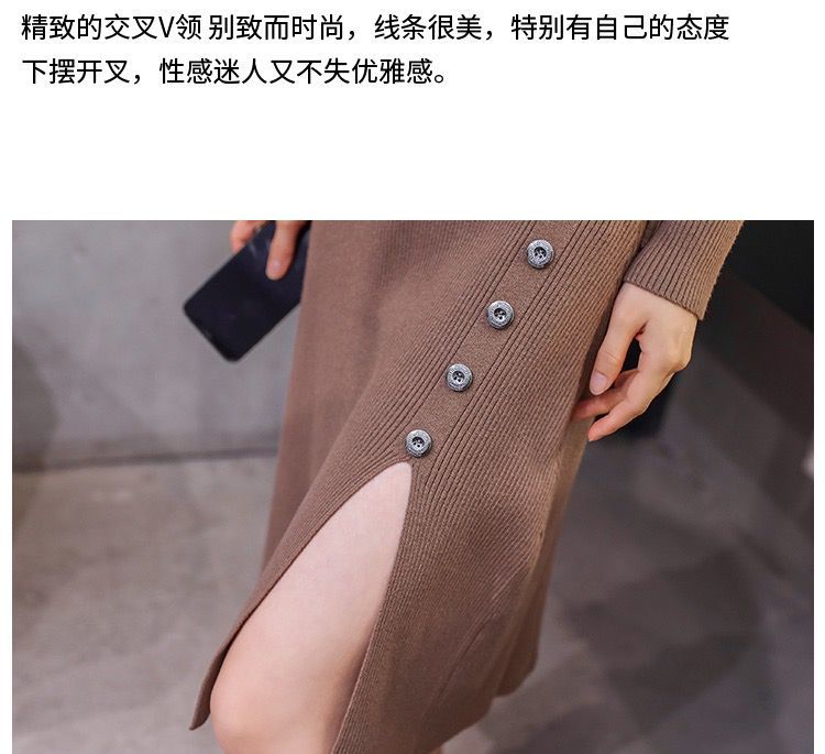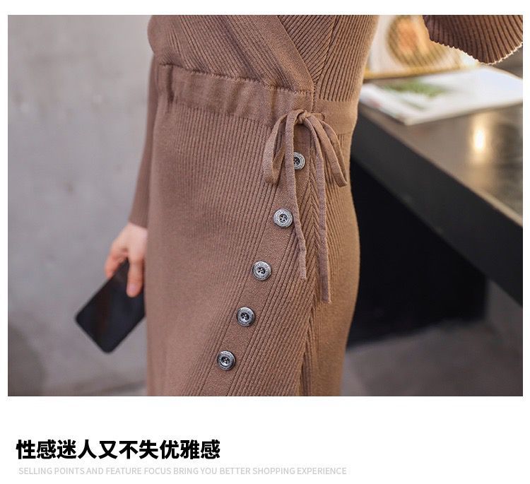 秋冬季韩版针织打底长裙修身V领毛线连衣裙毛衣女套头衫中长款裙七夕情人节