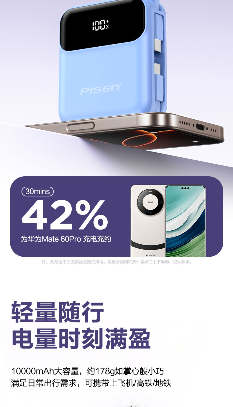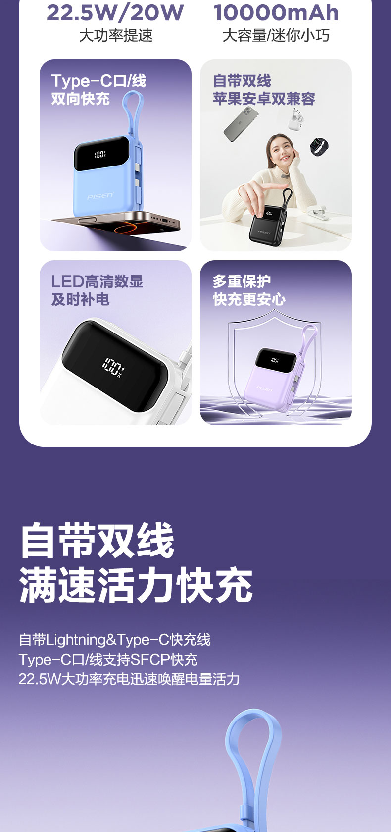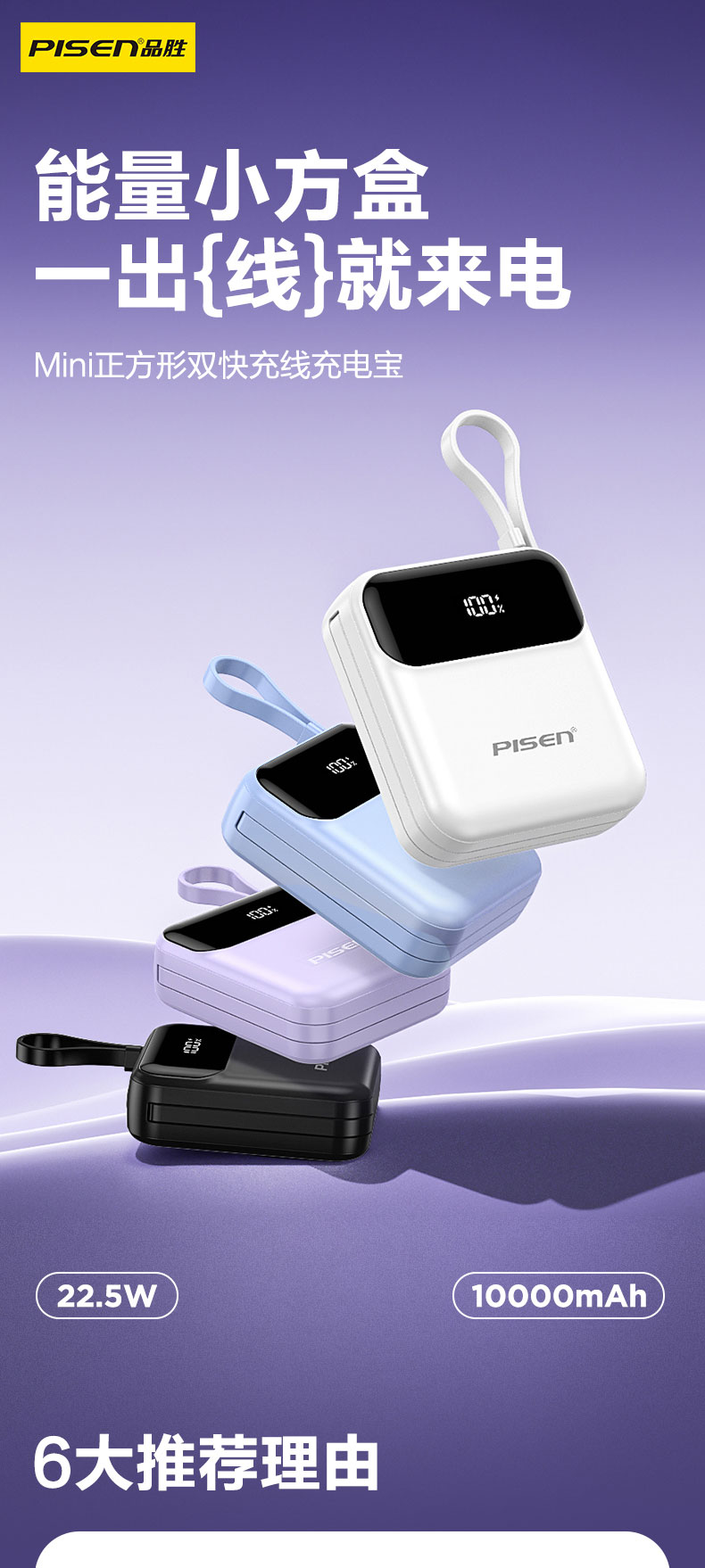 品胜 22.5W Mini正方形双快充线充电宝10000毫安 支持20W快充移动电源自带苹果/C口数据线