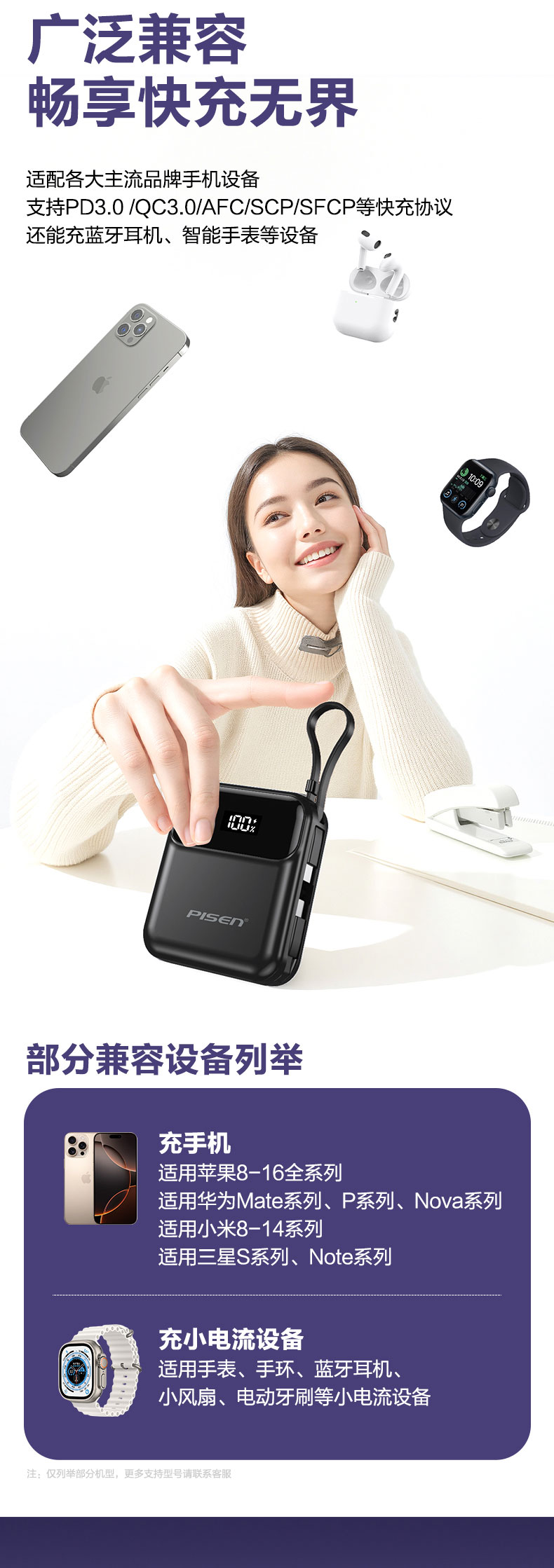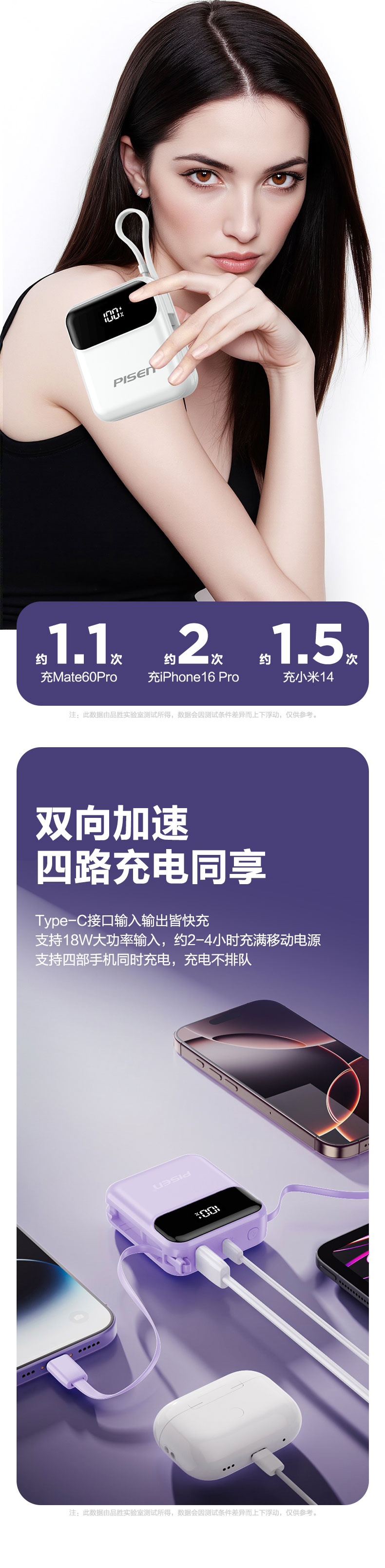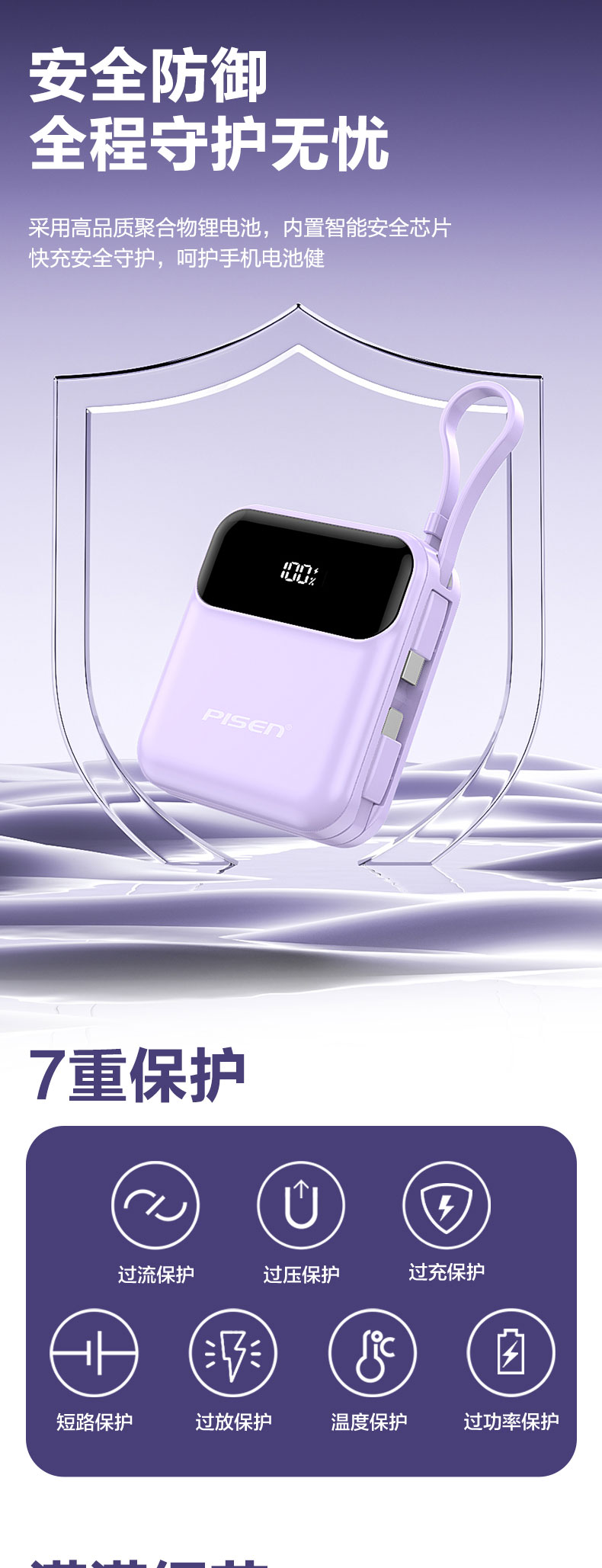 品胜 22.5W Mini正方形双快充线充电宝10000毫安 支持20W快充移动电源自带苹果/C口数据线