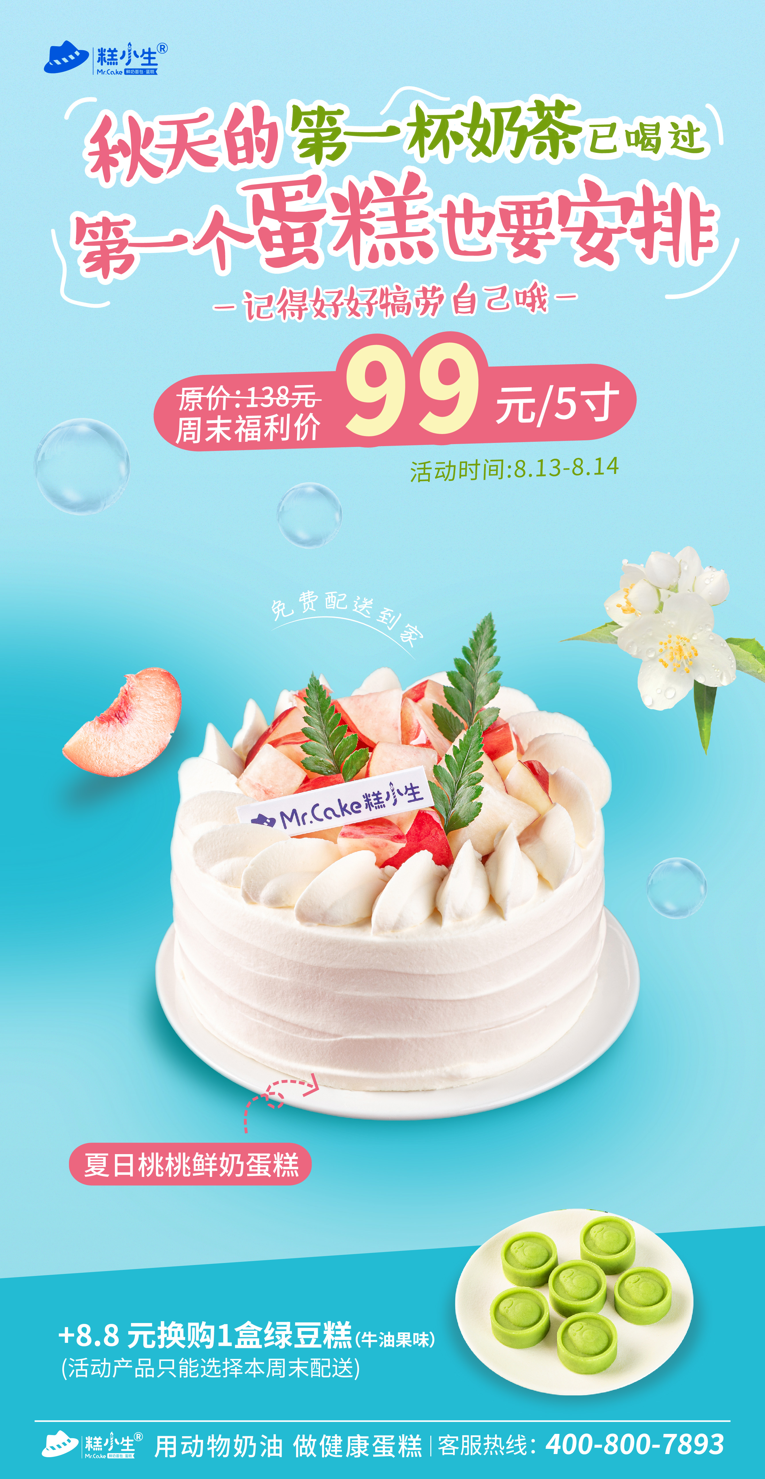 3、买蜜桃蛋糕+8.8元可换购牛油果绿豆糕一盒(活动仅限周末配送)