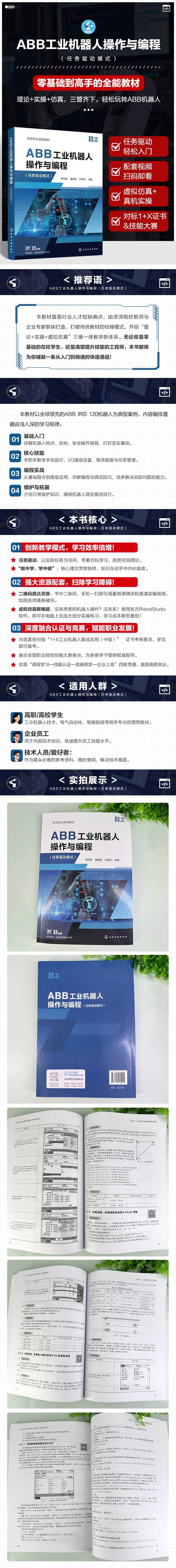 在智能制造浪潮席卷全球的今天,工业机器人作为制造业智能化转型的核心装备,正以前所未有的速度改变着生产模式与产业格局。从汽车制造的精密组装,到电子行业的高速分拣,工业机器人凭借高效、精准、稳定的特性,成为推动产业升级的关键力量。然而,专业技术人才的短缺却成为制约行业发展的瓶颈,编写一本兼具专业性与实用性的工业机器人操作与编程教材,迫在眉睫。本书立足工业机器人技术的实际应用,以;理论+实操+虚拟仿真三轨并行的模式构建知识体系。在内容编排上,遵循从基础认知到高级应用的学习规律,由工业机器人的结构原理、安全操作等基础知识入手,逐步深入到编程调试、系统维护等核心技能。无论是初识工业机器人的初学者,还是渴望精进技术的从业者,都能在书中找到契合自身需求的学习路径。;做中学,学中做是本书的核心理念。每个项目均设置多个实操任务,以ABB IRB120 型工业机器人为典型案例,结合RobotStudio 虚拟仿真软件与真实设备操作,将抽象的理论知识转化为可落地的实践经验。扫描书中二维码,即可获取微课视频、实操演示等丰富的数字资源。这些资源不仅能辅助理解复杂知识点,还打破了时间与空间的限制,让学习更加灵活高效。同时,每章节精心设计的练习题,从理论巩固到项目实战层层递进,帮助读者及时检验学习成果,实现知识的内化与迁移。本书深度融合技能竞赛高职组机器人系统集成应用技术和1+ X 工业机器人集成应用(中级)证书的考核点,并结合岗位要求对高素质技术技能人才的培养需求,着力实现学生;课程教学_技能竞赛_考证_企业上岗的相通培养。本书由赣州职业技术学院邓华军、温学延、卢培文担任主编,赣州职业技术学院温晓珍、段月红、卢愿、宋悦琳,北京华航唯实机器人科技股份有限公司刘自典担任副主编,参与编写的还有赣州职业技术学院朱合钧、梅丽斐、刘景柠、袁学琦、李园海,全书由邓华军统稿。由于编者水平有限,书中难免存在不足之处,恳请广大读者批评指正,共同推动工业机器人教育事业的发展。