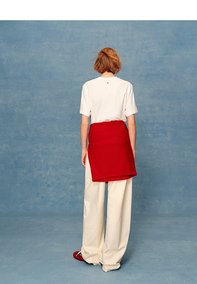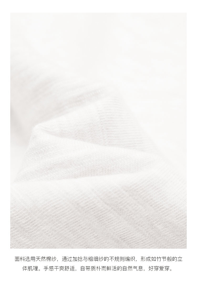 面料选用天然棉纱,通过加捻与粗细纱的不规则编织,形成如竹节般的立体肌理。手感干爽舒适,自带质朴而鲜活的自然气息,好穿爱穿。