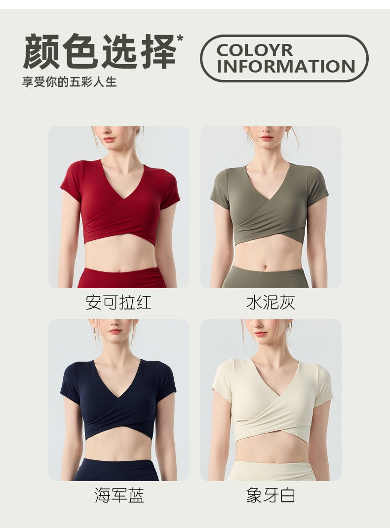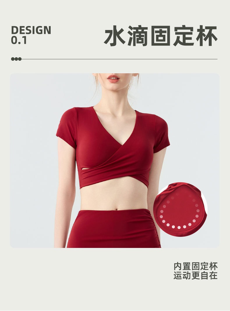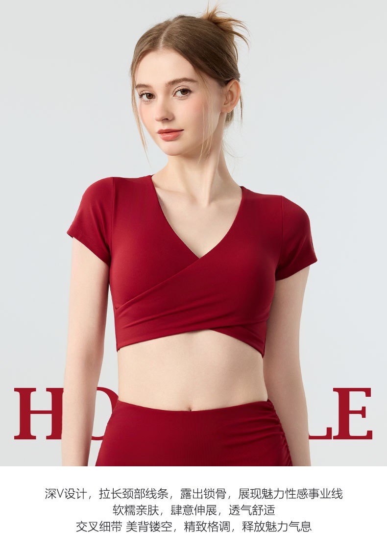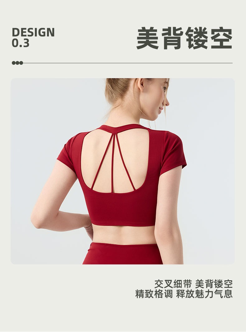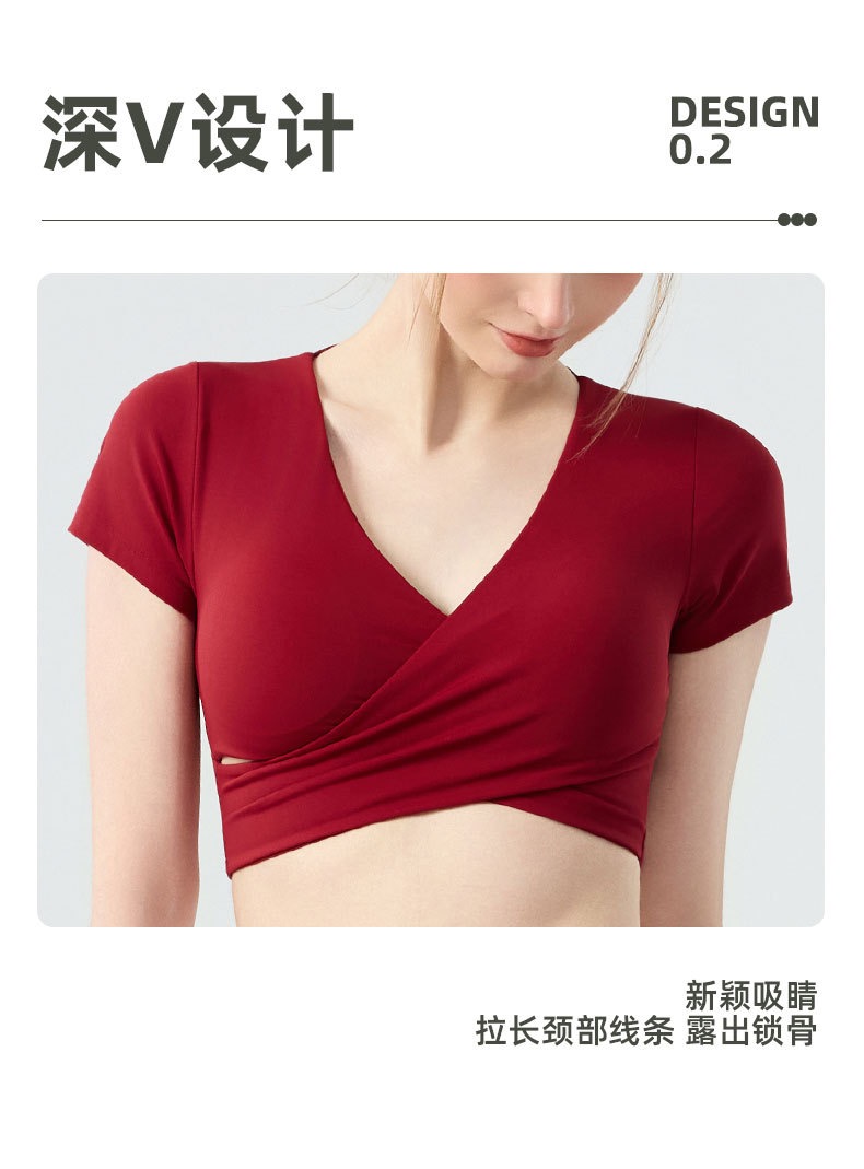新款带胸垫v领瑜伽短袖女 外穿裸感收腹美背普拉提训练健身上衣瑜伽服BMMZ443