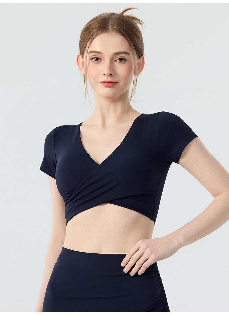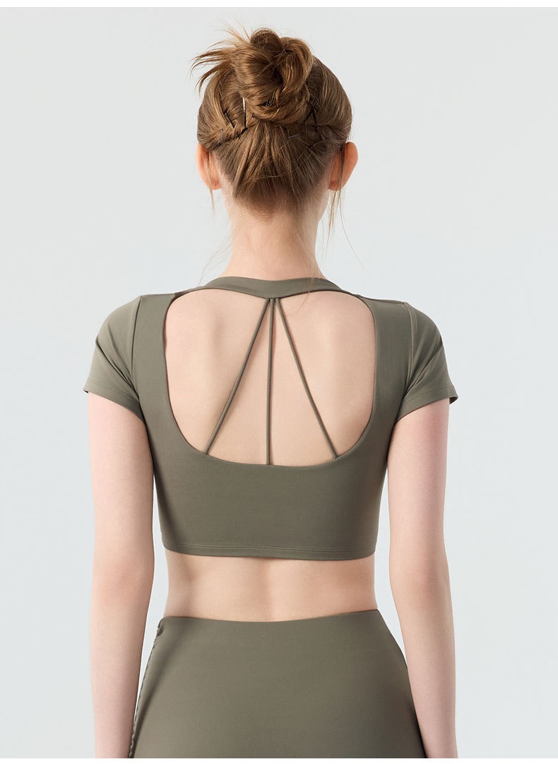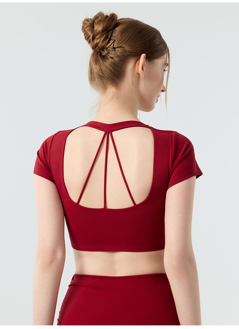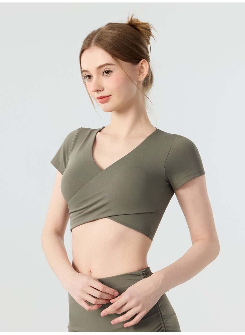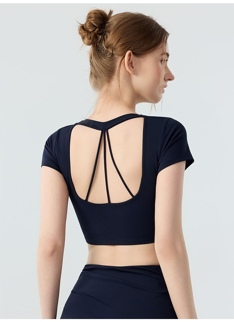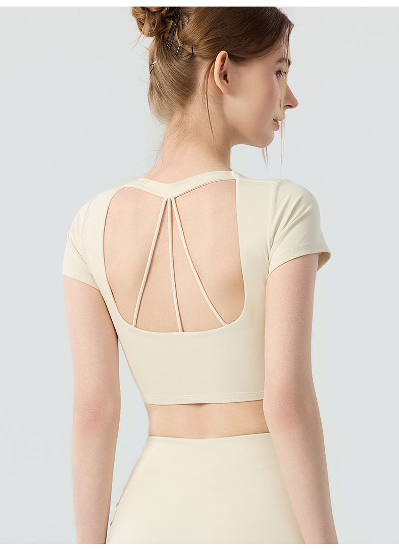 新款带胸垫v领瑜伽短袖女 外穿裸感收腹美背普拉提训练健身上衣瑜伽服BMMZ443