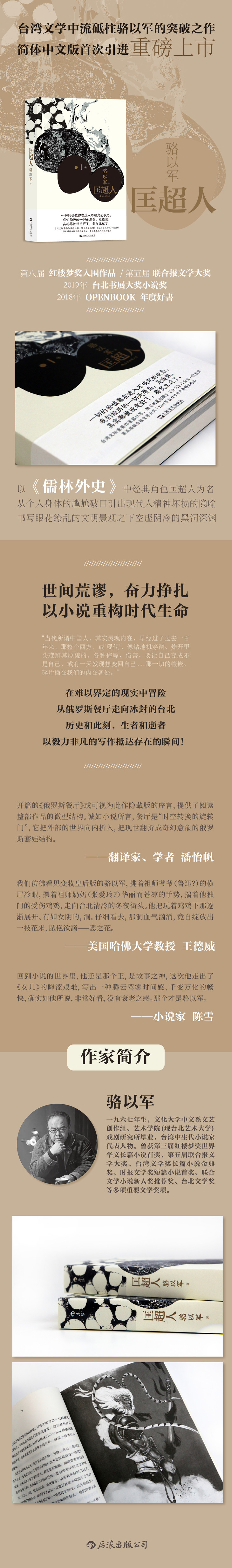 《匡超人》是体现了骆以军的圆熟书写经验及丰沛创作力的集大成之作,是骆以军继《西夏旅馆》《女儿》两部代表作之后,在生涯创作高峰期接连写出的第三部巨作,并以此书获得多个重磅奖项。