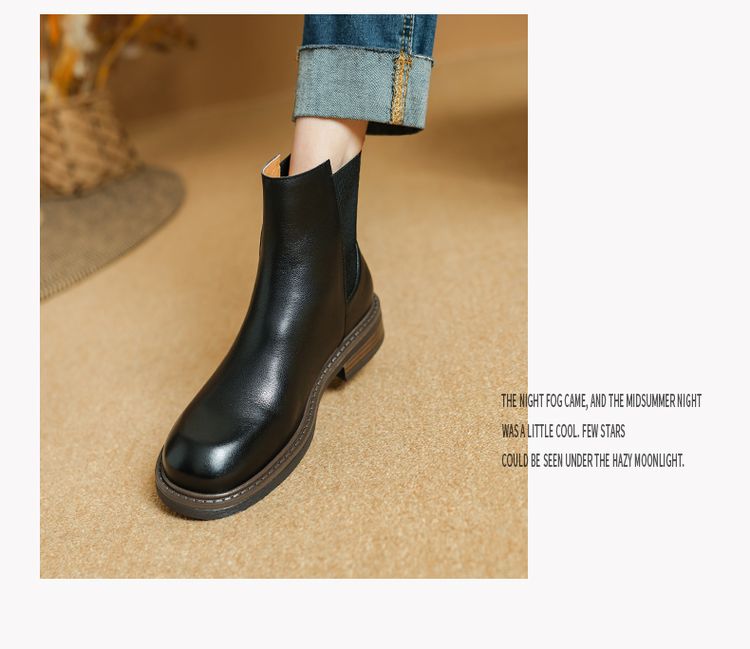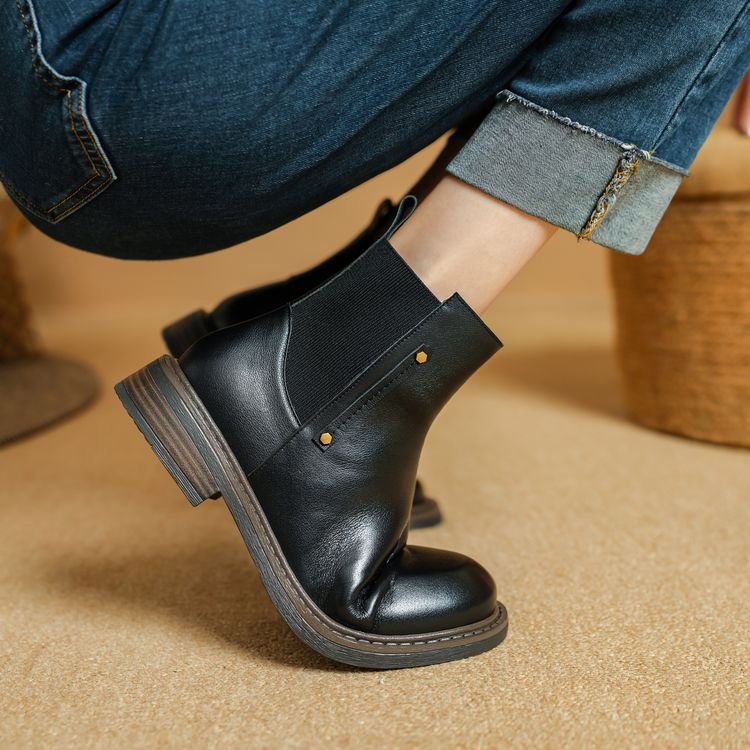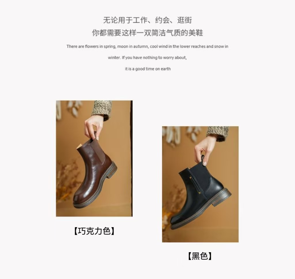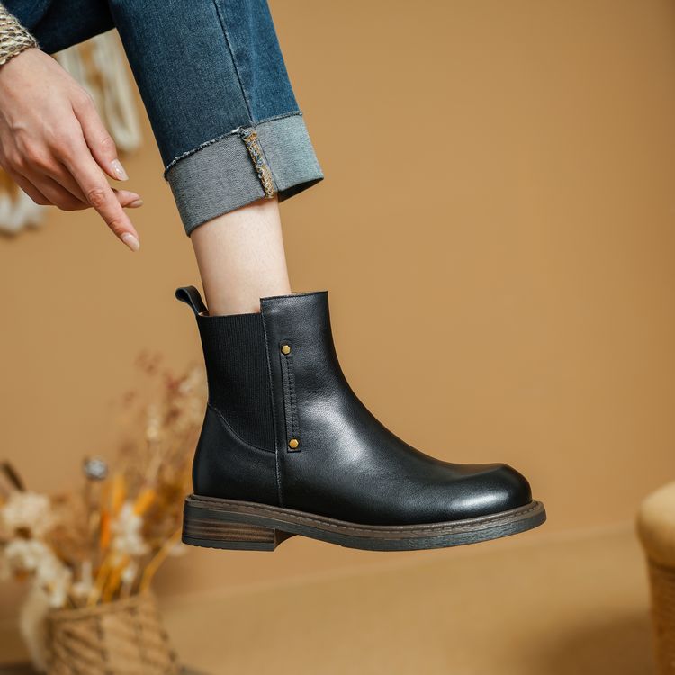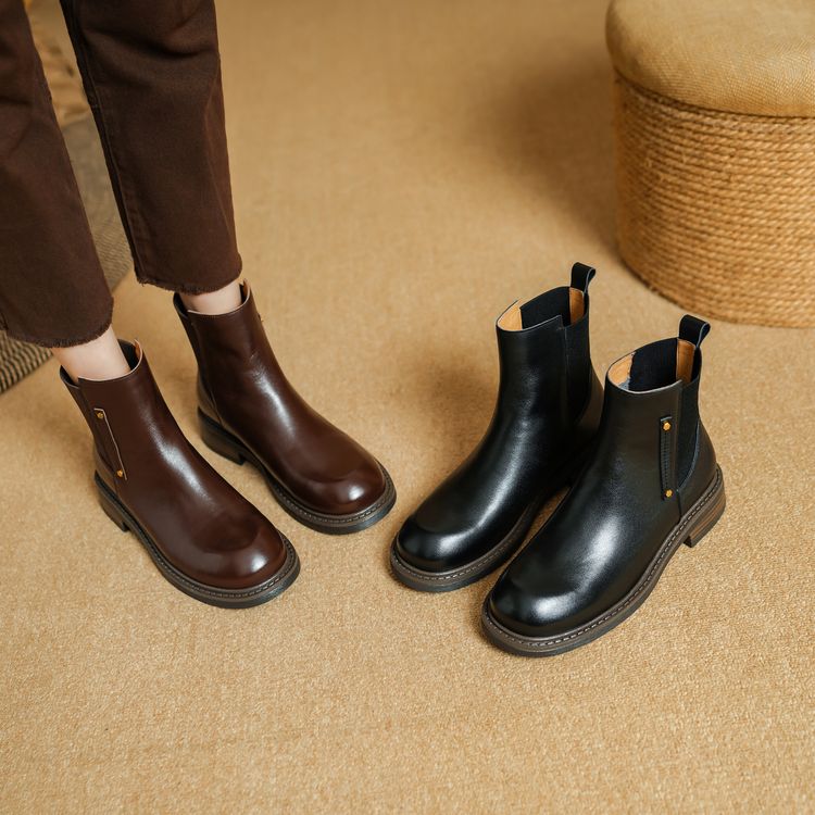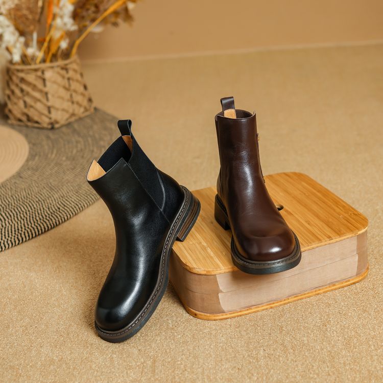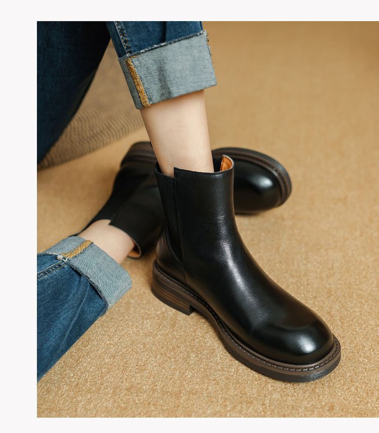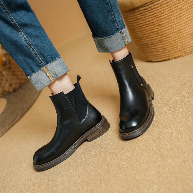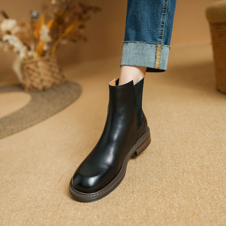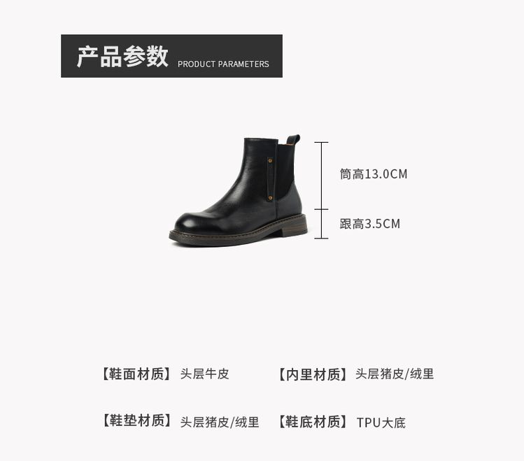 【预售5天】通勤质感十足牛皮切尔西靴短靴,粗低跟圆头短靴女猪皮垫松紧马丁靴PS&PS2306