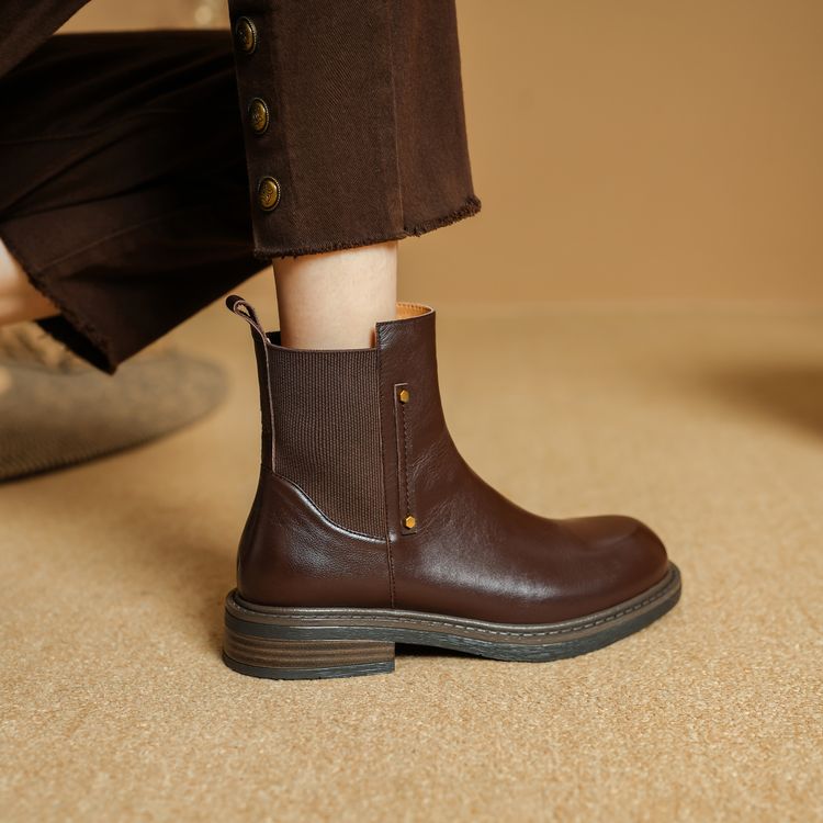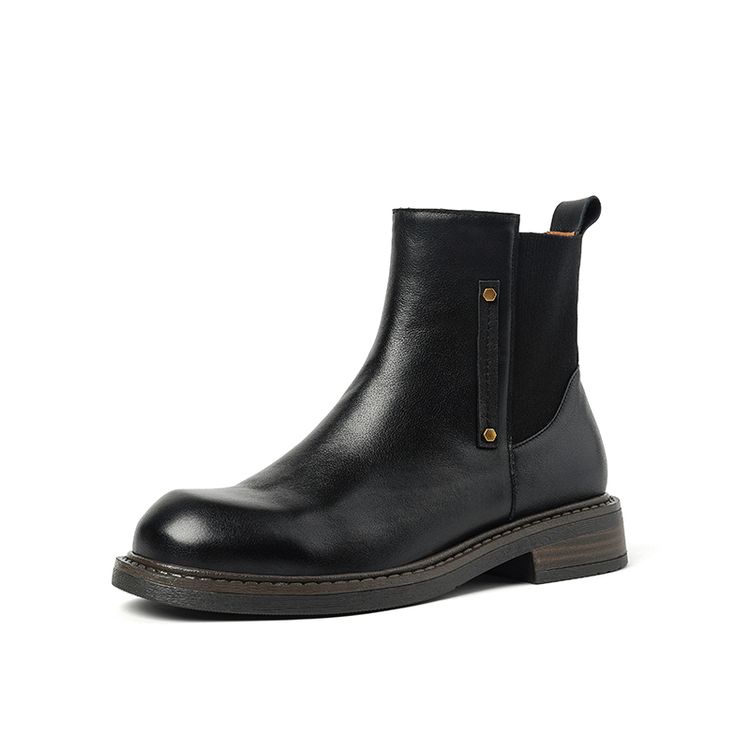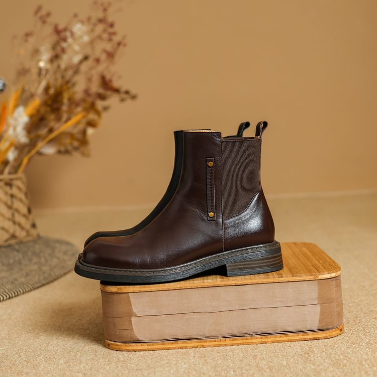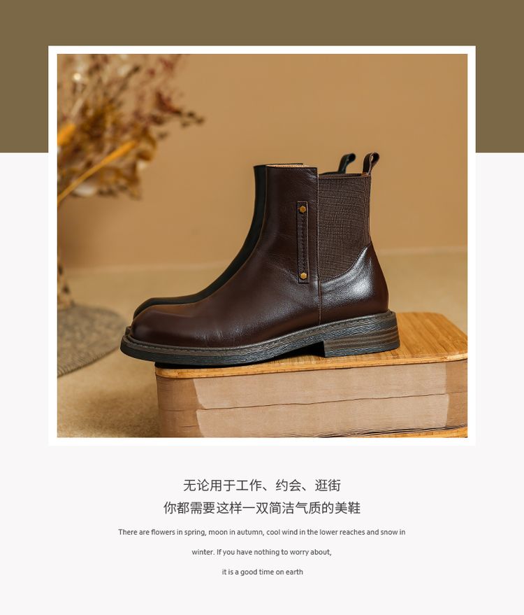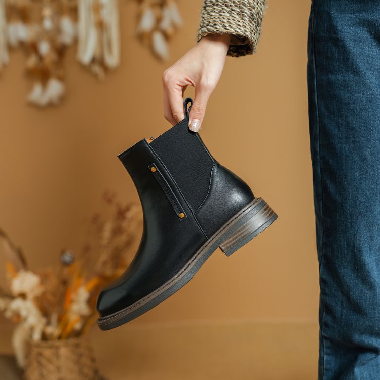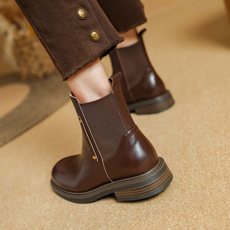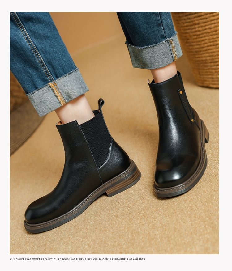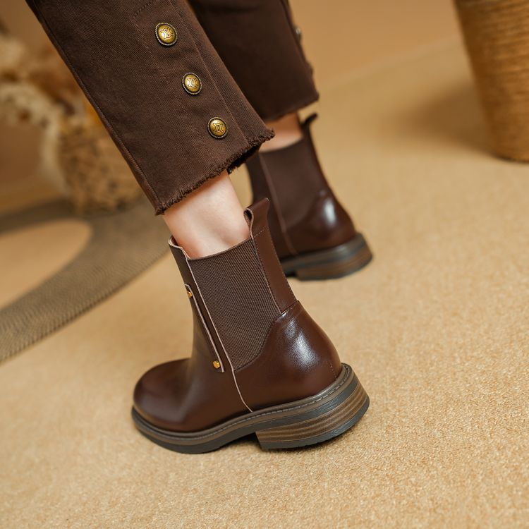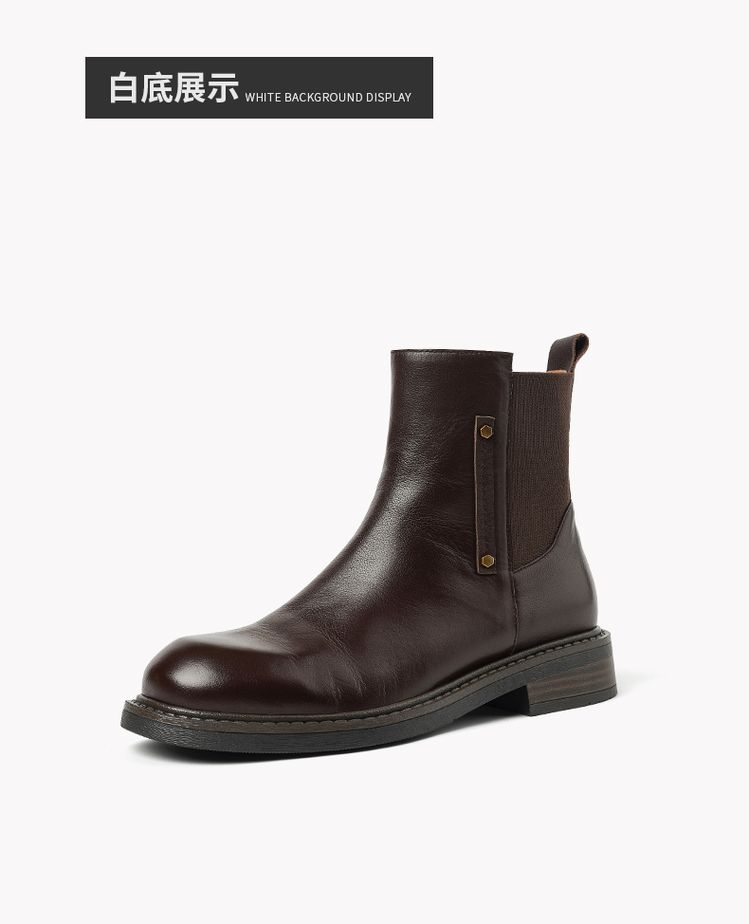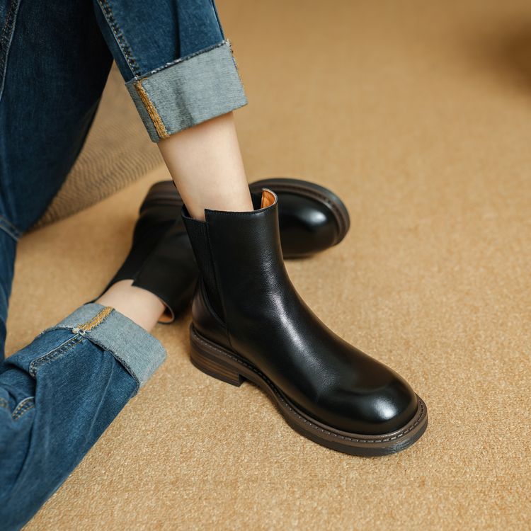 【预售5天】通勤质感十足牛皮切尔西靴短靴,粗低跟圆头短靴女猪皮垫松紧马丁靴PS&PS2306
