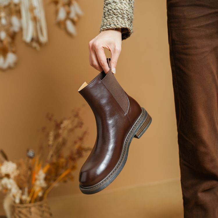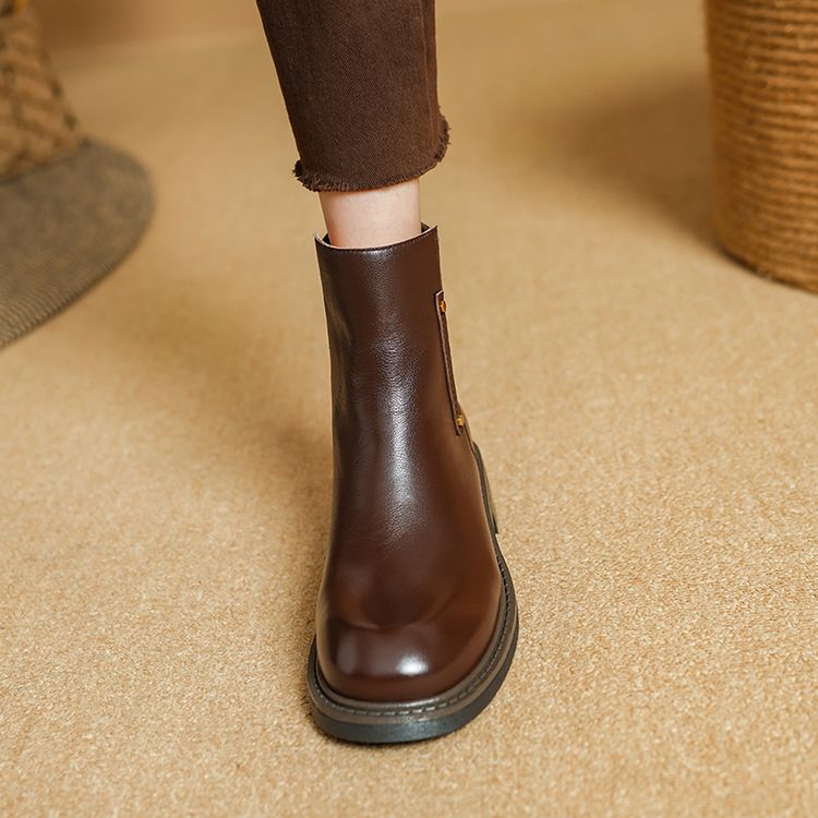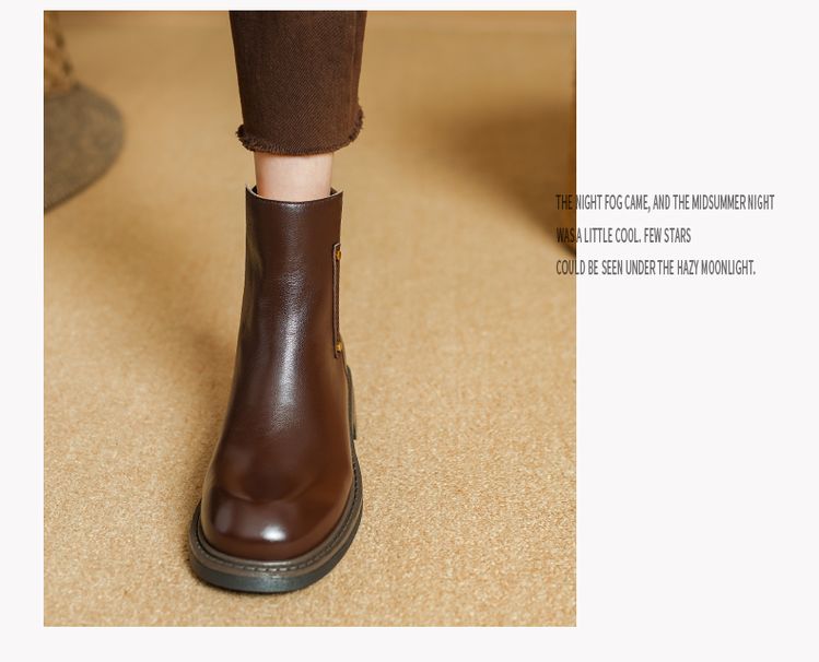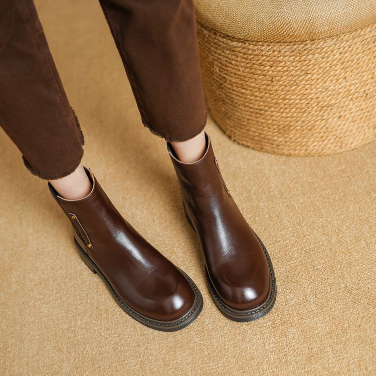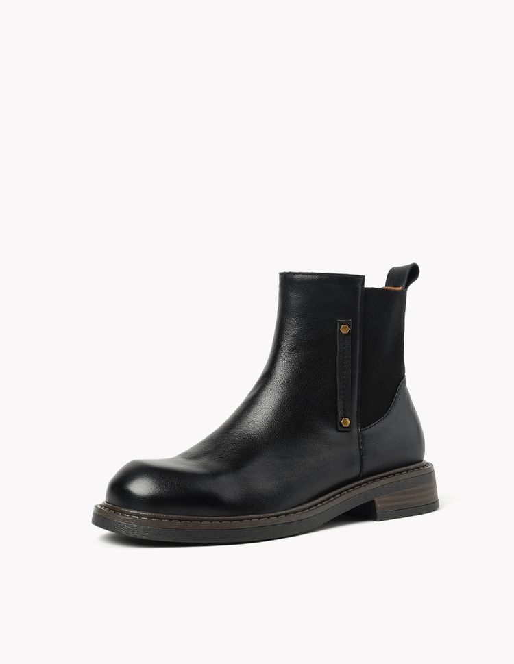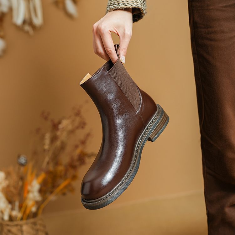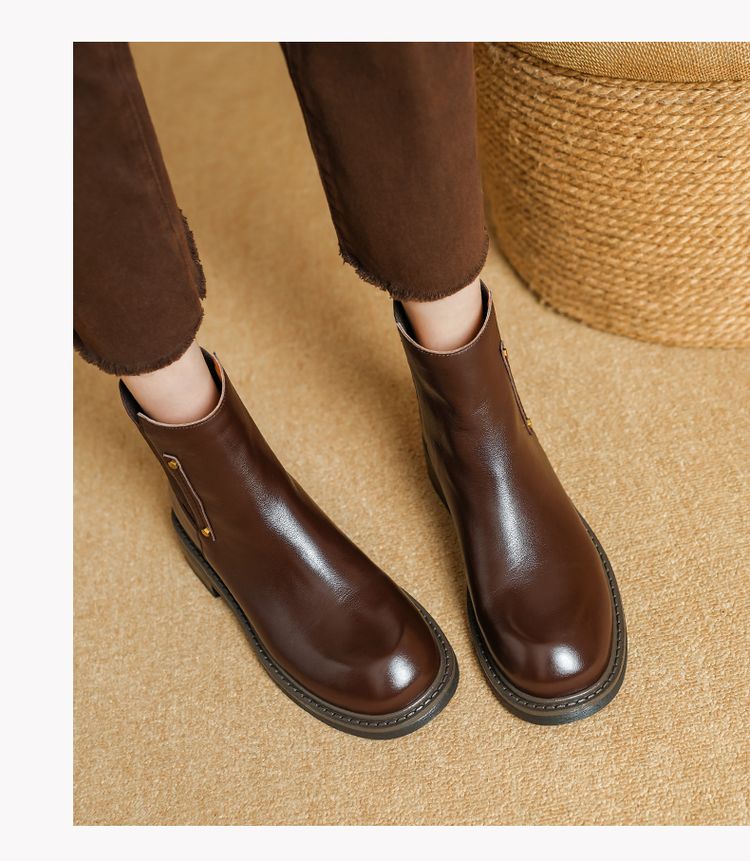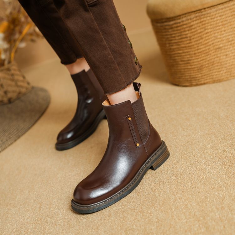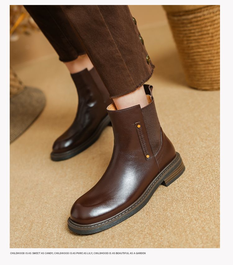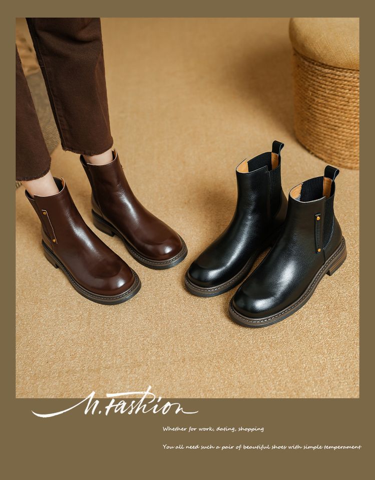 【预售5天】通勤质感十足牛皮切尔西靴短靴,粗低跟圆头短靴女猪皮垫松紧马丁靴PS&PS2306