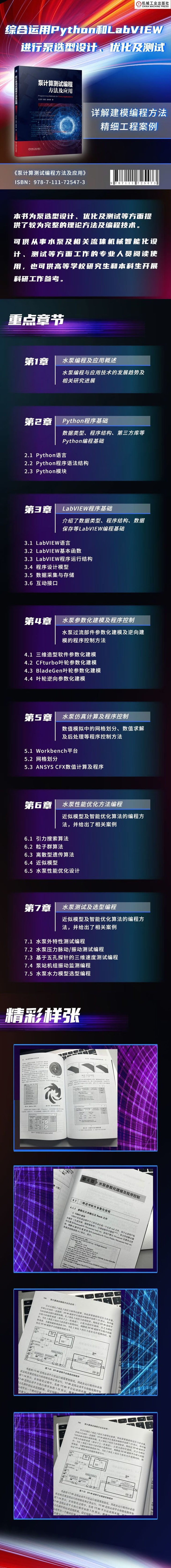 本书为泵选型设计、优化及测试等方面提供了较为完整的理论方法及编程技术,全书共7章。第1章介绍了水泵编程与应用技术的发展趋势及相关研究进展。第2章介绍了数据类型、程序结构、第三方库等Python编程基础。第3章介绍了数据类型、程序结构、数据保存等LabVIEW编程基础。第4章介绍了水泵过流部件参数化建模及逆向建模的程序控制方法。第5章介绍了数值模拟中的网格划分、数值求解及后处理等程序控制方法。第6章详细介绍了近似模型及智能优化算法的编程方法,并给出了相关案例。第7章详细介绍了水泵测试、数据分析和水力模型选型方面的编程方法及案例。