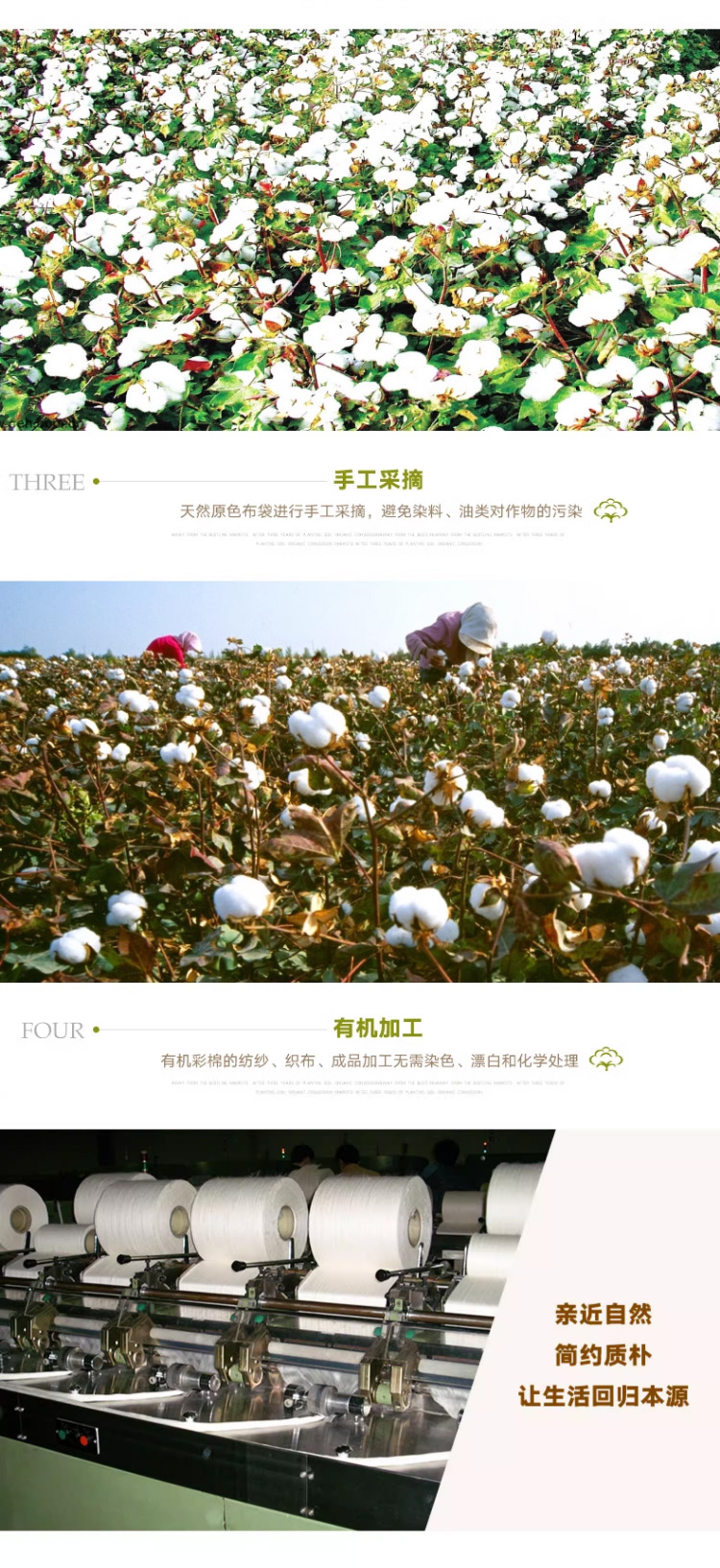 简单来说,原料种植不用化肥农药、不用除草剂、不用落叶剂、不用转基因,纺纱、织造和成品加工全过程不使用有害化学品处理等,遵循国际和国内有机产品生产加工标准和要求,这样生产出来的纺织品就可以叫有机纺织品。
