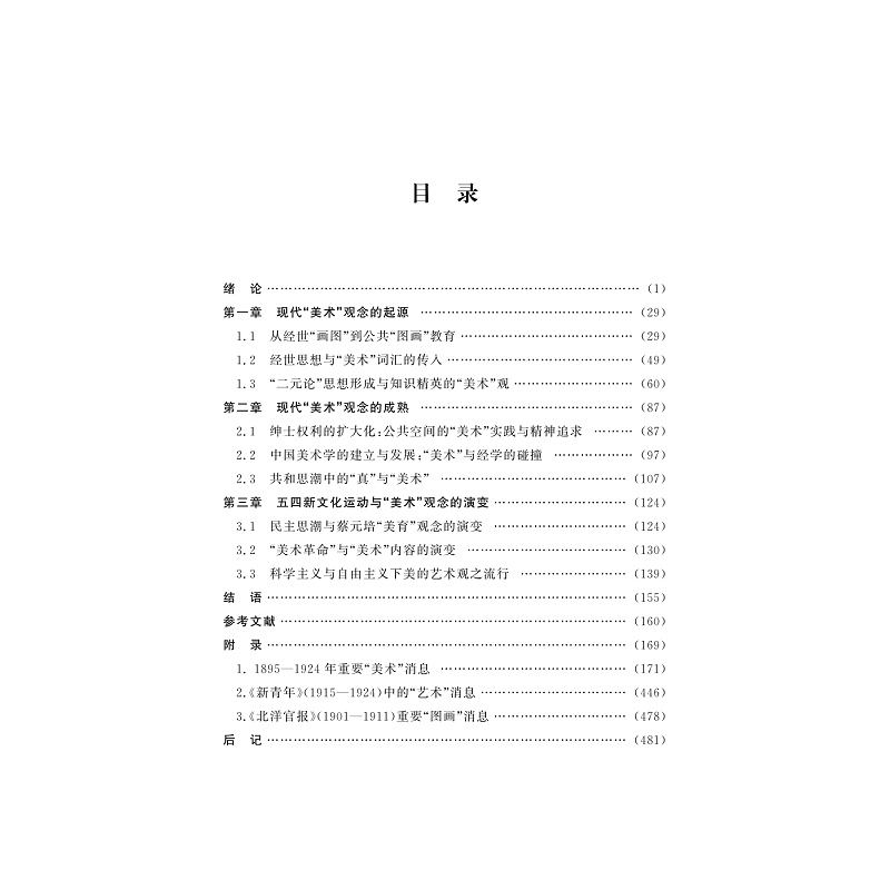 本书研究的是当代“艺术”观念如何形成。是一本以“美术”为关键词切入考察,与思想史结合,运用大数据研究法,经统计与分析后,对“美术”观念的形成并转型为“艺术”观念的研究。首先分析从经世“画图”到公共“图画”教育的过程。其次讨论“美术”观念的成熟。再次分析五四新文化运动与“美术”观念的演变。据此揭示了中国“美术”观念的形成并转型为“艺术”观念的过程,这与中国现代思想形成与转型的大结构是吻合的。本书附录是使用大数据新方法的另一个成果。附录1895-1924年重要“美术”消息,出处约四十余种期刊,将包含有“美术”一词的上下文例句罗列出来,是研究近现代“美术”观念形成和演变的重要史料。