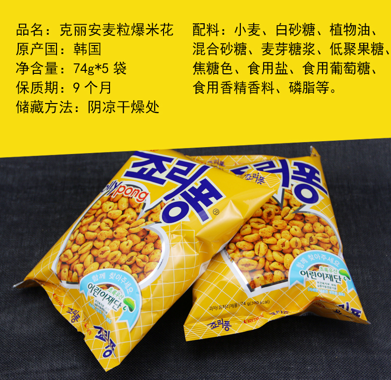 【韩国进口食品】零食crown克丽安大麦粒 袋爆米花膨化浓香粗粮 74g/袋