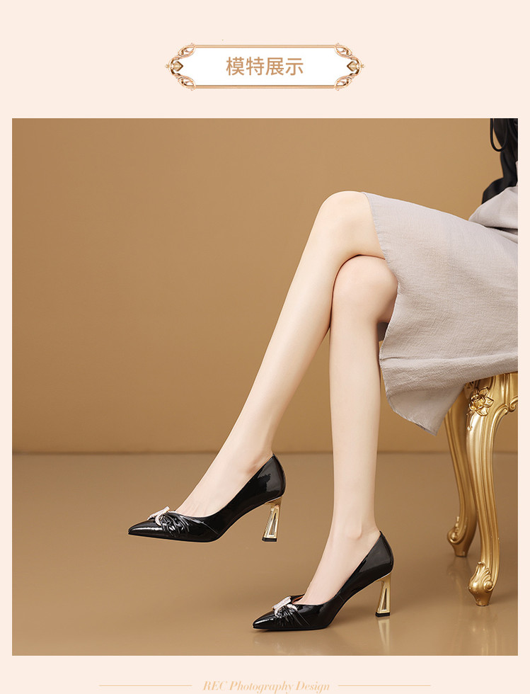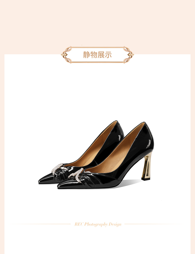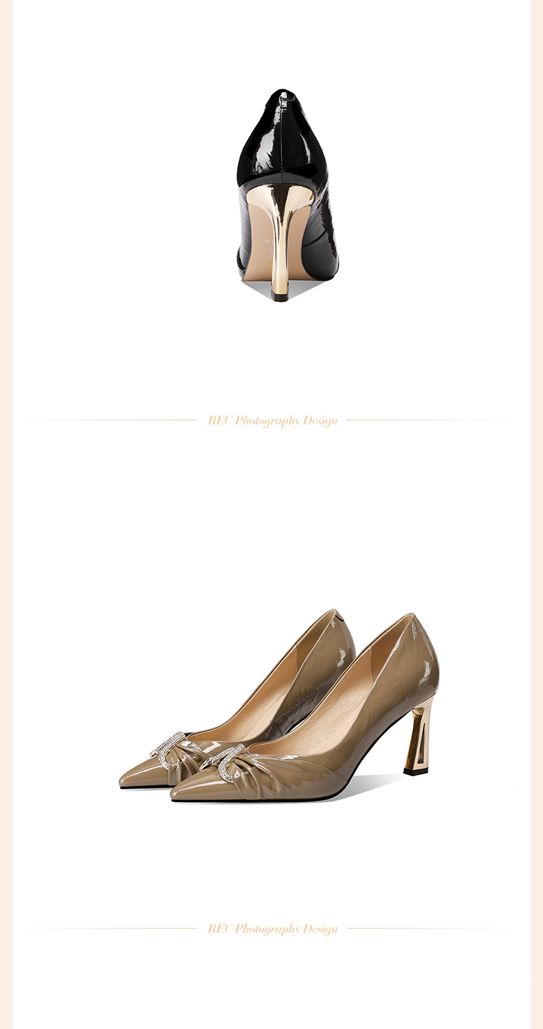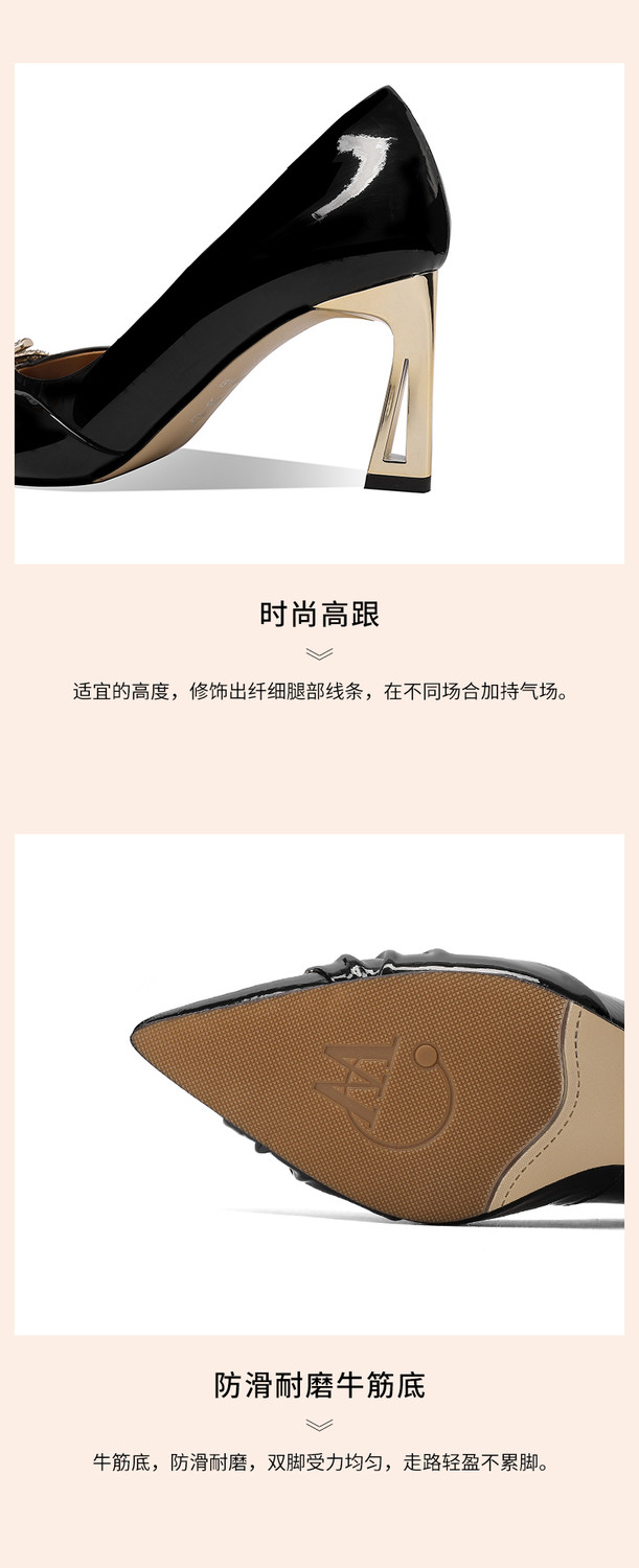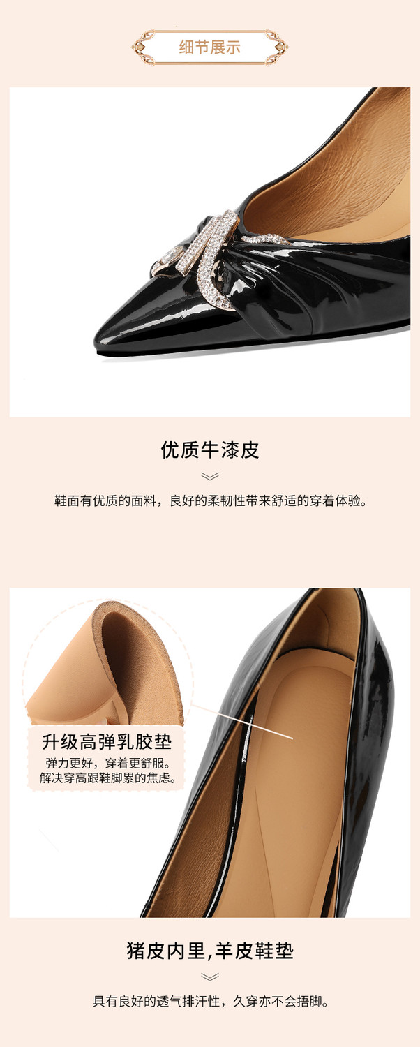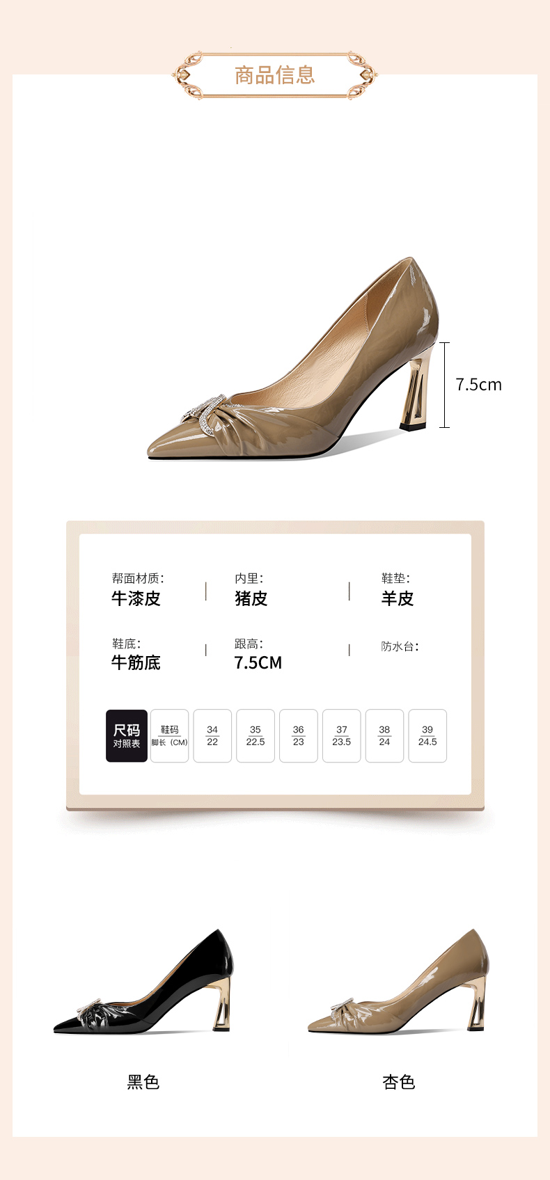 【货 号】H3643【鞋面材质】牛漆皮【垫脚-里皮】羊皮垫+猪皮里【鞋底材料】耐磨牛筋底【跟 高】7.5cm(电镀跟)【颜 色】黑色、杏色【尺 码】33-43(大小定制不退换)