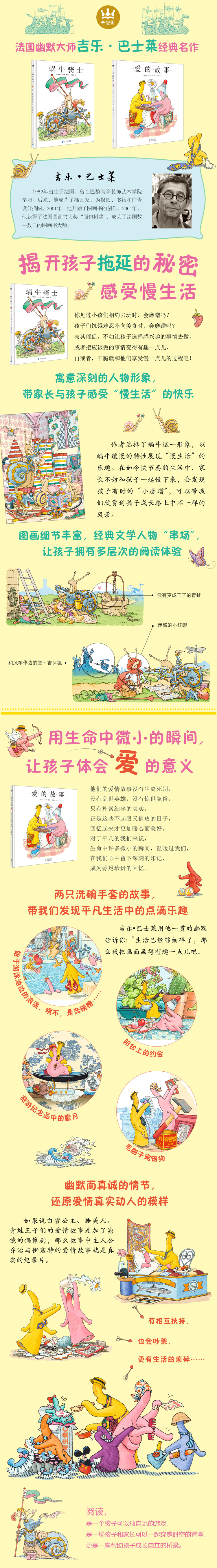 法国精选拖延症治愈图画书,法国图画书大师名作 图画细节丰富、故事中穿插着故事 寓意深刻,选择了蜗牛这样独特而有代表性的动物来阐述观点 故事并没有一个单一的结局,而是用发散性的思维方式带给大家更多的思考 |