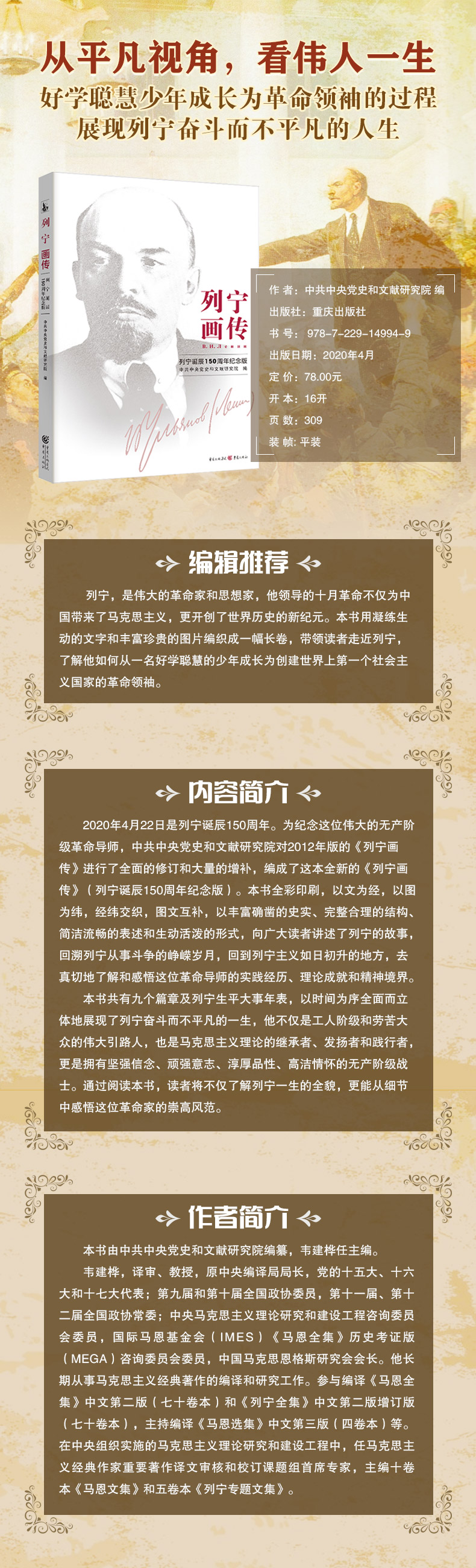 2020年4月22日是列宁诞辰150周年。为纪念这位伟大的无产阶级革命导师,中共中央党史和文献研究院对2012年版的《列宁画传》进行了全面的修订和大量的增补,编成了这本全新的《列宁画传》(列宁诞辰150周年纪念版)。本书全彩印刷,以文为经,以图为纬,经纬交织,图文互补,以丰富确凿的史实、完整合理的结构、简洁流畅的表述和生动活泼的形式,向广大读者讲述了列宁的故事,回溯列宁从事斗争的峥嵘岁月,回到列宁主义如日初升的地方,去真切地了解和感悟这位革命导师的实践经历、理论成就和精神境界。