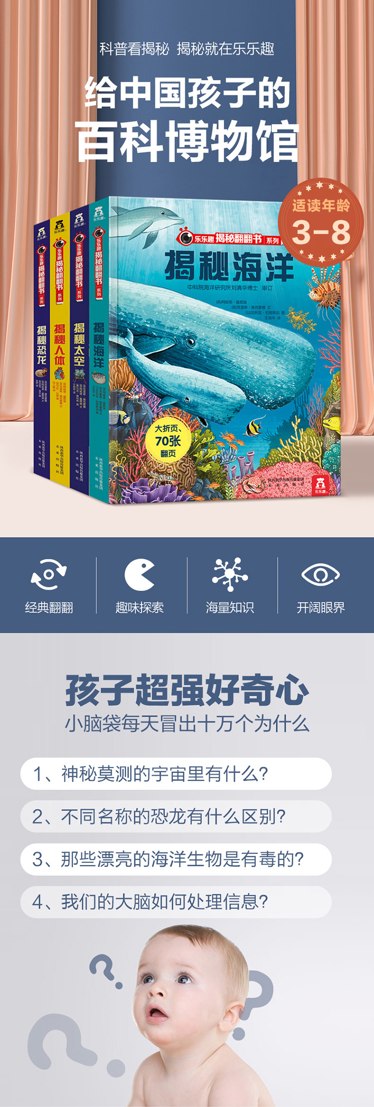 3-8岁趣味科普书-乐乐趣揭秘翻翻书系列(共4册)四大主题:太空、海洋、人体、恐龙