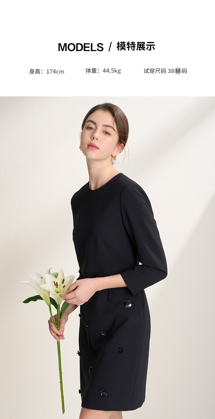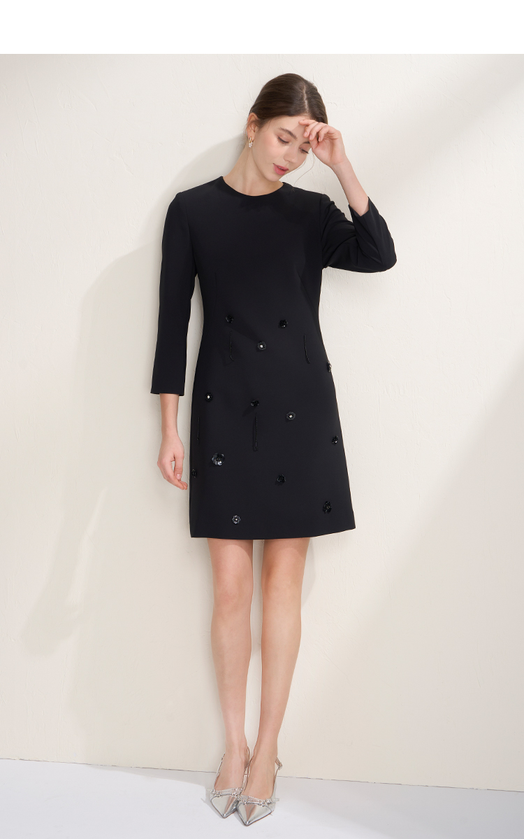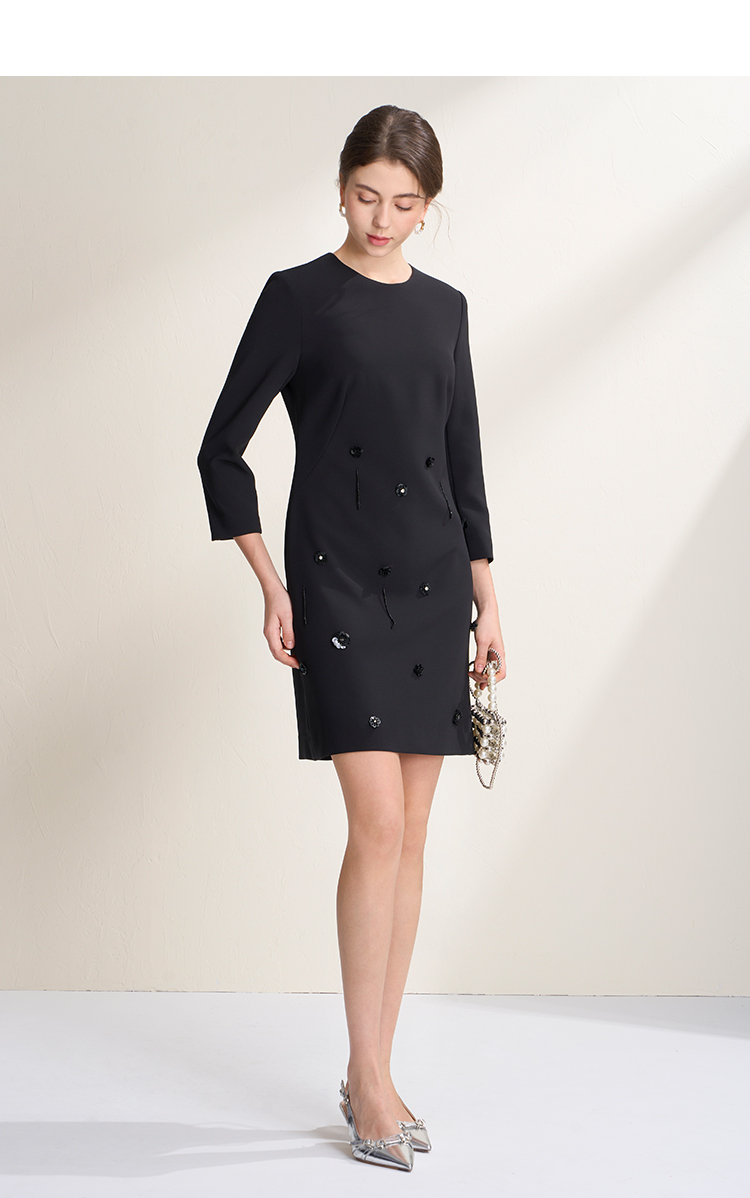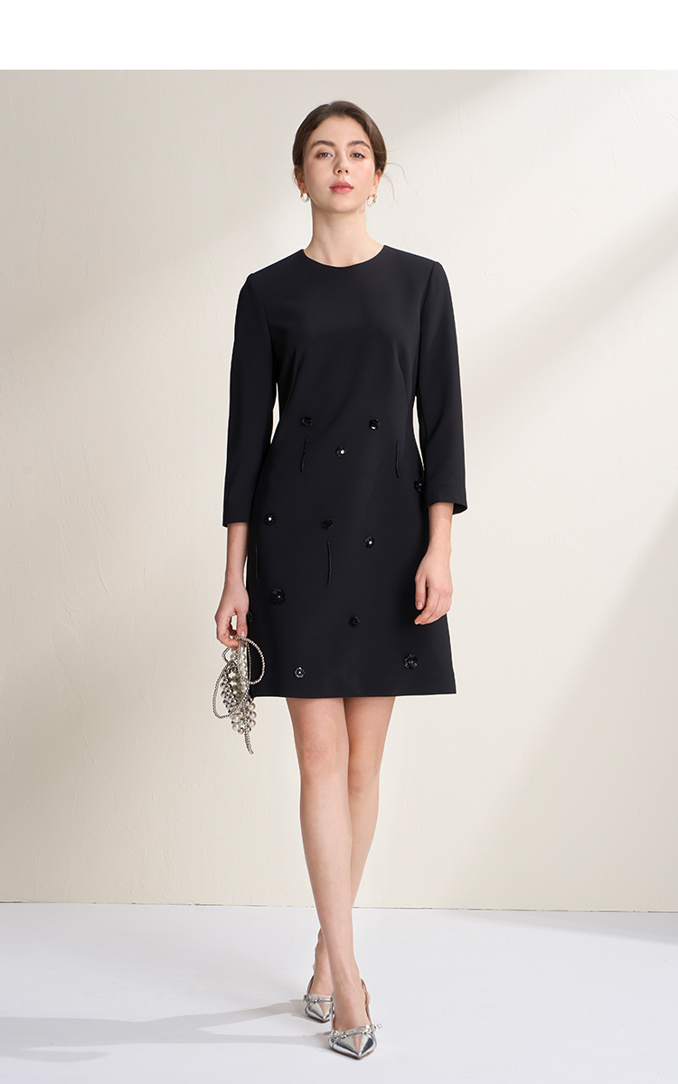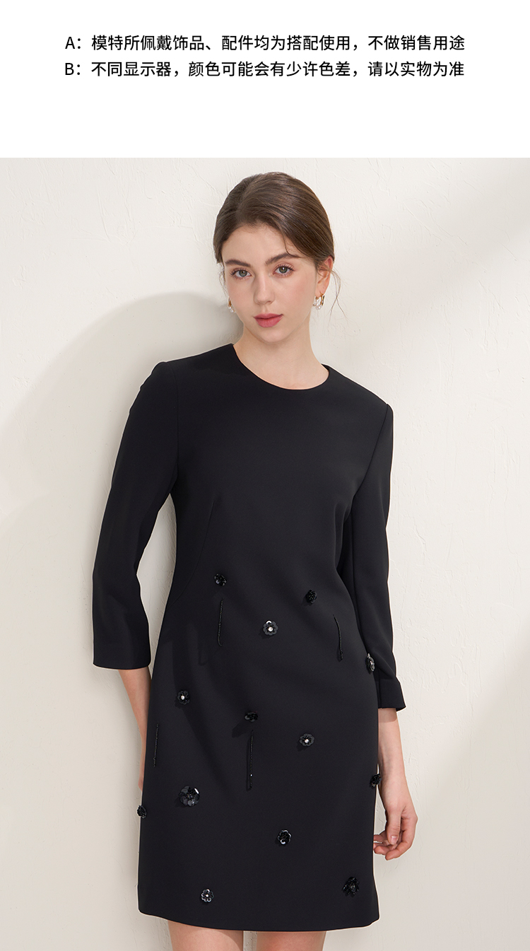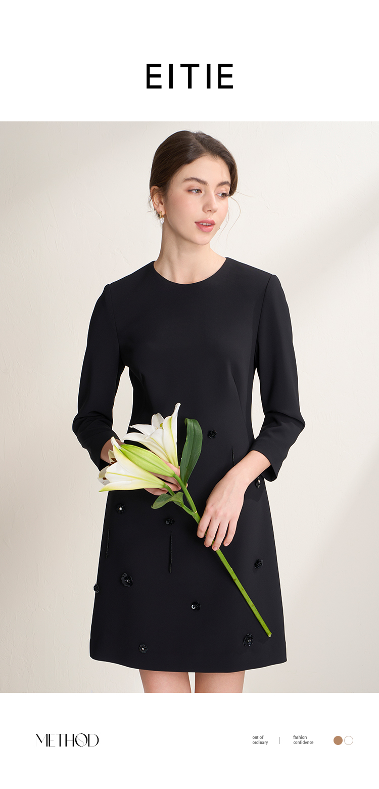EITIE爱特爱气质圆领黑色亮片花朵装饰八分袖显瘦2026年春季新款连衣裙A2607133