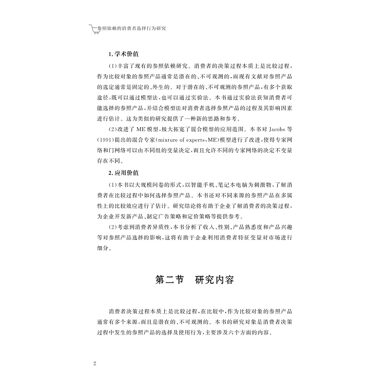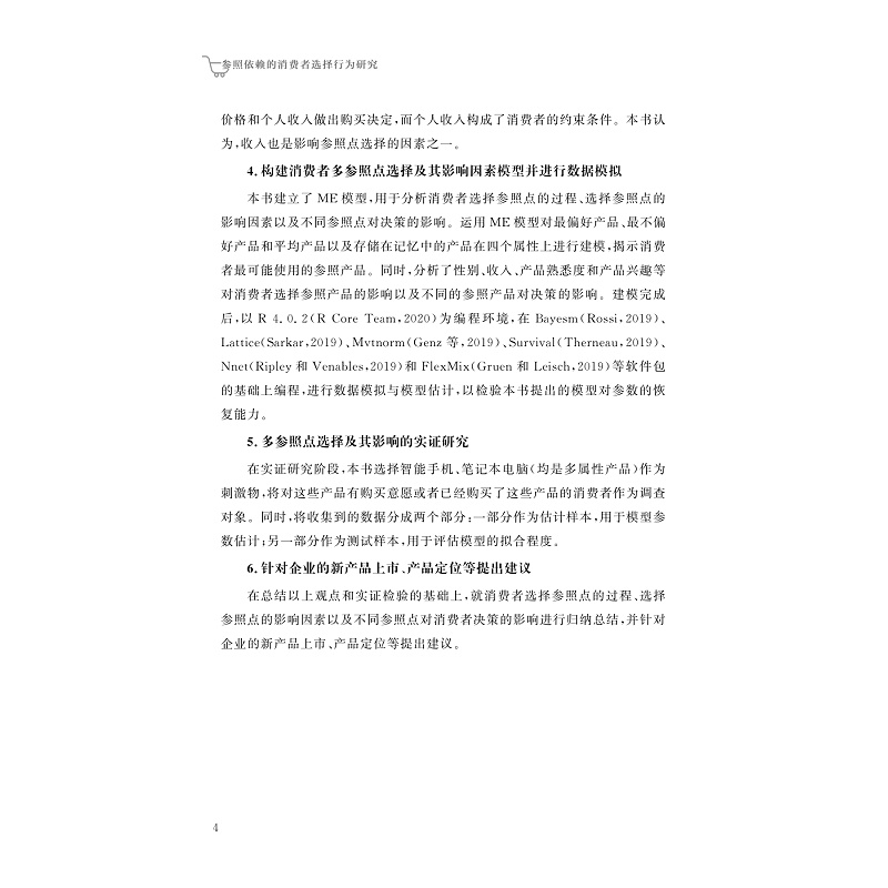 本书为于国家社科基金一般项目“基于大数据的消费者多参照点选择及其影响的研究”(项目号:16BGL087)成果。本书主要内容如下:建立混合专家模型,评估参照点效应对消费者决策的影响和评估消费者参照点选择上是否存在差异;通过实证研究,分析比较消费者参照点的选择过程、消费者选择参照点时考虑的因素,以及参照点对选择决策的影响;同时,在理论和实证的基础上,为企业在产品线设计、新产品开发、产品细分及定价等策略提出建议。