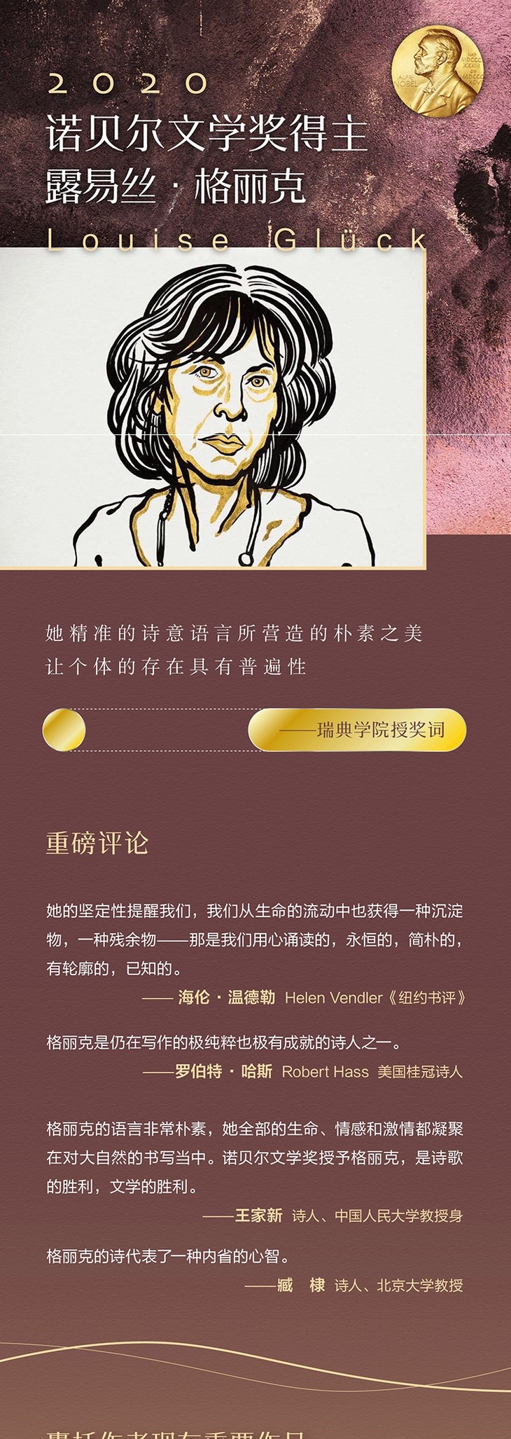 露易丝·格丽克是2020年诺贝尔文学奖、普利策奖、美国国家图书奖等众多文学大奖得主,享誉诗坛已久,作品首度引进。