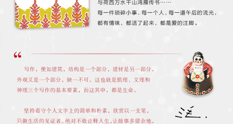《稻草人手记》是三毛定居加纳利群岛时的生活记录。她离开时局动荡的撒哈拉,寻到了心中的梦幻家园,回归于作为妻子、儿媳、女儿的日常。大胡子荷西、亲爱的婆婆大人、恼人的卖花女、小巨人达尼埃……每一日围绕身边的各色人物,帮她筑起了多彩的生活。她以妙笔捕捉各种生活趣味,每一件琐碎小事、每一个人、每一道午后的流光,都有情味,都活了起来,都是爱的注脚。