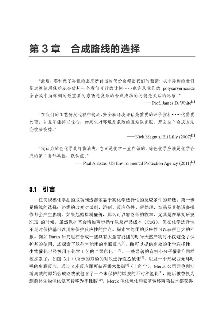 近期的文献十分强调绿色化学。近几十年来,化学家和工程师们一直努力减少浪费,降低成本制造,并设计大规模生产及常规的原料药制造过程中的安全措施。把这些因素与其他因素结合作为“绿色化学”,能够推进工艺化学的发展。绿色化学的例子贯穿在整本书中。我期待有一天绿色化学能够成为工艺研究的重要部分,而不是我们努力把这些进展贴上绿色化学的标签。