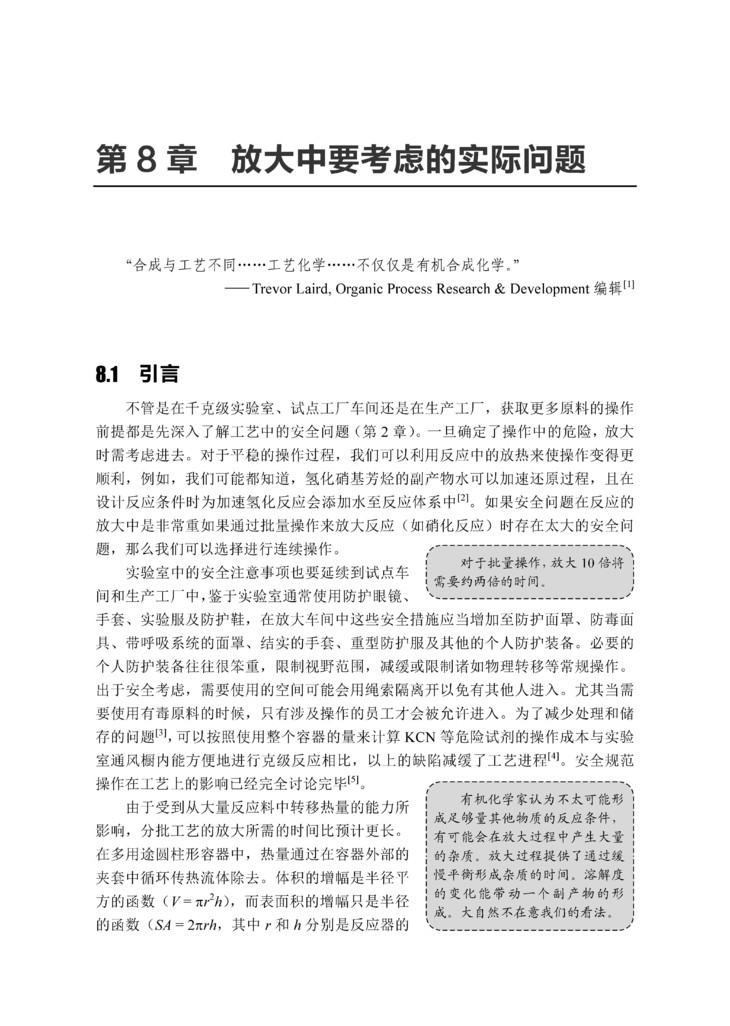 该书对大学的学生和教师意味着什么?他们可以从一个有经验的化学家如Neal Anderson 那里学到什么?首先他们会发现一个相当陌生的以有机化学为基础的章节标题;在前几章中首先强调安全性,这种写法并不常见,但显然作者是借此强调安全在工艺研发中的重要性。最近美国大学发生的几起事故也说明学术界更应该重视这个问题。总之,安全是大规模生产必须重视的第一要素。学生将会了解到危险化学品是可以放大生产的,但更重要的因素是如何放大。