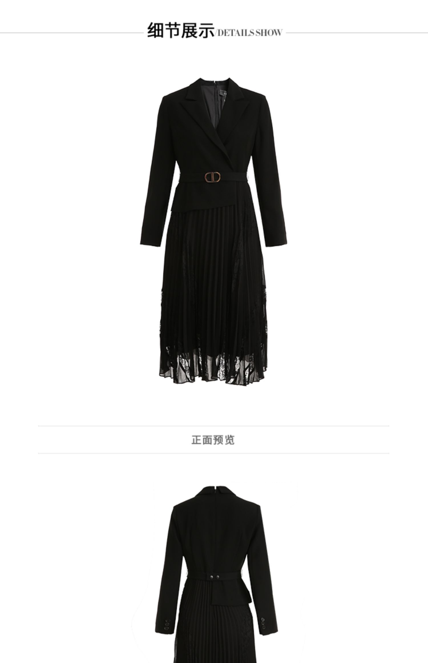EITIE爱特爱春季新款气质翻领时尚通勤收腰拼接百褶连衣裙女6307011