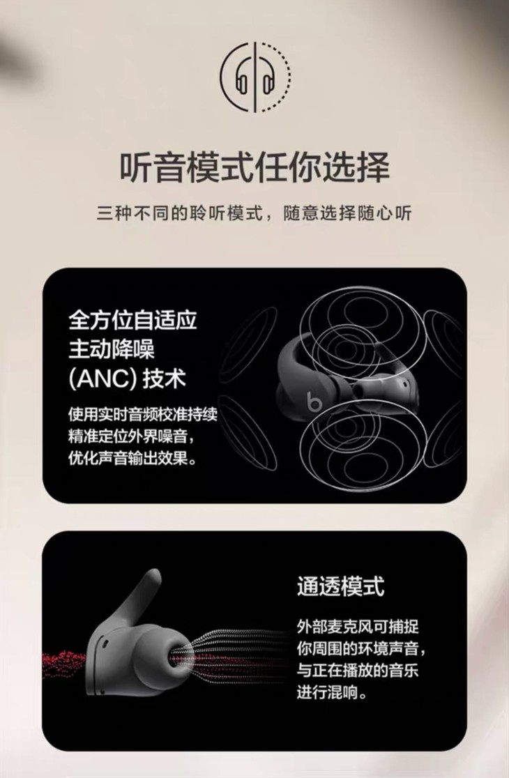 苹果系TWS耳机属于小编到目前的体验中非常接近真实声音的产品,BeatsFitpro同样保持着这一水准,通透模式下摘掉耳机可以达到无缝街接外界声音的效果!