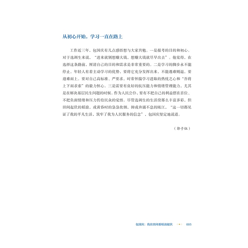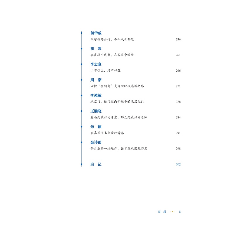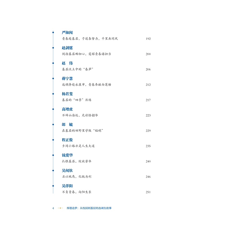 青年人才是党的人才队伍的重要组成部分,深入推进新时代青年人才工作对于确保党和国家事业发展薪火相传、后继有人具有重要的战略意义和现实意义。为深入贯彻学习习近平总书记关于青年人才培养与选拔的重要论述,积极弘扬选调生扎根基层、服务人民的奉献精神,充分发挥选调生在乡村振兴、国家治理现代化中的生力军作用,本书聚焦浙江工业大学输送到社会各个岗位的45名优秀学生,深入挖掘他们毕业后扎根基层一线岗位辛勤奉献、默默耕耘的事迹,通过价值引领、实践锻炼、生活关怀等多个侧面,折射新时代大学生的良好风貌。