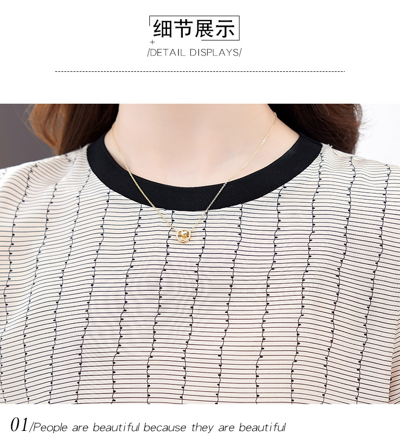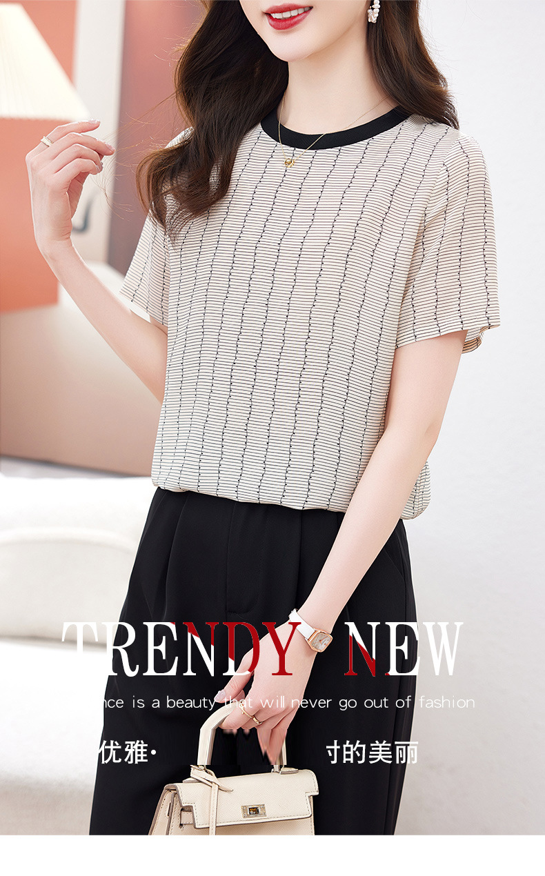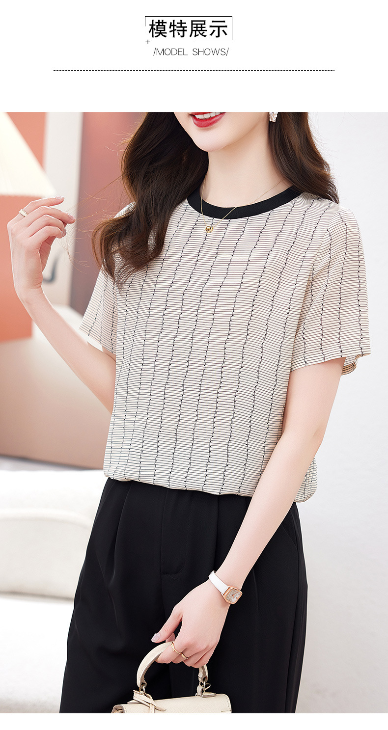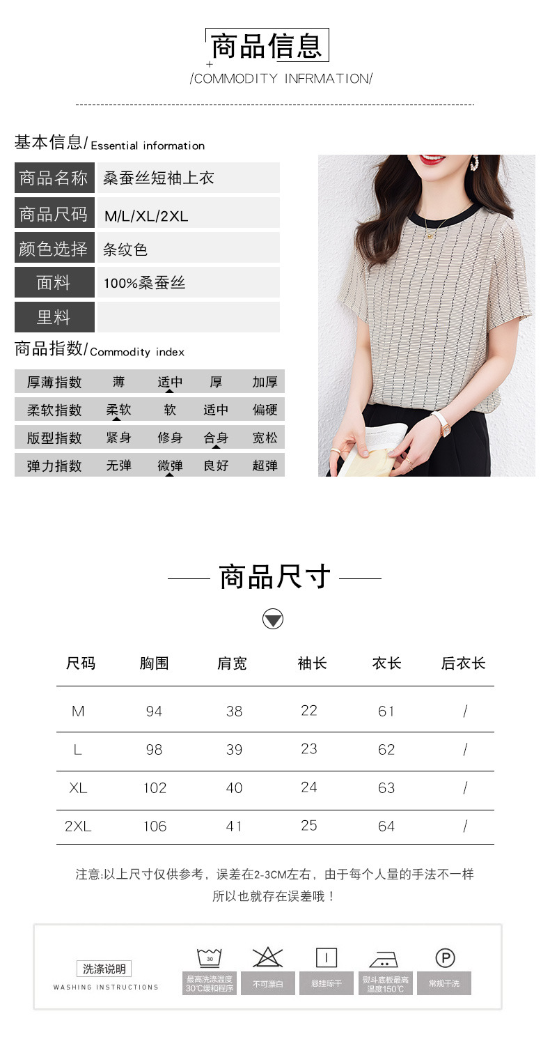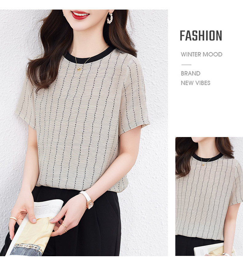KQ-90621大码衣服真丝条纹印花休闲半袖T恤女宽松桑蚕丝上衣短袖t恤女装夏