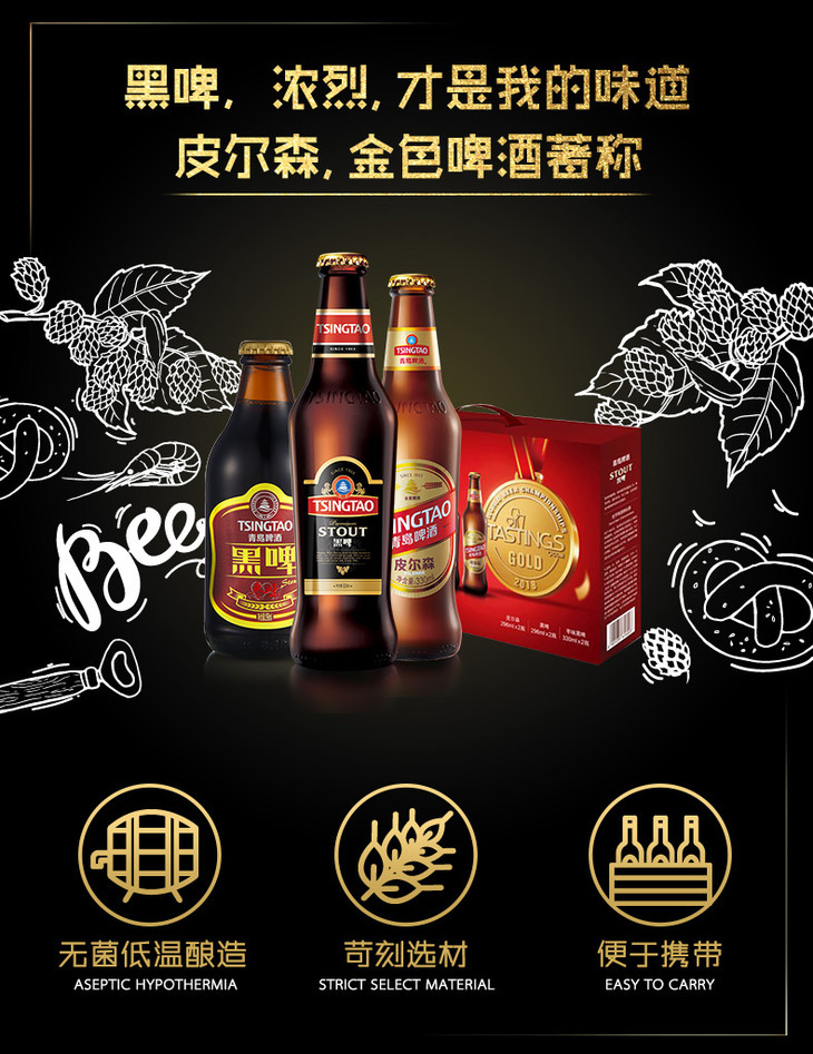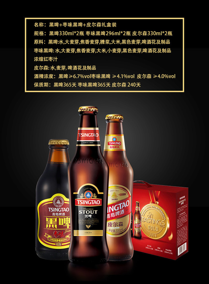 青岛啤酒礼盒皮尔森330*2瓶+黑啤330瓶*2瓶+黑啤枣味296ML*2瓶