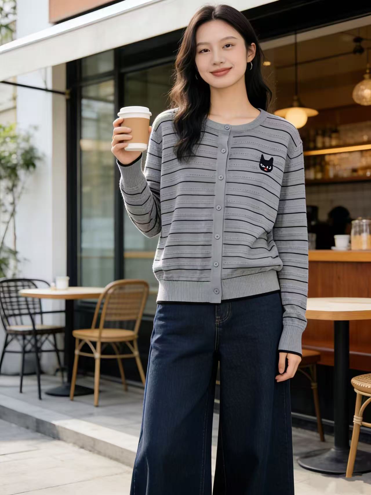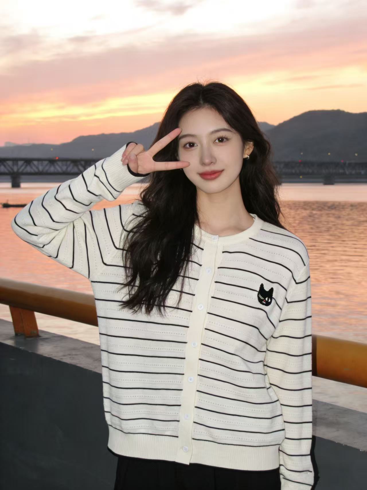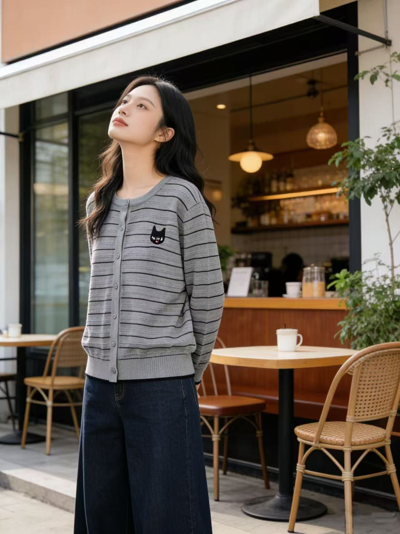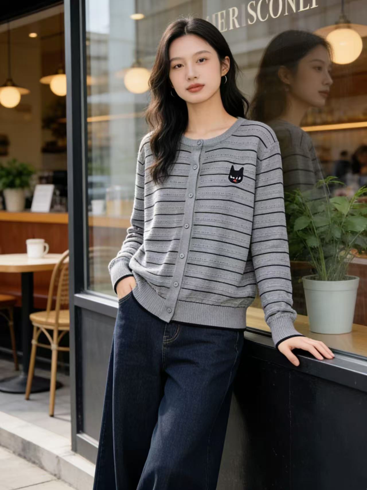 羊毛衫!春薄款!品牌促➡️【自营】衣周期格亿(30%羊毛)6909猫猫刺绣镂空针织条纹羊毛开衫-喜出