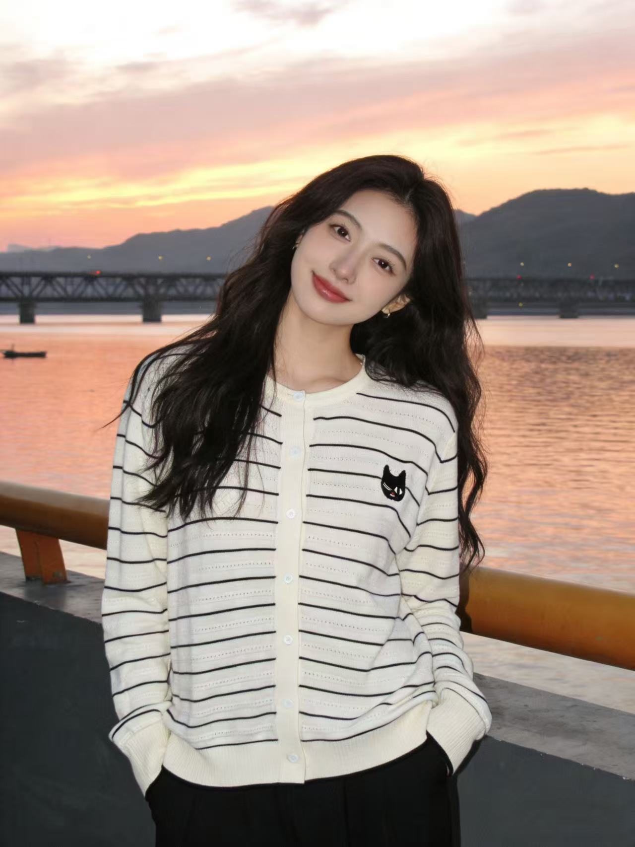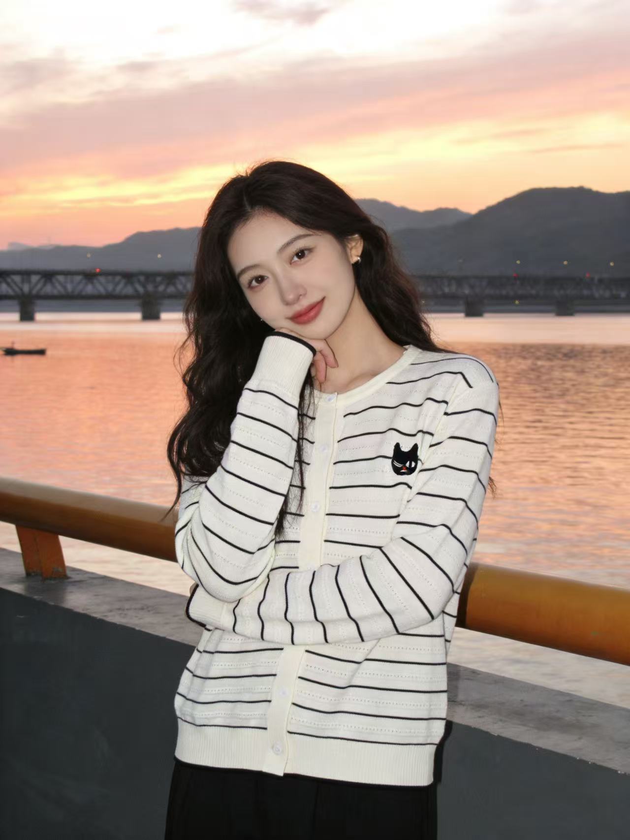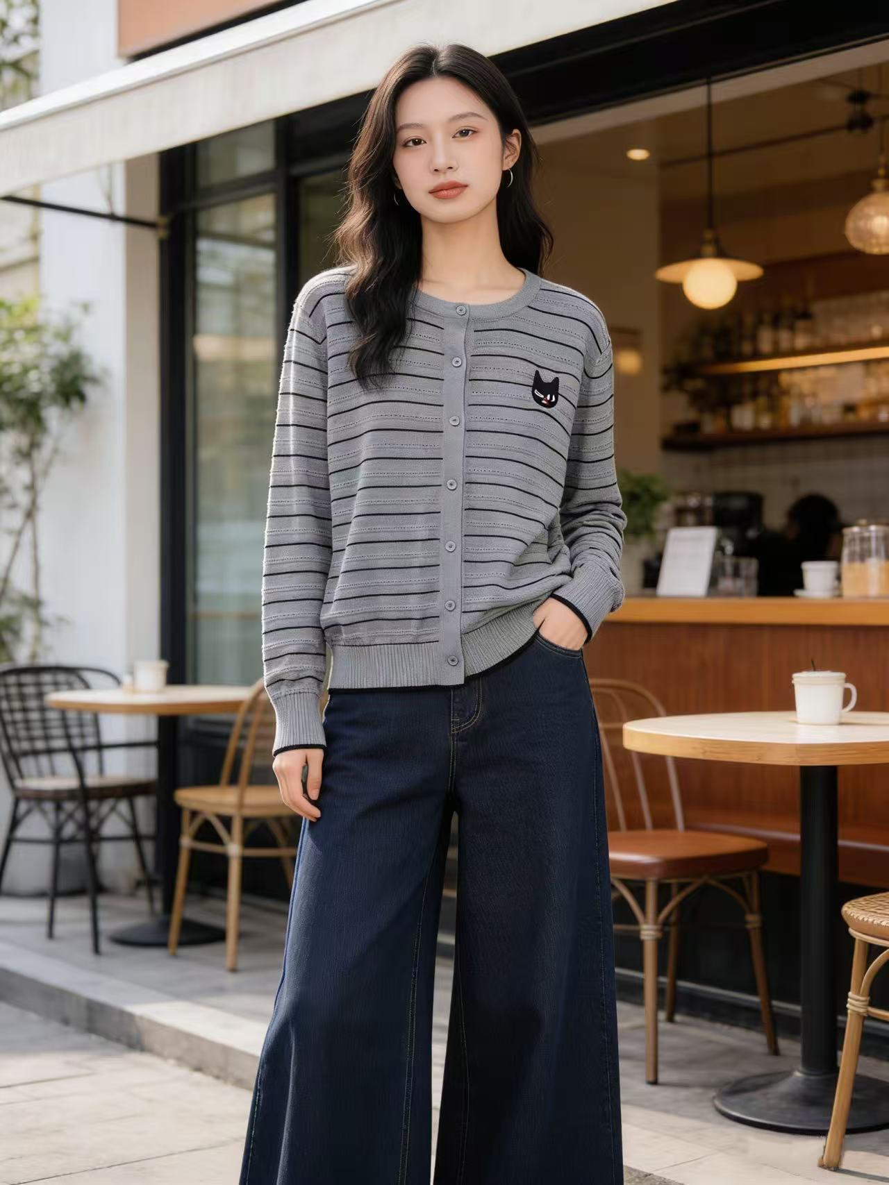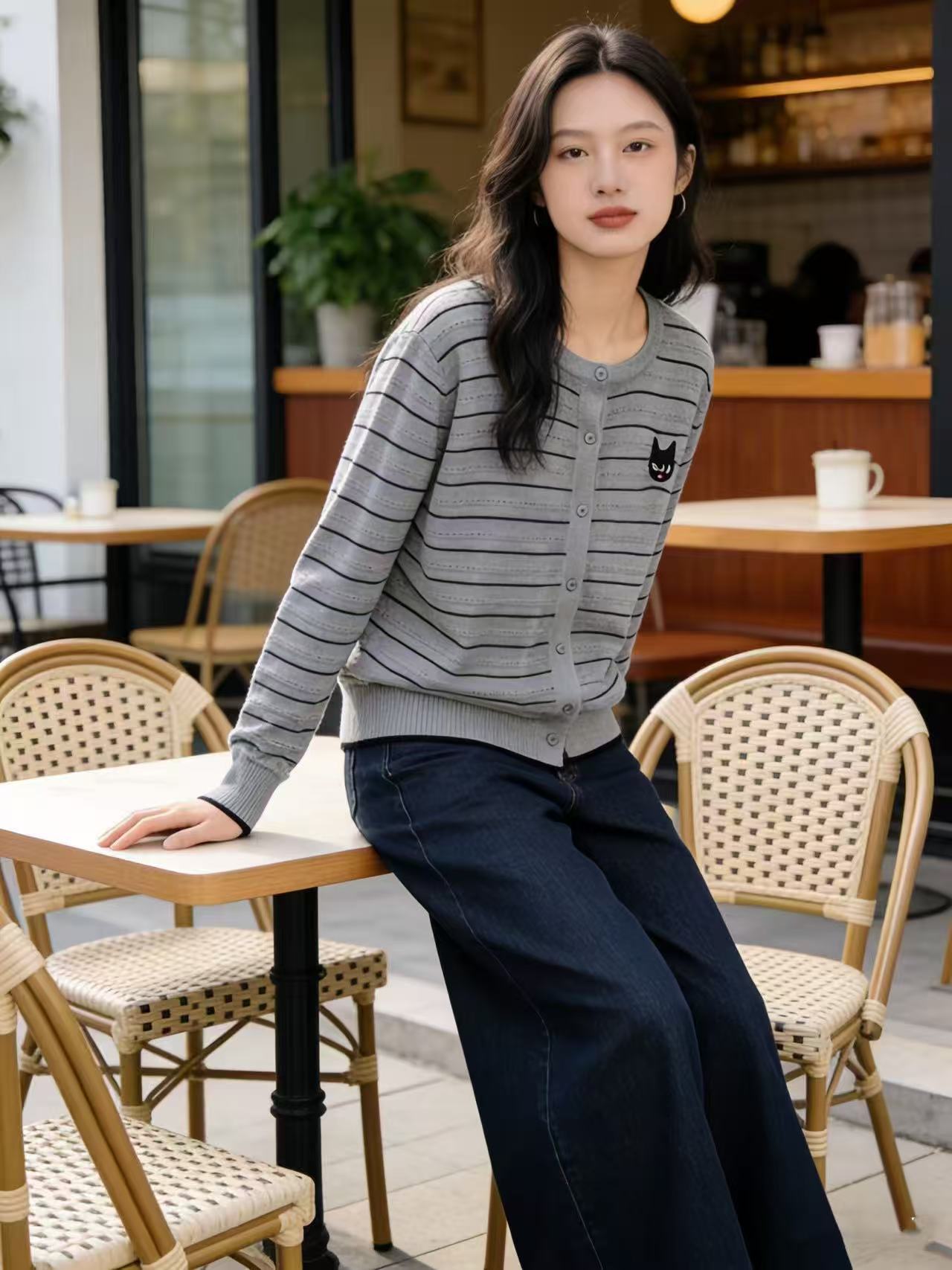 羊毛衫!春薄款!品牌促➡️【自营】衣周期格亿(30%羊毛)6909猫猫刺绣镂空针织条纹羊毛开衫-喜出